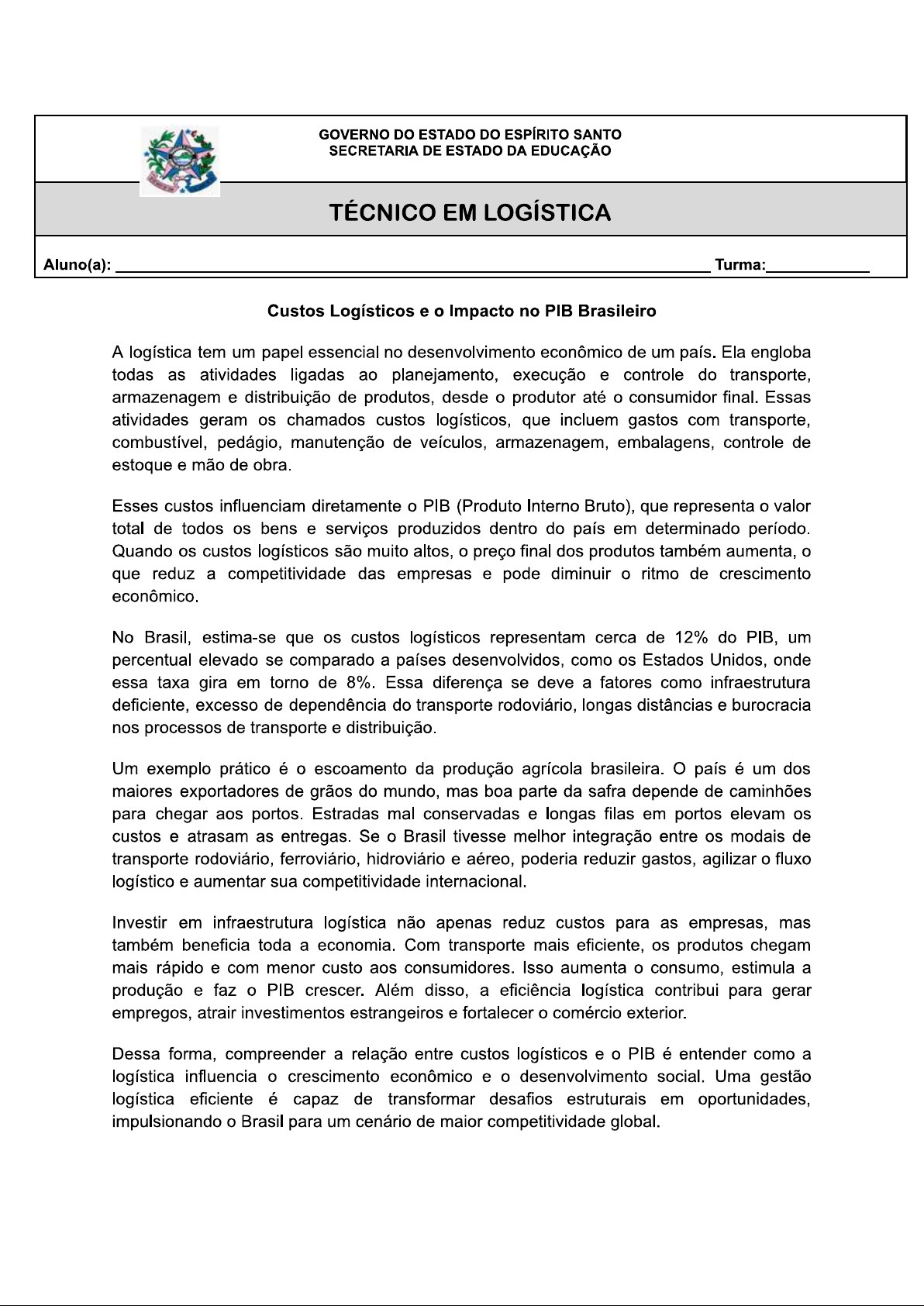 GOVERNO DO ESTADO DO ESPÍRITO SANTO SECRETARIA DE ESTADO DA EDUCAÇÃO TÉCNICO EM LOGÍSTICA Aluno(a): Turma: Custos Logísticos e Impacto no PIB Brasileiro A logística tem um papel essencial no desenvolvimento econômico de um país. Ela engloba todas as atividades ligadas ao planejamento, execução e controle do transporte, armazenagem e distribuição de produtos, desde o produtor até consumidor final. Essas atividades geram os chamados custos logísticos, que incluem gastos com transporte, combustível, pedágio, manutenção de veículos, armazenagem, embalagens, controle de estoque e mão de obra. Esses custos influenciam diretamente o PIB (Produto Interno Bruto), que representa o valor total de todos os bens e serviços produzidos dentro do país em determinado período. Quando os custos logísticos são muito altos, o preço final dos produtos também aumenta, o que reduz a competitividade das empresas e pode diminuir o ritmo de crescimento econômico. No Brasil, estima-se que os custos logísticos representam cerca de 12% do PIB, um percentual elevado se comparado a países desenvolvidos, como os Estados Unidos, onde essa taxa gira em torno de 8%. Essa diferença se deve a fatores como infraestrutura deficiente, excesso de dependência do transporte rodoviário, longas distâncias e burocracia nos processos de transporte e distribuição. Um exemplo prático é escoamento da produção agrícola brasileira. O país é um dos maiores exportadores de grãos do mundo, mas boa parte da safra depende de caminhões para chegar aos portos. Estradas mal conservadas e longas filas em portos elevam os custos e atrasam as entregas. Se o Brasil tivesse melhor integração entre os modais de transporte rodoviário, ferroviário, hidroviário e aéreo, poderia reduzir gastos, agilizar fluxo logístico e aumentar sua competitividade internacional. Investir em infraestrutura logística não apenas reduz custos para as empresas, mas também beneficia toda a economia. Com transporte mais eficiente, os produtos chegam mais rápido e com menor custo aos consumidores. Isso aumenta consumo, estimula a produção e faz o PIB crescer. Além disso, a eficiência logística contribui para gerar empregos, atrair investimentos estrangeiros e fortalecer o comércio exterior. Dessa forma, compreender a relação entre custos logísticos e PIB é entender como a logística influencia o crescimento econômico e o desenvolvimento social. Uma gestão logística eficiente é capaz de transformar desafios estruturais em oportunidades, impulsionando o Brasil para um cenário de maior competitividade global.Questões Discursivas 1 - Explique, com suas palavras, o que são custos logísticos e como eles afetam o PIB de um país. Use exemplos para ilustrar sua resposta. 2 texto mostra que os custos logísticos do Brasil representam cerca de 12% do PIB, enquanto nos Estados Unidos são aproximadamente 8%. Quais fatores explicam essa diferença? Como a infraestrutura e a integração dos modais de transporte influenciam nessa questão? 3 Cite duas medidas que poderiam ser adotadas para reduzir os custos logísticos no Brasil e explicar como elas poderiam contribuir para o crescimento do PIB e da economia em geral. 4- Título: "Minha Rota Logística" Instruções: 1. Imagine que você é o gestor logístico de uma empresa que precisa enviar produtos do interior do Brasil para diferentes cidades. 2. Escolha um produto (como grãos, eletrônicos, roupas, medicamentos). 3. Desenhe ou crie um mapa do trajeto do produto, indicando: Modais de transporte usados (rodoviário, ferroviário, hidroviário ou aéreo) Pontos de armazenamento e distribuição Possíveis obstáculos ou custos (estradas ruins, filas em portos, pedágios, etc.) 4. Escreva uma pequena reflexão (5 a 7 linhas) explicando como suas escolhas logísticas podem: Reduzir os custos Aumentar a eficiência Impactar positivamente o PIB e a economia do país Dica: desenho não precisa ser perfeito; a ideia é pensar estrategicamente e visualizar a logística de forma prática e criativa.