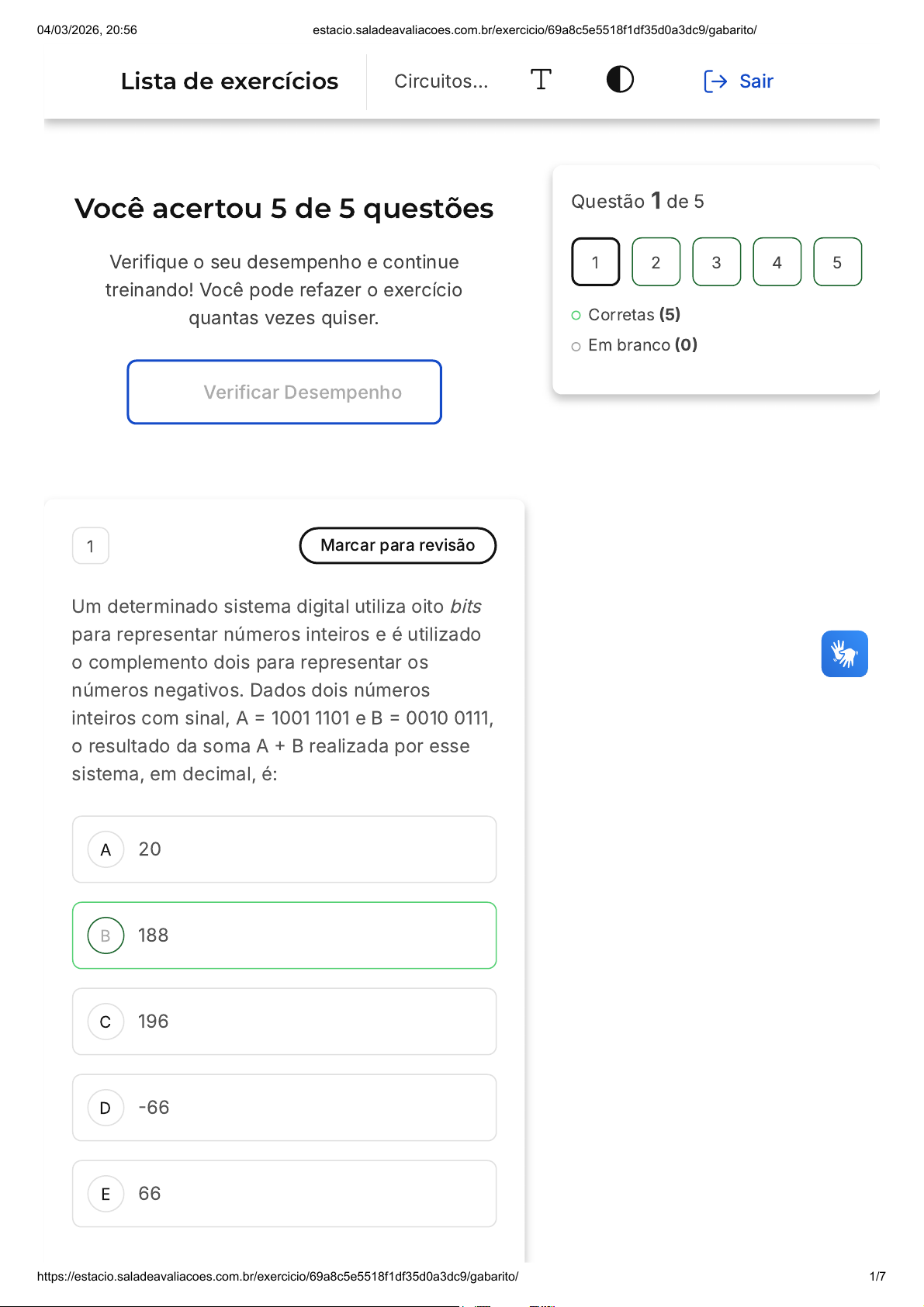 Você acertou 5 de 5 questões Verifique o seu desempenho e continue treinando! Você pode refazer o exercício quantas vezes quiser. Verificar Desempenho A B C D E 1 Marcar para revisão Um determinado sistema digital utiliza oito bits para representar números inteiros e é utilizado o complemento dois para representar os números negativos. Dados dois números inteiros com sinal, A = 1001 1101 e B = 0010 0111, o resultado da soma A + B realizada por esse sistema, em decimal, é: 20 188 196 -66 66 Questão 1 de 5 Corretas (5) Em branco (0) 1 2 3 4 5 Lista de exercícios Circuitos… Sair 04/03/2026, 20:56 estacio.saladeavaliacoes.com.br/exercicio/69a8c5e5518f1df35d0a3dc9/gabarito/ https://estacio.saladeavaliacoes.com.br/exercicio/69a8c5e5518f1df35d0a3dc9/gabarito/ 1/7 A B C Resposta correta Parabéns, você selecionou a alternativa correta. Confira o gabarito comentado! Gabarito Comentado 1 0 0 1 1 1 0 1 + 0 0 1 0 0 1 1 1 _______________ 1 0 1 1 1 1 0 0 A soma dos números binários A e B resulta em 1011 1100. Ao converter esse número binário para decimal, obtemos o valor 188. Portanto, a soma de A e B, em decimal, é 188. 2 Marcar para revisão Um determinado sistema digital utiliza quatro bits para representar números inteiros. Dados dois números inteiros sem sinal, A = 1001 e B = 0111, o resultado da soma A + B realizada por esse sistema, em decimal, é: 16 15 2 04/03/2026, 20:56 estacio.saladeavaliacoes.com.br/exercicio/69a8c5e5518f1df35d0a3dc9/gabarito/ https://estacio.saladeavaliacoes.com.br/exercicio/69a8c5e5518f1df35d0a3dc9/gabarito/ 2/7 D E 0 17 Resposta correta Parabéns, você selecionou a alternativa correta. Confira o gabarito comentado! Gabarito Comentado Os números A e B são representados em binário. A = 1001, que é 9 em decimal, e B = 0111, que é 7 em decimal. A soma de A e B em decimal seria 9 + 7 = 16. No entanto, como o sistema digital em questão utiliza apenas quatro bits para representar números inteiros, o resultado 16 não pode ser representado, pois exigiria um quinto bit. Portanto, ocorre um estouro de bit, e o resultado é 0. 3 Marcar para revisão A expressão da saída do circuito a seguir, F, é: 04/03/2026, 20:56 estacio.saladeavaliacoes.com.br/exercicio/69a8c5e5518f1df35d0a3dc9/gabarito/ https://estacio.saladeavaliacoes.com.br/exercicio/69a8c5e5518f1df35d0a3dc9/gabarito/ 3/7 A B C D E F = ¯̄¯̄ CB ¯̄¯̄ A + CB ¯̄¯̄ A F = C ¯̄¯̄ BA F = ¯̄¯̄ BA F = ¯̄¯̄ C ¯̄¯̄ BA+ CB ¯̄¯̄ A F = C( ¯̄¯̄ B +A) Resposta correta Parabéns, você selecionou a alternativa correta. Confira o gabarito comentado! Gabarito Comentado 04/03/2026, 20:56 estacio.saladeavaliacoes.com.br/exercicio/69a8c5e5518f1df35d0a3dc9/gabarito/ https://estacio.saladeavaliacoes.com.br/exercicio/69a8c5e5518f1df35d0a3dc9/gabarito/ 4/7 A B C D E A resposta correta é: F = ¯̄¯̄ BA 4 Marcar para revisão Um determinado sistema digital utiliza seis bits na representação de números inteiros com sinal. Sabendo que é usado o complemento dois para representar números negativos, o número decimal representado pela sequência 011011 é: -36 -27 -37 37 27 Resposta correta Parabéns, você selecionou a alternativa correta. Confira o gabarito comentado! Gabarito Comentado Na representação binária, o primeiro bit (da esquerda para a direita) indica o sinal do número. Se for 0, o número é positivo; se for 1, o número é negativo. No caso da sequência 011011, o primeiro bit é 0, 04/03/2026, 20:56 estacio.saladeavaliacoes.com.br/exercicio/69a8c5e5518f1df35d0a3dc9/gabarito/ https://estacio.saladeavaliacoes.com.br/exercicio/69a8c5e5518f1df35d0a3dc9/gabarito/ 5/7 A B C indicando que o número é positivo. Os cinco bits restantes representam o número em si. Convertendo 11011 para decimal, obtemos 27. Portanto, a sequência 011011 representa o número decimal 27. 5 Marcar para revisão A figura, a seguir, ilustra um multiplexador de 4 entradas para 1 saída e o mapa de Karnaugh a ser implementado para o sinal W através do circuito. Os sinais S1 e S0 são as entradas de controle do integrado, onde S1 representa o bit mais significativo. O bloco tracejado deverá conter os circuitos que conectarão os sinais de X e Y às entradas do multiplexador. A fim de reproduzir o mapa de Karnaugh, qual é a expressão booleana do circuito que será conectado ao pino IP2? XY X ¯̄¯̄ Y X + Y 04/03/2026, 20:56 estacio.saladeavaliacoes.com.br/exercicio/69a8c5e5518f1df35d0a3dc9/gabarito/ https://estacio.saladeavaliacoes.com.br/exercicio/69a8c5e5518f1df35d0a3dc9/gabarito/ 6/7 D E X ⊕ Y ¯̄¯̄¯̄¯̄¯̄¯̄¯̄¯ X ⊕ Y Resposta correta Parabéns, você selecionou a alternativa correta. Confira o gabarito comentado! Gabarito Comentado A resposta correta é: X ⊕ Y 04/03/2026, 20:56 estacio.saladeavaliacoes.com.br/exercicio/69a8c5e5518f1df35d0a3dc9/gabarito/ https://estacio.saladeavaliacoes.com.br/exercicio/69a8c5e5518f1df35d0a3dc9/gabarito/ 7/7