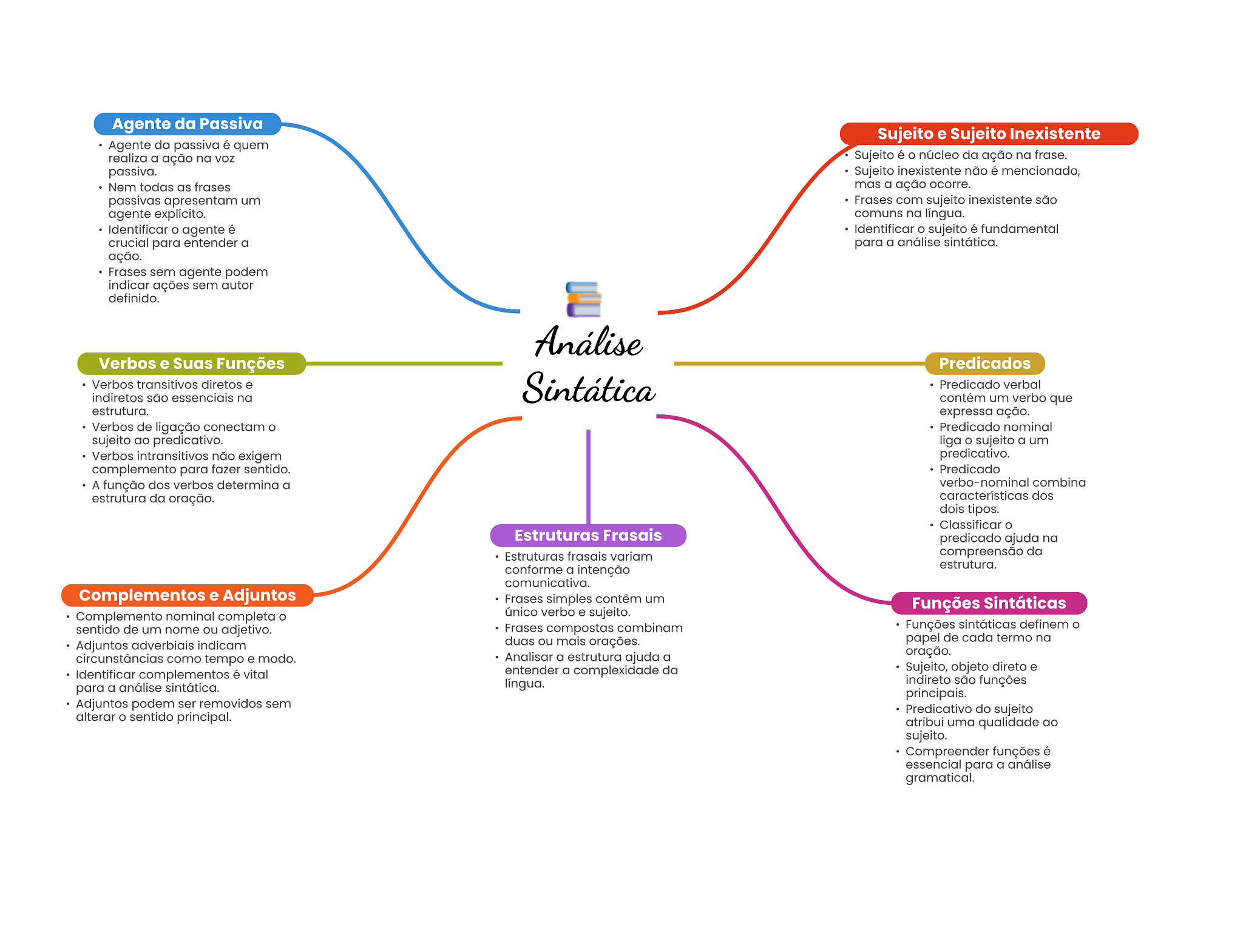 Agente da Passiva Sujeito e Sujeito Inexistente Agente da passiva é quem realiza a ação na Sujeito é o núcleo da ação na frase. passiva. Sujeito inexistente não é mencionado, Nem todas as frases mas a ação ocorre. passivas apresentam um Frases com sujeito inexistente são agente explícito. comuns na língua. Identificar agente é Identificar sujeito é fundamental crucial para entender a para a análise sintática. ação. Frases sem agente podem indicar ações sem autor definido. Análise Verbos e Suas Funções Predicados Verbos transitivos diretos e Sintática Predicado verbal indiretos são essenciais na contém um verbo que estrutura. expressa ação. Verbos de ligação conectam Predicado nominal sujeito ao predicativo. liga sujeito a um Verbos intransitivos não exigem predicativo. complemento para fazer sentido. Predicado A função dos verbos determina a verbo-nominal combina estrutura da oração. características dos dois tipos. Classificar O Estruturas Frasais predicado ajuda na Estruturas frasais variam compreensão da estrutura. conforme a intenção comunicativa. Complementos e Adjuntos Frases simples contêm um Complemento nominal completa único verbo e sujeito. Funções Sintáticas sentido de um nome ou adjetivo. Frases compostas combinam Funções sintáticas definem Adjuntos adverbiais indicam duas ou mais orações. papel de cada termo na Analisar a estrutura ajuda a oração. circunstâncias como tempo e modo. entender a complexidade da Sujeito, objeto direto e Identificar complementos é vital língua. indireto são funções para a análise sintática. principais. Adjuntos podem ser removidos sem Predicativo do sujeito alterar sentido principal. atribui uma qualidade ao sujeito. Compreender funções é essencial para a análise gramatical.