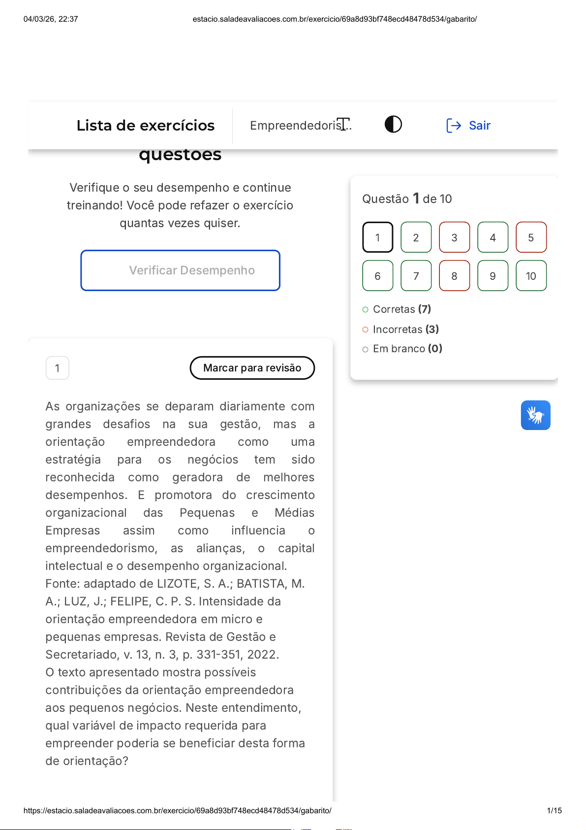 Você acertou 7 de 10 questões Verifique o seu desempenho e continue treinando! Você pode refazer o exercício quantas vezes quiser. Verificar Desempenho 1 Marcar para revisão As organizações se deparam diariamente com grandes desafios na sua gestão, mas a orientação empreendedora como uma estratégia para os negócios tem sido reconhecida como geradora de melhores desempenhos. E promotora do crescimento organizacional das Pequenas e Médias Empresas assim como influencia o empreendedorismo, as alianças, o capital intelectual e o desempenho organizacional. Fonte: adaptado de LIZOTE, S. A.; BATISTA, M. A.; LUZ, J.; FELIPE, C. P. S. Intensidade da orientação empreendedora em micro e pequenas empresas. Revista de Gestão e Secretariado, v. 13, n. 3, p. 331-351, 2022. O texto apresentado mostra possíveis contribuições da orientação empreendedora aos pequenos negócios. Neste entendimento, qual variável de impacto requerida para empreender poderia se beneficiar desta forma de orientação? Questão 1 de 10 Corretas (7) Incorretas (3) Em branco (0) 1 2 3 4 5 6 7 8 9 10 Lista de exercícios Empreendedoris… Sair 04/03/26, 22:37 estacio.saladeavaliacoes.com.br/exercicio/69a8d93bf748ecd48478d534/gabarito/ https://estacio.saladeavaliacoes.com.br/exercicio/69a8d93bf748ecd48478d534/gabarito/ 1/15 A B C D E Estratégia Análise de ambientes interno e externo Planejamento e controle de produção Identificação do mercado-alvo Composto do Marketing Resposta correta Parabéns, você selecionou a alternativa correta. Confira o gabarito comentado! Gabarito Comentado A Estratégia contribui para maior entrega de valor aos clientes, que se beneficiam da orientação empreendedora 2 Marcar para revisão O investimento no empreendedorismo fornece bases sólidas para uma atuação sustentável. Qual seria o diferencial do investidor anjo em relação a outras fontes de investimento? 04/03/26, 22:37 estacio.saladeavaliacoes.com.br/exercicio/69a8d93bf748ecd48478d534/gabarito/ https://estacio.saladeavaliacoes.com.br/exercicio/69a8d93bf748ecd48478d534/gabarito/ 2/15 A B C D E Baixos juros de financiamento Forma de financiamento com grande número de participantes Apoio de organismos governamentais Grande apetite aos eventos de riscos Investimentos feitos por pessoas físicas Resposta correta Parabéns, você selecionou a alternativa correta. Confira o gabarito comentado! Gabarito Comentado O investidor anjo é uma pessoa interessada em realizar seus investimentos de forma personalizada. A interação deste investidor é realizada diretamente com o grupo de empreendedores. Comumente oferece orientações para estruturação do novo negócio 3 Marcar para revisão Há um ponto sensível no mundo contemporâneo que é o esgarçamento de seu tecido social. Por que o empreendedorismo social pode atenuar esta situação? 04/03/26, 22:37 estacio.saladeavaliacoes.com.br/exercicio/69a8d93bf748ecd48478d534/gabarito/ https://estacio.saladeavaliacoes.com.br/exercicio/69a8d93bf748ecd48478d534/gabarito/ 3/15 A B C D E Pela abordagem focada nas relações democráticas Por trazer fonte de renda para todas as camadas sociais Por trazer contribuições para redução das desigualdades sociais Trabalho realizado para compartilhar custos Em função do alto potencial de crescimento do empreendimento Resposta incorreta Opa! A alternativa correta é a letra C. Confira o gabarito comentado! Gabarito Comentado O empreendedorismo social, por atuar diretamente no atendimento de minorias que se encontram excluídas, sob as óticas social, econômica e cultural, é uma forma de empreendedorismo que pode contribuir para reconstrução do tecido social. 4 Marcar para revisão Este estudo identificou as partes interessadas de 26 ONGs registradas no Conselho Municipal dos Direitos da Criança e do Adolescente (COMDICA) da cidade de Passo Fundo (RS), para estabelecer o grau de dependência entre 04/03/26, 22:37 estacio.saladeavaliacoes.com.br/exercicio/69a8d93bf748ecd48478d534/gabarito/ https://estacio.saladeavaliacoes.com.br/exercicio/69a8d93bf748ecd48478d534/gabarito/ 4/15 A B C D E todas as partes interessadas. O grau de dependência das ONGs em relação às partes interessadas revelou-se elevado, algumas das quais podem ser consideradas chaves, ou seja, aquelas que podem contribuir significativamente e oferecer propostas estratégicas se os gestores reconhecerem sua relevância e realizarem investimento nelas. Fonte: adaptado de ANESE, V.; COSTA, C.; GALLON, S.; ROSSETTO, C. R. Stakeholders' Management Capacity In Brazilian Nonprofit Organizations. Revista Gestão & Planejamento, v. 22, n. 1, p. 87-103, 2021. De acordo com o texto apresentado, as partes interessadas apresentam graus de dependência e importância em relação a outras partes. Assinale a alternativa de maior relevância na identificação das partes interessadas Melhoria na alocação financeira Atendimento de necessidades e expectativas das partes interessadas Processo de comunicação mais eficiente Tratamento equitativo das partes interessadas Melhor gerenciamento de riscos Resposta correta Parabéns, você selecionou a alternativa correta. Confira o gabarito comentado! 04/03/26, 22:37 estacio.saladeavaliacoes.com.br/exercicio/69a8d93bf748ecd48478d534/gabarito/ https://estacio.saladeavaliacoes.com.br/exercicio/69a8d93bf748ecd48478d534/gabarito/ 5/15 A B Gabarito Comentado O atendimento de necessidades e expectativas das partes interessadas é a principal motivação de um processo eficaz de identificação. Todas as demais alternativas são consequências desta motivação inicial 5 Marcar para revisão Partes interessadas no empreendedorismo podem ser identificados como indivíduos ou grupos que têm um interesse ou são de alguma forma afetados pelas atividades e decisões de uma organização. Isso inclui acionistas, funcionários, clientes, fornecedores, a comunidade local e o governo, entre outros. Um empreendedor de sucesso deve ser capaz de geri