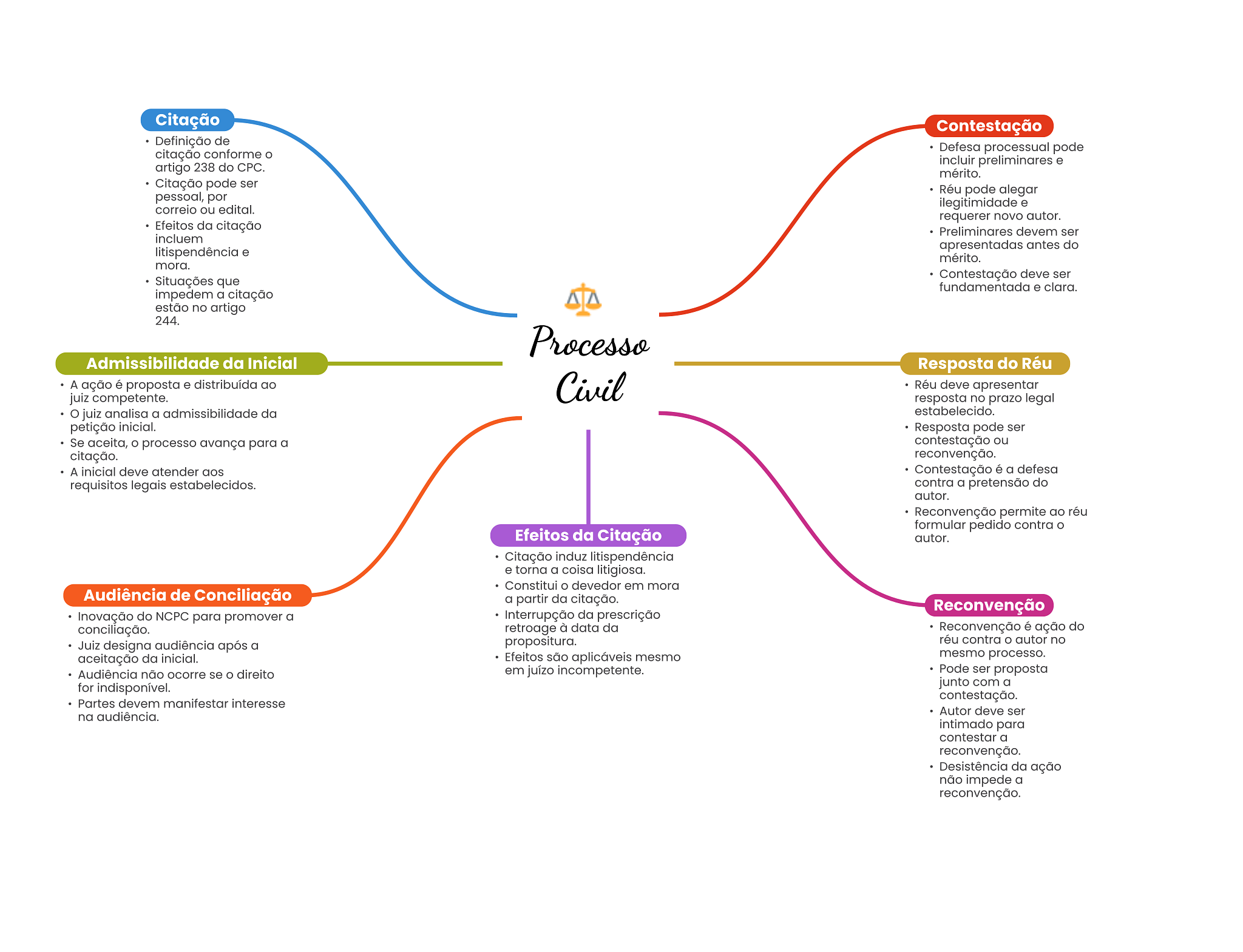 Citação Contestação Definição de citação conforme Defesa processual pode incluir preliminares e artigo 238 do CPC. mérito. Citação pode ser Réu pode alegar pessoal, por correio ou edital. ilegitimidade e requerer novo autor. Efeitos da citação Preliminares devem ser incluem apresentadas antes do litispendência e mérito. mora. Contestação deve ser Situações que fundamentada e clara. impedem a citação estão no artigo 244. Processo Admissibilidade da Inicial Resposta do Réu A ação é proposta e distribuída ao juiz competente. Civil Réu deve apresentar resposta no prazo legal juiz analisa a admissibilidade da estabelecido. petição inicial. Resposta pode ser Se aceita, processo avança para a contestação ou citação. reconvenção. A inicial deve atender aos Contestação é a defesa requisitos legais estabelecidos. contra a pretensão do autor. Reconvenção permite ao réu formular pedido contra Efeitos da Citação autor. Citação induz litispendência e torna a coisa litigiosa. Constitui devedor em mora Audiência de Conciliação a partir da citação. Reconvenção Inovação do NCPC para promover a Interrupção da prescrição conciliação. retroage à data da Reconvenção é ação do propositura. réu contra O autor no Juiz designa audiência após a aceitação da inicial. Efeitos são aplicáveis mesmo mesmo processo. Audiência não ocorre se direito em juízo incompetente. Pode ser proposta for indisponível. junto com a contestação. Partes devem manifestar interesse Autor deve ser na audiência. intimado para contestar a reconvenção. Desistência da ação não impede a reconvenção.
