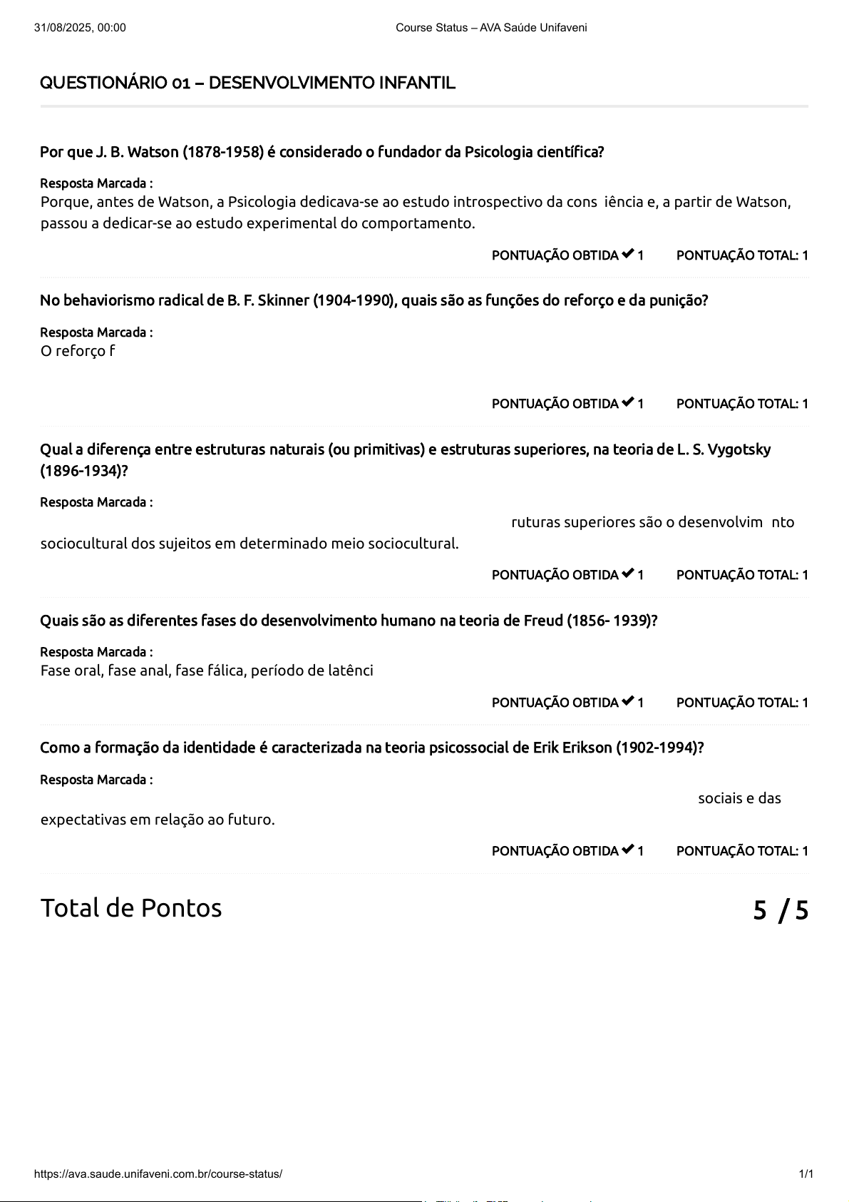 5 / 5 QUESTIONÁRIO 01 – DESENVOLVIMENTO INFANTIL PONTUAÇÃO TOTAL: 1PONTUAÇÃO OBTIDA 1 Por que J. B. Watson (1878-1958) é considerado o fundador da Psicologia científica? Resposta Marcada : Porque, antes de Watson, a Psicologia dedicava-se ao estudo introspectivo da consciência e, a partir de Watson, passou a dedicar-se ao estudo experimental do comportamento. PONTUAÇÃO TOTAL: 1PONTUAÇÃO OBTIDA 1 No behaviorismo radical de B. F. Skinner (1904-1990), quais são as funções do reforço e da punição? Resposta Marcada : O reforço fortalece o comportamento que o precede e a punição fortalece a remoção do comportamento que o precede. PONTUAÇÃO TOTAL: 1PONTUAÇÃO OBTIDA 1 Qual a diferença entre estruturas naturais (ou primitivas) e estruturas superiores, na teoria de L. S. Vygotsky (1896-1934)? Resposta Marcada : As estruturas naturais são a maturação biológica do organismo; as estruturas superiores são o desenvolvimento sociocultural dos sujeitos em determinado meio sociocultural. PONTUAÇÃO TOTAL: 1PONTUAÇÃO OBTIDA 1 Quais são as diferentes fases do desenvolvimento humano na teoria de Freud (1856- 1939)? Resposta Marcada : Fase oral, fase anal, fase fálica, período de latência e fase genital. PONTUAÇÃO TOTAL: 1PONTUAÇÃO OBTIDA 1 Como a formação da identidade é caracterizada na teoria psicossocial de Erik Erikson (1902-1994)? Resposta Marcada : A formação da identidade é um processo integrador das transformações pessoais, das exigências sociais e das expectativas em relação ao futuro. Total de Pontos 31/08/2025, 00:00 Course Status – AVA Saúde Unifaveni https://ava.saude.unifaveni.com.br/course-status/ 1/1