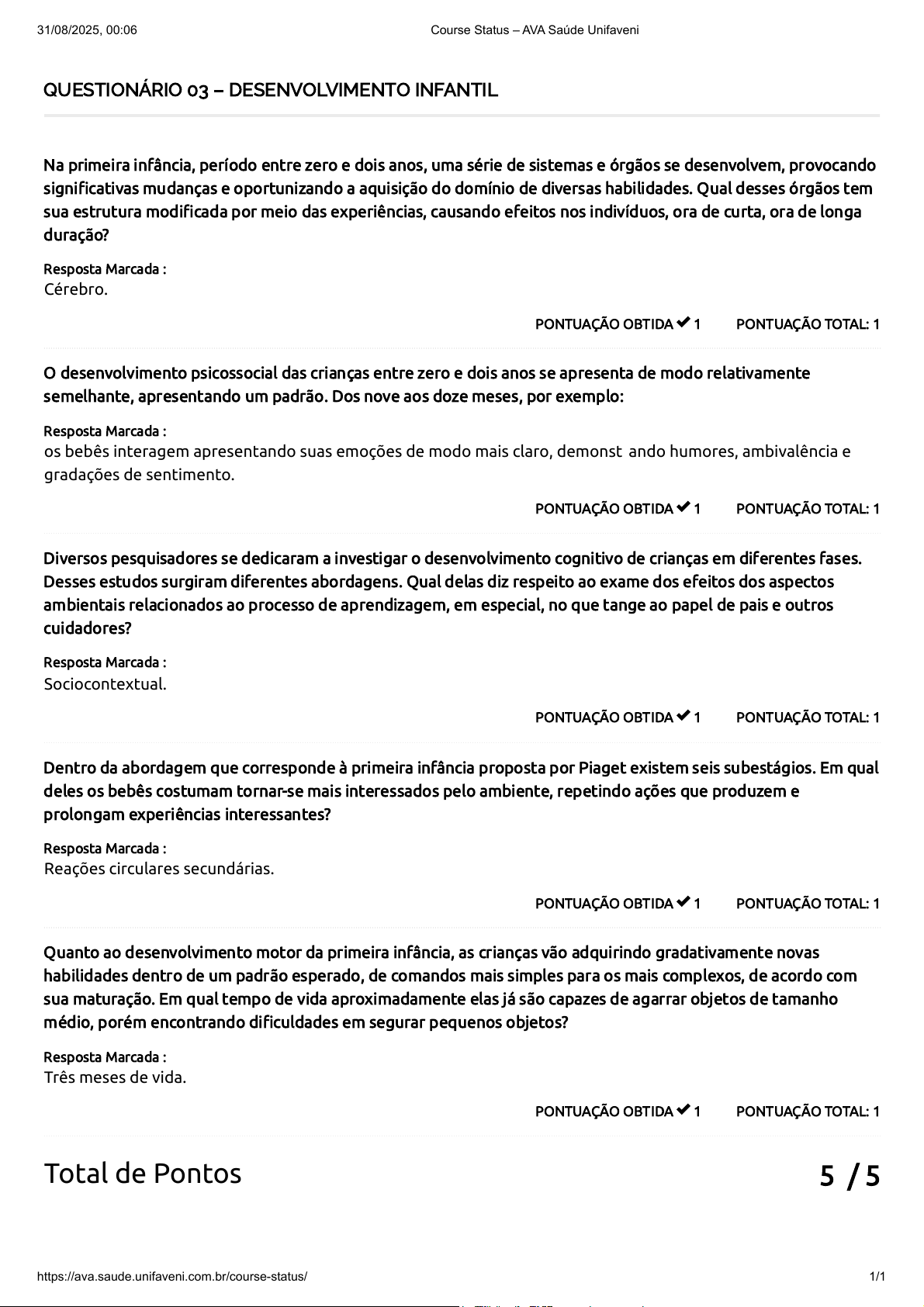 5 / 5 QUESTIONÁRIO 03 – DESENVOLVIMENTO INFANTIL PONTUAÇÃO TOTAL: 1PONTUAÇÃO OBTIDA 1 Na primeira infância, período entre zero e dois anos, uma série de sistemas e órgãos se desenvolvem, provocando significativas mudanças e oportunizando a aquisição do domínio de diversas habilidades. Qual desses órgãos tem sua estrutura modificada por meio das experiências, causando efeitos nos indivíduos, ora de curta, ora de longa duração? Resposta Marcada : Cérebro. PONTUAÇÃO TOTAL: 1PONTUAÇÃO OBTIDA 1 O desenvolvimento psicossocial das crianças entre zero e dois anos se apresenta de modo relativamente semelhante, apresentando um padrão. Dos nove aos doze meses, por exemplo: Resposta Marcada : os bebês interagem apresentando suas emoções de modo mais claro, demonstrando humores, ambivalência e gradações de sentimento. PONTUAÇÃO TOTAL: 1PONTUAÇÃO OBTIDA 1 Diversos pesquisadores se dedicaram a investigar o desenvolvimento cognitivo de crianças em diferentes fases. Desses estudos surgiram diferentes abordagens. Qual delas diz respeito ao exame dos efeitos dos aspectos ambientais relacionados ao processo de aprendizagem, em especial, no que tange ao papel de pais e outros cuidadores? Resposta Marcada : Sociocontextual. PONTUAÇÃO TOTAL: 1PONTUAÇÃO OBTIDA 1 Dentro da abordagem que corresponde à primeira infância proposta por Piaget existem seis subestágios. Em qual deles os bebês costumam tornar-se mais interessados pelo ambiente, repetindo ações que produzem e prolongam experiências interessantes? Resposta Marcada : Reações circulares secundárias. PONTUAÇÃO TOTAL: 1PONTUAÇÃO OBTIDA 1 Quanto ao desenvolvimento motor da primeira infância, as crianças vão adquirindo gradativamente novas habilidades dentro de um padrão esperado, de comandos mais simples para os mais complexos, de acordo com sua maturação. Em qual tempo de vida aproximadamente elas já são capazes de agarrar objetos de tamanho médio, porém encontrando dificuldades em segurar pequenos objetos? Resposta Marcada : Três meses de vida. Total de Pontos 31/08/2025, 00:06 Course Status – AVA Saúde Unifaveni https://ava.saude.unifaveni.com.br/course-status/ 1/1
