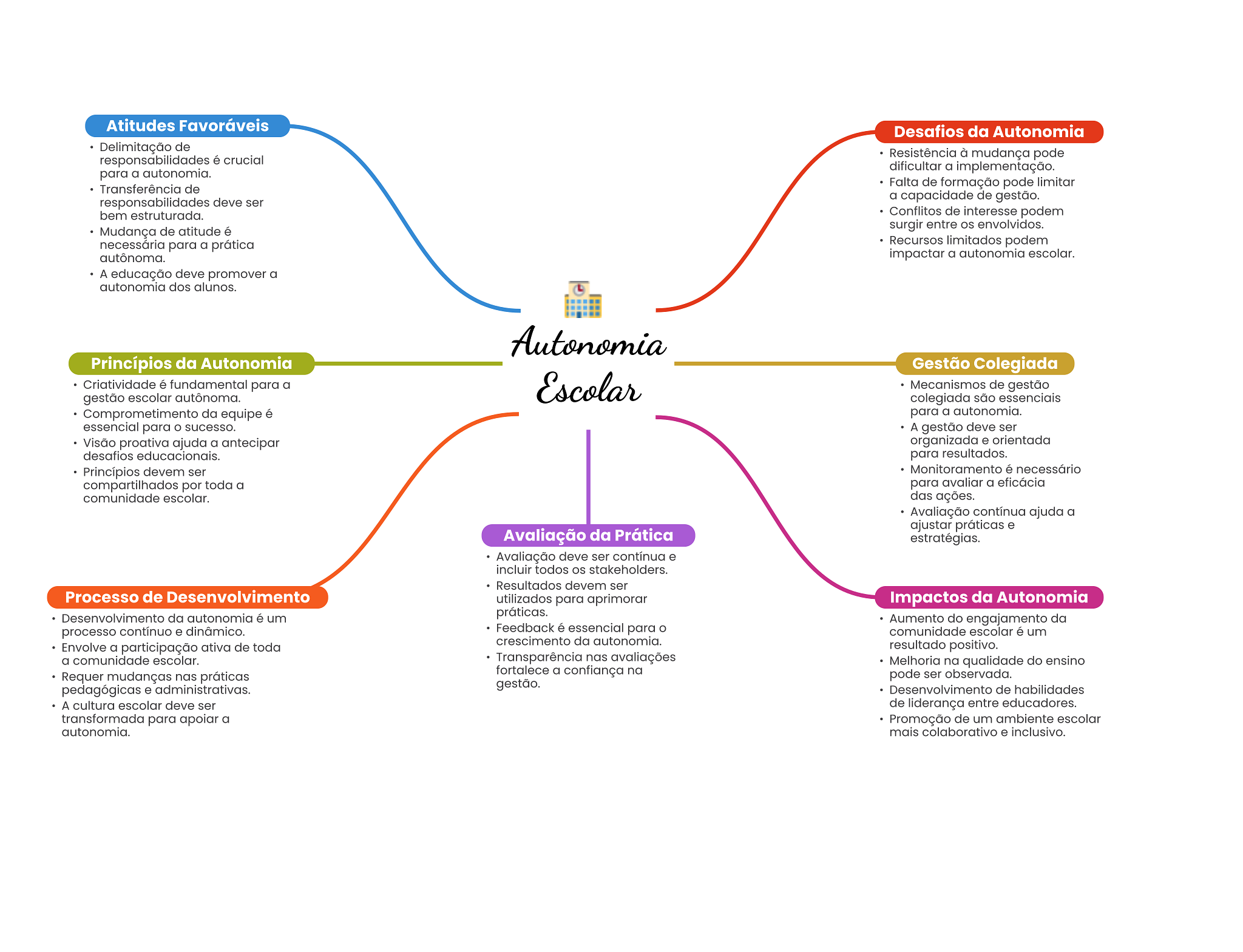 Atitudes Favoráveis Desafios da Autonomia Delimitação de Resistência à mudança pode responsabilidades é crucial dificultar a implementação. para a autonomia. Transferência de Falta de formação pode limitar responsabilidades deve ser a capacidade de gestão. bem estruturada. Conflitos de interesse podem Mudança de atitude é surgir entre envolvidos. necessária para a prática Recursos limitados podem autônoma. impactar a autonomia escolar. A educação deve promover a autonomia dos alunos. Autonomia Princípios da Autonomia Gestão Colegiada Criatividade é fundamental para a gestão escolar autônoma. Escolar Mecanismos de gestão colegiada são essenciais Comprometimento da equipe é para a autonomia. essencial para sucesso. A gestão deve ser Visão proativa ajuda a antecipar organizada e orientada desafios educacionais. para resultados. Princípios devem ser Monitoramento é necessário compartilhados por toda a para avaliar a eficácia comunidade escolar. das ações. Avaliação contínua ajuda a ajustar práticas e Avaliação da Prática estratégias. Avaliação deve ser contínua e incluir todos stakeholders. Resultados devem ser Processo de Desenvolvimento utilizados para aprimorar Impactos da Autonomia Desenvolvimento da autonomia é um práticas. Aumento do engajamento da processo contínuo e dinâmico. Feedback é essencial para comunidade escolar é um crescimento da autonomia. Envolve a participação ativa de toda resultado positivo. a comunidade escolar. Transparência nas avaliações Melhoria na qualidade do ensino Requer mudanças nas práticas fortalece a confiança na pode ser observada. pedagógicas e administrativas. gestão. Desenvolvimento de habilidades A cultura escolar deve ser de liderança entre educadores. transformada para apoiar a Promoção de um ambiente escolar autonomia. mais colaborativo e inclusivo.