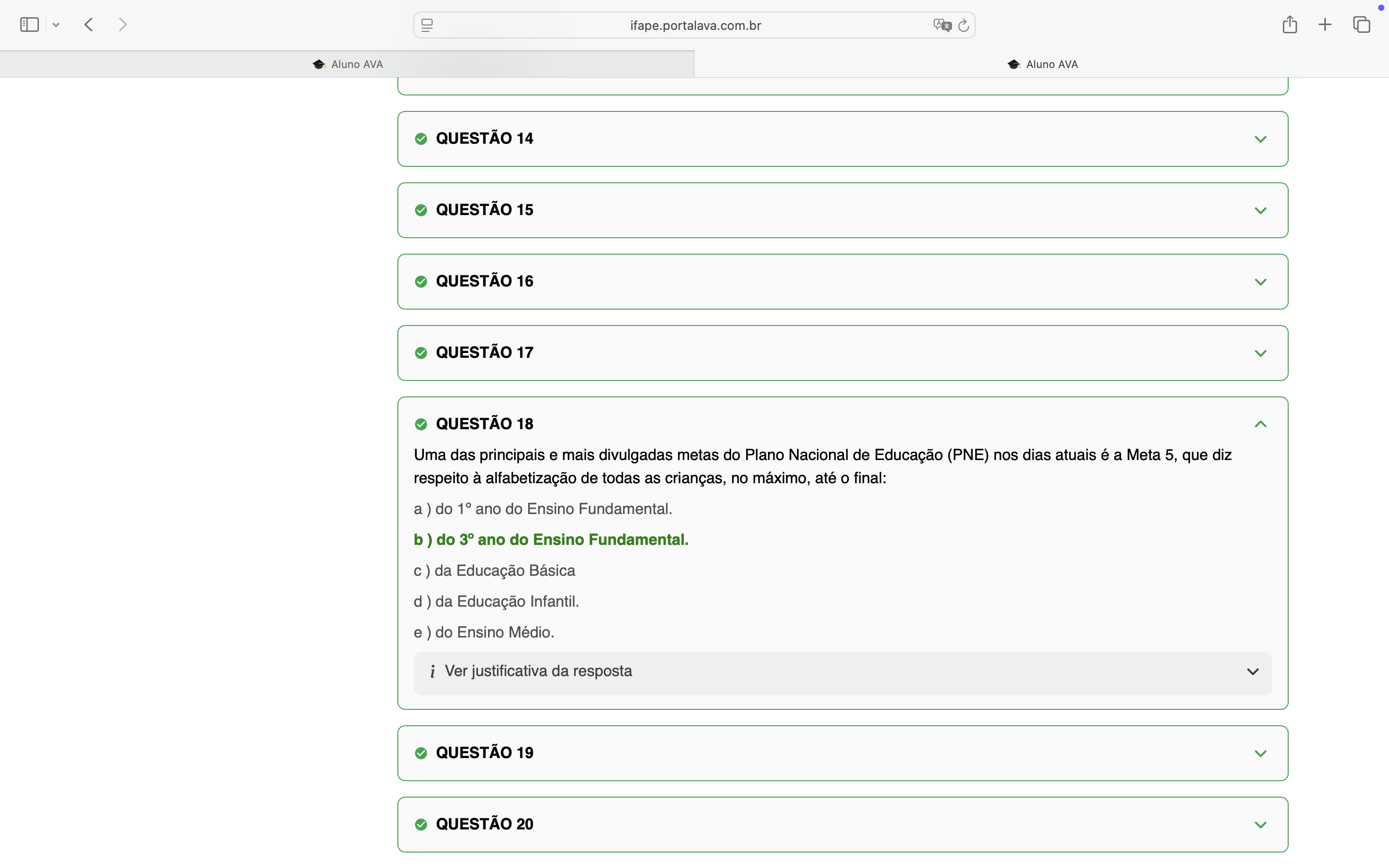 ifape.portalava.com.br + Aluno AVA Aluno AVA QUESTÃO 14 QUESTÃO 15 QUESTÃO 16 QUESTÃO 17 QUESTÃO 18 Uma das principais e mais divulgadas metas do Plano Nacional de Educação (PNE) nos dias atuais é a Meta 5, que diz respeito à alfabetização de todas as crianças, no máximo, até o final: a) do 1° ano do Ensino Fundamental. b) do 3° ano do Ensino Fundamental. c) da Educação Básica d) da Educação Infantil. e) do Ensino Médio. i Ver justificativa da resposta QUESTÃO 19 QUESTÃO 20
