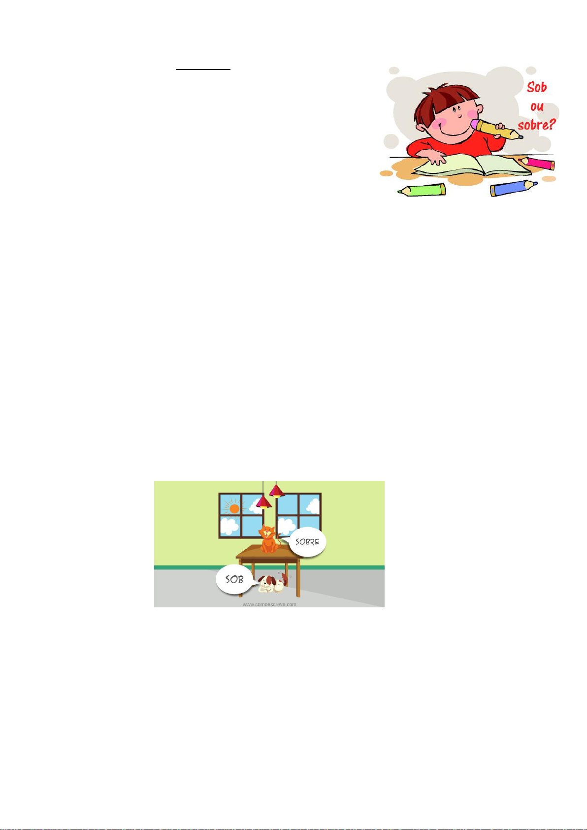 AULA DE LÍNGUA PORTUGUESA – DIA 04/11/2020. ATIVIDADES 1) Complete com SOBRE (em cima) ou SOB (embaixo): a) Deixei o caderno __________________ a mesa da professora. b) O chinelo estava perdido _____________ o sofá. c) Faltava apenas colocar o bolo de aniversário _____________ a mesa. d) A chaleira estava quente porque estava ______________ o fogão. e) O garfo caiu no chão e ficou _____________ a mesa. f) ___________ a jaqueta grossa, o aluno colocou a camiseta de aula. g) O lençol estava _____________ o grosso cobertor. h) Aquela grama verdinha _______________ a terra formava uma paisagem belíssima, que encantava meus olhos! i) O tatu entrou na toca e se escondeu ______________ a terra. j) Lindas almofadas foram colocadas ___________________ o lindo e novosofá da sala! 2) Escreva uma pequena história a partir da figura abaixo, utilizando SOBRE ou SOB: _______________________________________________________________________________________________ _______________________________________________________________________________________________ _______________________________________________________________________________________________ _______________________________________________________________________________________________ _______________________________________________________________________________________________ _______________________________________________________________________________________________ _______________________________________________________________________________________________ _______________________________________________________________________________________________ _______________________________________________________________________________________________ _______________________________________________________________________________________________