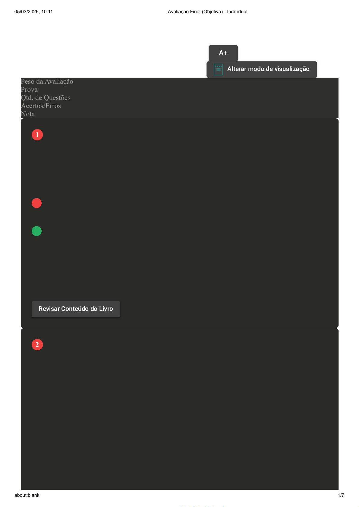 Prova Impressa GABARITO | Avaliação Final (Objetiva) - Individual (Cod.:1522937) Peso da Avaliação 4,00 Prova 105979714 Qtd. de Questões 10 Acertos/Erros 4/6 Nota 4,00 [Laboratório Virtual – Solubilidade e Insaturação em Lipídeos] – Os lipídeos ou triacilgliceróis são popularmente conhecidos como óleos e gorduras. Dessa forma, esse experimento tem o objetivo de identificar e verificar a solubilidade de lipídios em diferentes meios e entender a diferença entre ácidos graxos saturados e insaturados. Neste sentido, analise as afirmativas a seguir e assinale aquela que NÃO corresponde a um substrato utilizado no experimento: A Gordura Animal. B Margarina. C Manteiga. D Óleo vegetal. A biossíntese de nucleotídeos é um processo crucial para a síntese de blocos de construção essenciais do DNA e do RNA. Ocorrendo tanto em vias de novo quanto por meio de reciclagem, esse processo envolve diversas etapas, incluindo a formação de bases nitrogenadas, açúcares fosfatados e a ligação desses componentes para criar os nucleotídeos completos. Além de servirem como blocos de construção genéticos, os nucleotídeos também desempenham funções cruciais no metabolismo energético e em várias vias de sinalização celular, sendo essencial para a manutenção da integridade genética e para uma variedade de processos biológicos vitais. Fonte: adaptado de: NELSON, D. L.; COX, M. M. Princípios de bioquímica. 6. ed. Porto Alegre: Artmed, 2014. Com base nas informações apresentadas, avalie as asserções a seguir e a relação proposta entre elas: I. A deficiência de vitamina B pode levar a uma diminuição na produção de nucleotídeos de timina. PORQUE VOLTAR A+Aumentar, Fonte Alterar modo de visualização 1 Revisar Conteúdo do Livro 2 05/03/2026, 10:11 Avaliação Final (Objetiva) - Individual about:blank 1/7 II. O tetra-hidrofolato de metileno é necessário como cofator na conversão de dCDP em dTDP e atua como doadora de grupo metil na formação de nucleotídeos. A respeito dessas asserções, assinale a opção correta: A As asserções I e II são verdadeiras, e a II é uma justificativa correta da I. B A asserção I é uma proposição verdadeira, e a II é uma proposição falsa. C A asserção I é uma proposição falsa, e a II é uma proposição verdadeira. D As asserções I e II são verdadeiras, mas a II não é uma justificativa correta da I. Uma volta completa do Ciclo de Krebs é crucial para a produção de energia nas células. Durante cada ciclo, o acetil-CoA é convertido em duas moléculas de dióxido de carbono, e a energia é armazenada na forma de NADH, FADH2 e ATP. O NADH e FADH2 gerados serão utilizados na cadeia de transporte de elétrons para produzir ainda mais ATP, a principal moeda energética da célula. Além disso, o ciclo regenera o oxaloacetato, permitindo que o ciclo continue e sustente a produção de energia. A respeito da produção de compostos em uma volta do ciclo de Krebs, assinale a alternativa correta. A Uma molécula de CO2, quatro moléculas de NADH, uma molécula de GTP e duas moléculas de FADH2 B Duas moléculas de CO2, três moléculas de NADH, uma molécula de GTP e uma molécula de FADH2. C Quatro moléculas de CO2, três moléculas de NADH, uma molécula de GTP e uma molécula de FADH2. D Três moléculas de CO2, três moléculas de NADH, duas moléculas de GTP e quatro moléculas de FADH2. Revisar Conteúdo do Livro 3 05/03/2026, 10:11 Avaliação Final (Objetiva) - Individual about:blank 2/7 [...] Para desenvolver um estudo nacional com ampla abrangência em diversidade genética, o Ministério da Saúde propôs a criação do projeto Genomas Brasil, uma grande iniciativa que pretende sequenciar o DNA de 100 mil brasileiros, de todas as regiões, entre grupos de pacientes com doenças raras e coortes populacionais. Para aumentar a capacidade diagnóstica, foi desenvolvido o projeto Genomas Raros, que pretende fazer o sequenciamento genômico completo de indivíduos com doenças raras, incluindo as síndromes de risco hereditário de câncer. Fonte: adaptado de: ROCHA, L. Projeto de sequenciamento genômico busca otimizar diagnóstico de doenças raras. CNN Brasil, 2023. Disponível em: https://www.cnnbrasil.com.br/saude/projeto-de- sequenciamento-genomico-busca-otimizar-diagnostico-de-doencas-raras/. Acesso em: 12 jul. 2023. Considerando o sequenciamento genômico, assinale a alternativa correta: A Todas as doenças raras são identificadas nos dias de hoje pelo sequenciamento genético. B São obtidas poucas informações acerca de características biológicas do indivíduo, excluindo características físicas. C O sequenciamento genômico é a técnica que identifica, de forma aleatória, as informações genéticas contidas no DNA de um organismo. D O sequenciamento genético pode apontar alterações nos genes, predizendo o risco de algumas doenças, principalmente em casos de histórico familiar. [Laboratório Virtual – Ácidos Nucleicos: Extração do DNA do Morango] – O experimento de extração do DNA do morango é relativamente simples, sendo utilizados reagentes bastante comuns no nosso cotidiano. Nesse contexto, quais os reagentes que foram adicionados no béquer junto ao morango macerado? A Bicarbonato de sódio, água morna e etanol. B Cloreto de sódio, etanol e água gelada. C Bicarbonato de sódio, detergente e água fria. D Cloreto de sódio, detergente e água morna. 4 5 05/03/2026, 10:11 Avaliação Final (Objetiva) - Individual about:blank 3/7 https://www.cnnbrasil.com.br/saude/projeto-de-sequenciamento-genomico-busca-otimizar-diagnostico-de-doencas-raras/ https://www.cnnbrasil.com.br/saude/projeto-de-sequenciamento-genomico-busca-otimizar-diagnostico-de-doencas-raras/ Articulações inchadas e doloridas, principalmente no dedão, tornozelos ou joelhos, podem ser resultado de um aumento na quantidade de ácido úrico no organismo. Produzido naturalmente pelo corpo, o ácido é u