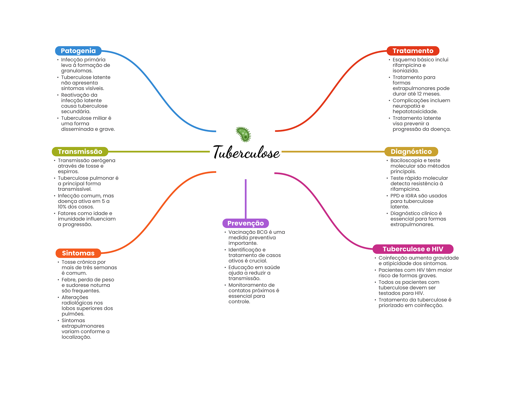 Patogenia Tratamento Infecção primária Esquema básico inclui leva à formação de rifampicina e granulomas. isoniazida. Tuberculose latente Tratamento para não apresenta formas sintomas visíveis. extrapulmonares pode Reativação da durar até 12 meses. infecção latente Complicações incluem causa tuberculose neuropatia e secundária. hepatotoxicidade. Tuberculose miliar é Tratamento latente uma forma visa prevenir a disseminada e grave. progressão da doença. Transmissão Tuberculose Diagnóstico Transmissão aerógena Baciloscopia e teste através de tosse e molecular são métodos espirros. principais. Tuberculose pulmonar é Teste rápido molecular a principal forma detecta resistência à transmissível. rifampicina. Infecção comum, mas PPD e IGRA são usados doença ativa em 5 a para tuberculose 10% dos casos. latente. Fatores como idade e Diagnóstico clínico é imunidade influenciam essencial para formas a progressão. Prevenção extrapulmonares. Vacinação BCG é uma medida preventiva importante. Identificação e Tuberculose e HIV Sintomas tratamento de casos Tosse crônica por ativos é crucial. Coinfecção aumenta gravidade e atipicidade dos sintomas. mais de três semanas Educação em saúde Pacientes com HIV têm maior é comum. ajuda a reduzir a transmissão. risco de formas graves. Febre, perda de peso e sudorese noturna Monitoramento de Todos OS pacientes com tuberculose devem ser são frequentes. contatos próximos é Alterações essencial para testados para HIV. radiológicas nos controle. Tratamento da tuberculose é lobos superiores dos priorizado em coinfecção. pulmões. Sintomas extrapulmonares variam conforme a localização.