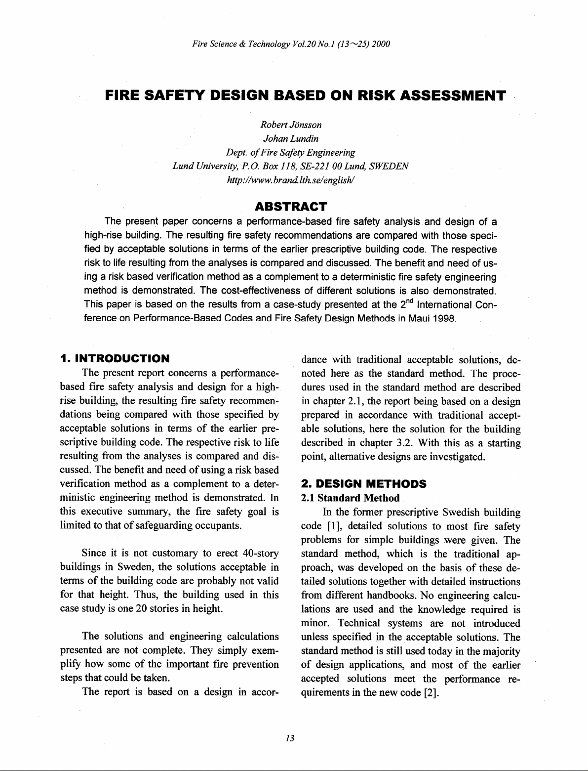Fire Science & Technology Vol.20 No. 1 (13~25) 2000 FIRE SAFETY DESIGN BASED ON RISK ASSESSMENT Robert Jönsson Johan Lundin Dept. of Fire Safety Engineering Lund University, P.O. Box 118, SE-221 00 Lund, SWEDEN http://www.brand.lth.se/english/ ABSTRACT The present paper concerns a performance-based fire safety analysis and design of a high-rise building. The resulting fire safety recommendations are compared with those speci- fied by acceptable solutions in terms of the earlier prescriptive building code. The respective risk to life resulting from the analyses is compared and discussed. The benefit and need of us- ing a risk based verification method as a complement to a deterministic fire safety engineering method is demonstrated. The cost-effectiveness of different solutions is also demonstrated. This paper is based on the results from a case-study presented at the International Con- ference on Performance-Based Codes and Fire Safety Design Methods in Maui 1998. 1. INTRODUCTION dance with traditional acceptable solutions, de- The present report concerns a performance- noted here as the standard method. The proce- based fire safety analysis and design for a high- dures used in the standard method are described rise building, the resulting fire safety recommen- in chapter 2.1, the report being based on a design dations being compared with those specified by prepared in accordance with traditional accept- acceptable solutions in terms of the earlier pre- able solutions, here the solution for the building scriptive building code. The respective risk to life described in chapter 3.2. With this as a starting resulting from the analyses is compared and dis- point, alternative designs are investigated. cussed. The benefit and need of using a risk based verification method as a complement to a deter- 2. DESIGN METHODS ministic engineering method is demonstrated. In 2.1 Standard Method this executive summary, the fire safety goal is In the former prescriptive Swedish building limited to that of safeguarding occupants. code [1], detailed solutions to most fire safety problems for simple buildings were given. The Since it is not customary to erect 40-story standard method, which is the traditional ap- buildings in Sweden, the solutions acceptable in proach, was developed on the basis of these de- terms of the building code are probably not valid tailed solutions together with detailed instructions for that height. Thus, the building used in this from different handbooks. No engineering calcu- case study is one 20 stories in height. lations are used and the knowledge required is minor. Technical systems are not introduced The solutions and engineering calculations unless specified in the acceptable solutions. The presented are not complete. They simply exem- standard method is still used today in the majority plify how some of the important fire prevention of design applications, and most of the earlier steps that could be taken. accepted solutions meet the performance re- The report is based on a design in accor- quirements in the new code [2]. 13R.Jönsson, J.Lundin The standard method is based on the follow- on a long tradition in Sweden, might appear to ing assumptions: be low. If an automatic sprinkler system is in- stalled or if the fire brigade can put out the fire The action of the fire brigade would generally within 60 minutes, the highest requirement is be expected within the normal attendance time 90 minutes (R90) independent of the fire load (10 minutes). If not, improvements in fire density. safety are sometimes needed. 2.2 Alternative standard method The threat of fire spreading to neighbouring These alternatives can be found in hand- buildings is taken care of by safe distances, books and are widely accepted. In this method fire brigade interaction and specified load alternative solutions involving use of various bearing capacity. technical systems are presented and are applied. If a technical system is introduced as a trade-off, it Safe evacuation is primarily achieved by re- should have the same safety goal, since the origi- quiring at least two independent escape routes, nal solution and the overall safety level need to be and by fire compartmentation limiting the maintained. In some trade-offs seen as acceptable, travel distances to and within the escape routes. however, this is not always the case. Some trade- Sometimes, one escape route is enough, al- offs, in fact, are made without any justification though the escape route must then be con- being given. Another matter to consider is that the structed with higher fire safety. In buildings two systems compared should have the same or- where the fire brigade's ladder equipment can der of reliability. Normally, no consideration is be used, windows can sometimes be consid- given to this fact. This leads to there in effect be- ered escape routes. ing different safety levels. Sometimes, simple engineering calculations are used to demonstrate The design of the required exit widths is done the relative safety in comparing different solu- according to prescribed occupant loads and tions. from the assumption that 150 persons calls for 1 meter clear door width. The case in which 2.3 Engineering methods one escape route is blocked should also be 2.3.1 General conditions and assumptions considered. A 1 meter width is needed then for The model used to describe the conse- 300 persons. quences of efforts to exit from rooms in which there is fire involves comparing the time available Buildings taller than 20 to 25 floors are usu- for evacuation with the time evacuation itself ally not built in Sweden, not being a part of would take. This model is widely used and can be our building tradition. This is an important found in many handbooks. The following rela- limitation to the use of the standard method. tionship can be said to hold: Sprinkler systems are traditionally not used, M = tcritical - tevacuation but are gradually being used more often