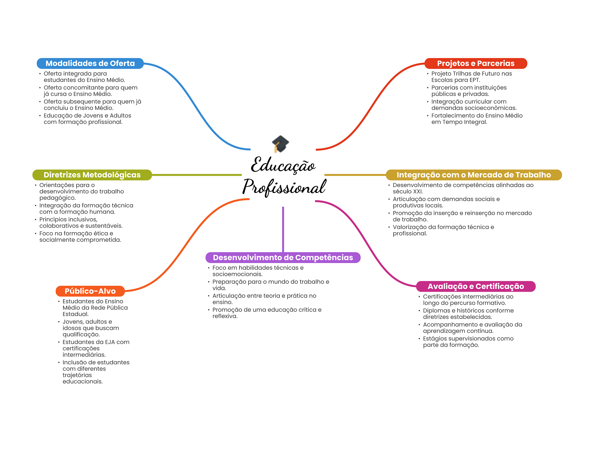 Modalidades de Oferta Projetos e Parcerias Oferta integrada para Projeto Trilhas de Futuro nas estudantes do Ensino Médio. Escolas para EPT. Oferta concomitante para quem Parcerias com instituições já cursa Ensino Médio. públicas e privadas. Oferta subsequente para quem já Integração curricular com concluiu Ensino Médio. demandas socioeconômicas. Educação de Jovens e Adultos Fortalecimento do Ensino Médio com formação profissional. em Tempo Integral. Educação Diretrizes Metodológicas Integração com Mercado de Trabalho Orientações para desenvolvimento do trabalho Profissional Desenvolvimento de competências alinhadas ao século XXI. pedagógico. Articulação com demandas sociais e Integração da formação técnica produtivas locais. com a formação humana. Promoção da inserção e reinserção no mercado Princípios inclusivos, de trabalho. colaborativos e sustentáveis. Valorização da formação técnica e Foco na formação ética e profissional. socialmente comprometida. Desenvolvimento de Competências Foco em habilidades técnicas e socioemocionais. Preparação para mundo do trabalho e Público-Alvo vida. Avaliação e Certificação Articulação entre teoria e prática no Certificações intermediárias ao Estudantes do Ensino ensino. longo do percurso formativo. Médio da Rede Pública Promoção de uma educação crítica e Diplomas e históricos conforme Estadual. reflexiva. diretrizes estabelecidas. Jovens, adultos e idosos que buscam Acompanhamento e avaliação da qualificação. aprendizagem contínua. Estudantes da EJA com Estágios supervisionados como certificações parte da formação. intermediárias. Inclusão de estudantes com diferentes trajetórias educacionais.