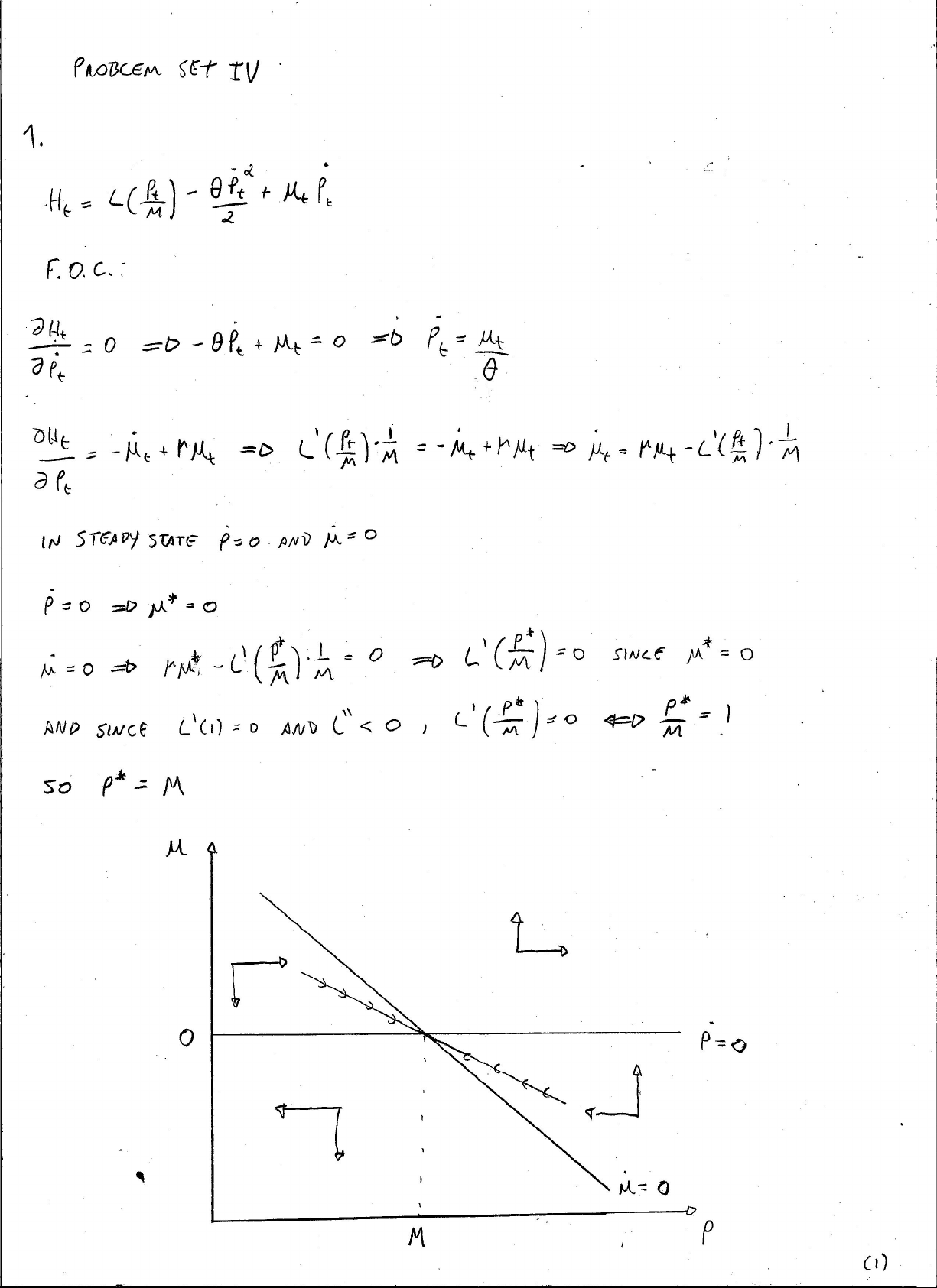 PROBLEM SET IV 1. = - Mt F.O.C.: = 0 =0 - + Mt = 0 = =0 = Mt 0 = - + = = - + =D MMt - 1 M IN STEADY STATE AND = M* = in = =D - ( M ) M = 0 =0 SINCE M* = AND SINCE AND ("UNEXPECTED AND PERMANENT INCREASE IN M. LET M' STAND THE NEW P M M 1 D P=O = to t M4 M=0 to M M' P WHAT CHANGES IF BECOMES VERY SMALL ? LOOKING AT THE EQUATION FOR P. WE SEE THAT THE RATE OF CHANGE (IN ABSOLUTE TERMS) of PRICES BECOMES MUCH For GIVEN DEVIATION of M FROM M P M t u 0 M = 0 P t M (2)2. x = =0 = = = SINCE THIS IMPLY - E = Eₜ + + +1]. = 0 SINCE THIS BE TRUE FOR ALL WE GET THAT IT +1 = (1) = - Et = - K Et ] Et AGAIN, ALL so - K = (2) 50 WE HAVE A SYSTEM WITH 2 VARIABLES AND 2 LET'S SOLVE FROM (2) WE THAT Yx= k PLUGGING THIS ON (1) n K + +1=0 K = = - SINCE K ARE POSITIVE AND 1, NOW, PLUGGING THIS EXPRESSION FOR IN 4x= = WE GET K = CO [n t + SINCE BOTH COEFFICIENTS ARE NEGATIVE SHOCK ON THE INTEREST RATE CAUSES BOTH INFLATION AND THE OUTPUT GAP to INCREASE. (3)K GIVES How MUCH REACTS to REMEMBER THAT K= = ) IF K is EITHER BECAUSE THE COST PRICE (LOW OR BECAUSE THE MARKET CLOSE to PERFECT COMPETITION (HIGH WE ARE CLOSE to THE SITUATION WHERE NOMINAL SHOCKS HAVE NO REAL IMPACT AND AS WE CAN SEE FROM THE EXPRESSIONS, A LARGE K IMPLIES A SMALL Yx AND A BIG THAT 15, THE NOMINAL SHOCK WILL HAVE SMALL IMPACT ON OUTPUT AND A IMPACT ON PRICES THROUGH INFLATION. ON THE OPROSITE THAT 15, SMALL (LARGE PRICE ADJUSTMENT COST OR LARGE DEVIATION FROM PERFECT WE HAVE THAT NOMINAL SWOCKS WILL HAVE IMPACTS ON REAL VARIABLES AS WE CAN SEE BY THE FACT TWAT SMALL K IMPLIES THAT is BIG AND THE NOMINAL SHOCK WILL HAVE LARGE IMPACT ON OUTPUT AND PRICES will ONLY SLOWLY TRHOUGH INFLATION. (4)3. FIRST CASE X = IN THIS CASE Pi - mt DISTRIBUTED ON [o, PN INCREASE BY dm IN DISLOCATES THIS DISTRIBUTION to SINCE No FIRM PUSHED ABOVE OR BELOW THE 5 AND RESPECTEVELY. HENCE, ONE CHANGES ITS PRICE AND P DOGSN'T CHANGE. -dmo -dm 0 Pi - 5-dm IF W.E CONSIDER THAT dm 15 ALWAYS SMALLER THAN No METTER HOW CLOSE X THEN AGAIN, AS ABOVE, THE DISCOCATION THE P.D.F. OF mt TO THE CEFT PUSH ANY FIRM BELOW THE THRESHOLD Pi - = ONE CHANGE PRICE AND AGAIN THE PRICE INDEX DOESN'T CHANGE. X = - IN THIS CASE IS UNIFORMICY DISTRIBUTED ON [-5, 0] AN INCREASE IN mt dm THIS DISTRIBUTION TO - (5)0 mt -dm NOW THERE MASS FIRMS SUCH THAT E [-s-dm, -s] AFTER THE INCREASE IN mt AND THEY WILL CHANGE THEIR PRICES THE NEW ANY FIRM SUCH THAT E BEFORE THE INCREASE IN mt WILL INCREASE PRICE THE NEW mt AFTER IT INCREASES, 50 THE PROPORTION OF FIRMS THAT CHANGE PRICES 15: FC - St dm) = +dm - = dm 0 - 5 SINCE THE FIRMS WILL INCREASE THEIR PRICES By dp = 5 = = dm So THE PRICE INDEX P CHANGE IN THE SAME DIRECTION AND MAGNITUDE AS CHANGE IN MONEY SUPPLY mt, AS IN THE MODEL. IN THE MODEL, THERE WAS A MASS OF FIRMS ARBITRARILY CLOSE to THE THRESNOLD AT WHICH THEY CHANGE THEIR PRICES, WHICH AS WE CAN SEE IN THIS EXERCISE, ESSENTIAL FoR THE RESULT = IF TWERE IS NO FIRM ON THIS THEN THERE will ALWAYS EXIST A dm SMALL ENOUGH SUCH THAT THE CHANGE IN mt DOESN'T INDUCE ANY TO ADJUST PRICES THAT THE PRICE INDEX DOESN'T RESPOND to THE SHOCK. (6)4. - it, = E-1 MULTIPLY BY THE INTEGRATING FACTOR e-pt = P NOTICE THAT = - = E-1 SINCE THIS 15 VALID WE CAN INTEGRATE BOTH SIDES IN TO t FROM to INFINITY = ( Pt ] NOW, = [e-pt = CIM - 0 - = = [ ( Pt Pt )] It FOR AN ARBITRARY WE HAVE = E-1 ( =D Pt - a (7)BUT t He -F) ) 17 ]
