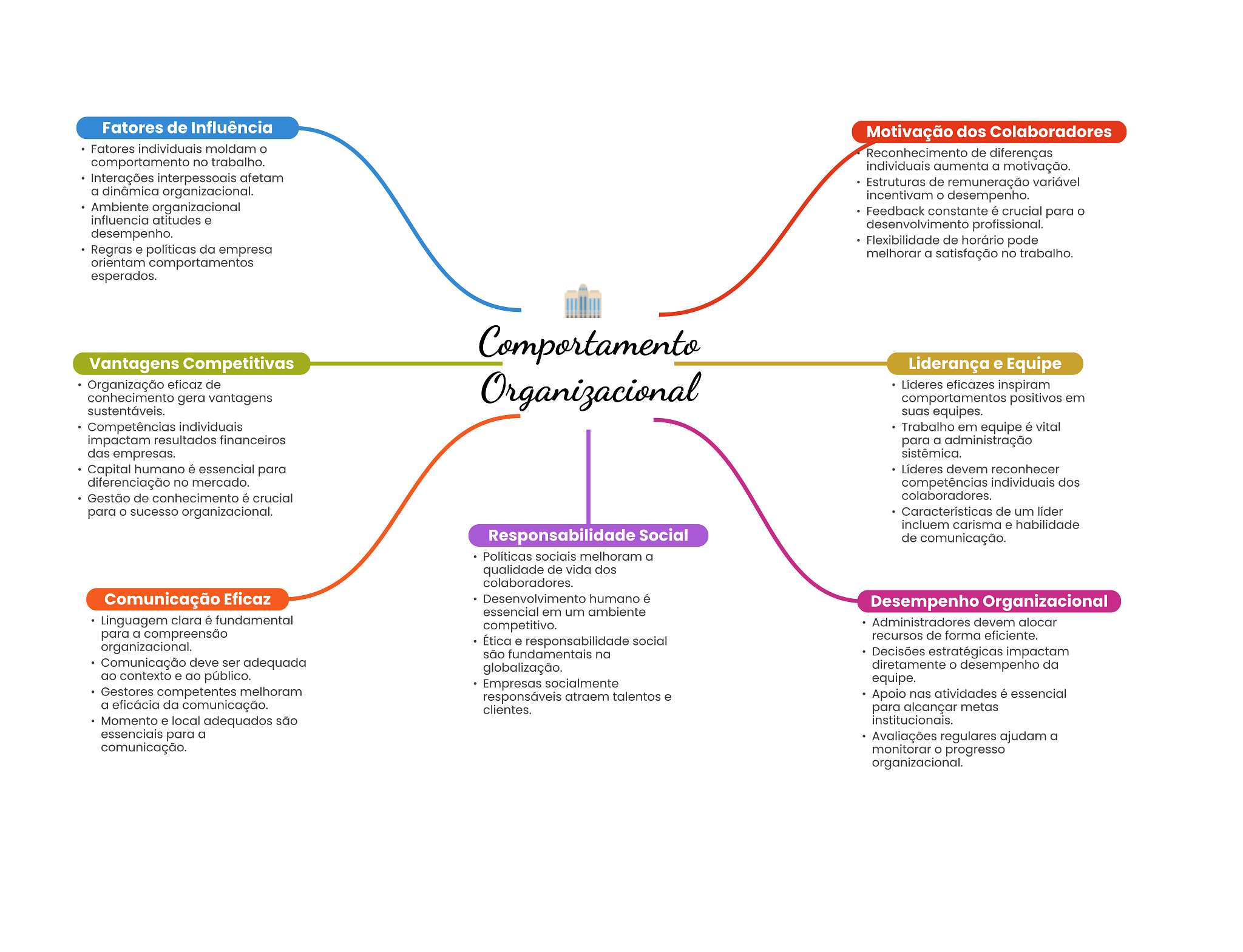 Fatores de Influência Motivação dos Colaboradores Fatores individuais moldam Reconhecimento de diferenças comportamento no trabalho. individuais aumenta a motivação. Interações interpessoais afetam Estruturas de remuneração variável a dinâmica organizacional. incentivam desempenho. Ambiente organizacional Feedback constante é crucial para influencia atitudes e desenvolvimento profissional. desempenho. Flexibilidade de horário pode Regras e políticas da empresa melhorar a satisfação no trabalho. orientam comportamentos esperados. Comportamento Vantagens Competitivas Liderança e Equipe Organização eficaz de conhecimento gera vantagens Organizacional Líderes eficazes inspiram comportamentos positivos em sustentáveis. suas equipes. Competências individuais Trabalho em equipe é vital impactam resultados financeiros para a administração das empresas. sistêmica. Capital humano é essencial para Líderes devem reconhecer diferenciação no mercado. competências individuais dos Gestão de conhecimento é crucial colaboradores. para sucesso organizacional. Características de um líder incluem carisma e habilidade Responsabilidade Social de comunicação. Políticas sociais melhoram a qualidade de vida dos colaboradores. Comunicação Eficaz Desenvolvimento humano é Desempenho Organizacional essencial em um ambiente Linguagem clara é fundamental competitivo. Administradores devem alocar para a compreensão organizacional. Ética e responsabilidade social recursos de forma eficiente. são fundamentais na Decisões estratégicas impactam Comunicação deve ser adequada globalização. diretamente desempenho da ao contexto e ao público. Empresas socialmente equipe. Gestores competentes melhoram responsáveis atraem talentos e Apoio nas atividades é essencial a eficácia da comunicação. clientes. para alcançar metas Momento e local adequados são institucionais. essenciais para a Avaliações regulares ajudam a comunicação. monitorar progresso organizacional.