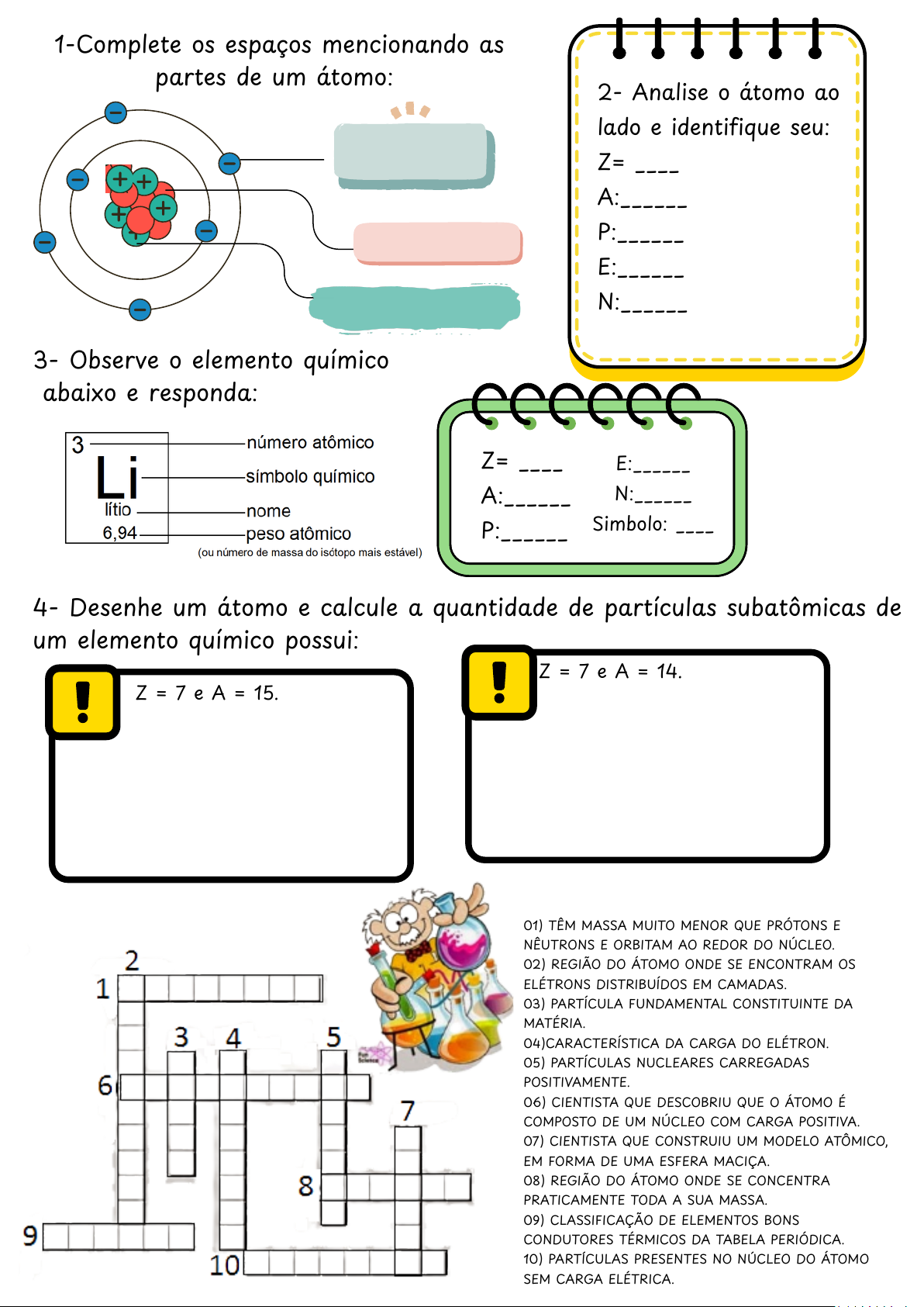 2- Analise o átomo ao lado e identifique seu: Z= ____ A:______ P:______ E:______ N:______ 1-Complete os espaços mencionando as partes de um átomo: 3- Observe o elemento químico abaixo e responda: Z= ____ A:______ P:______ E:______ N:______ Simbolo: ____ 4- Desenhe um átomo e calcule a quantidade de partículas subatômicas de um elemento químico possui: Z = 7 e A = 15. Z = 7 e A = 14. 01) TE� M MASSA MUITO MENOR QUE PRO� TONS E NE� UTRONS E ORBITAM AO REDOR DO NU� CLEO. 02) REGIA� O DO A� TOMO ONDE SE ENCONTRAM OS ELE� TRONS DISTRIBUI� DOS EM CAMADAS. 03) PARTI� CULA FUNDAMENTAL CONSTITUINTE DA MATE� RIA. 04)CARACTERI� STICA DA CARGA DO ELE� TRON. 05) PARTI� CULAS NUCLEARES CARREGADAS POSITIVAMENTE. 06) CIENTISTA QUE DESCOBRIU QUE O A� TOMO E� COMPOSTO DE UM NU� CLEO COM CARGA POSITIVA. 07) CIENTISTA QUE CONSTRUIU UM MODELO ATO� MICO, EM FORMA DE UMA ESFERA MACIÇA. 08) REGIA� O DO A� TOMO ONDE SE CONCENTRA PRATICAMENTE TODA A SUA MASSA. 09) CLASSIFICAÇA� O DE ELEMENTOS BONS CONDUTORES TE� RMICOS DA TABELA PERIO� DICA. 10) PARTI� CULAS PRESENTES NO NU� CLEO DO A� TOMO SEM CARGA ELE� TRICA.