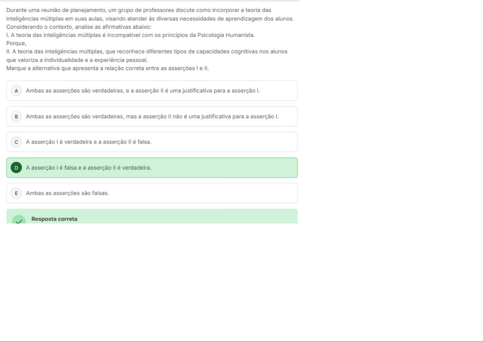Durante uma reunião de planejamento, um grupo de professores discute como incorporar a teoria das inteligências múltiplas em suas aulas, visando atender às diversas necessidades de aprendizagem dos alunos. Considerando contexto, analise as afirmativas abaixo: I. A teoria das inteligências múltiplas é com os princípios da Psicologia Humanista. Porque, II. A teoria das inteligências múltiplas, que reconhece diferentes tipos de capacidades cognitivas nos alunos que valoriza a individualidade e a experiência pessoal. Marque a alternativa que apresenta a relação correta entre as asserções e A Ambas as asserções são verdadeiras, e a asserção é uma justificativa para a asserção Ambas as asserções são verdadeiras, mas a asserção não é uma justificativa para a asserção I. C A asserção é verdadeira e a asserção Il é falsa. D A asserção I é falsa e a asserção é verdadeira. E Ambas as asserções são falsas. Resposta correta