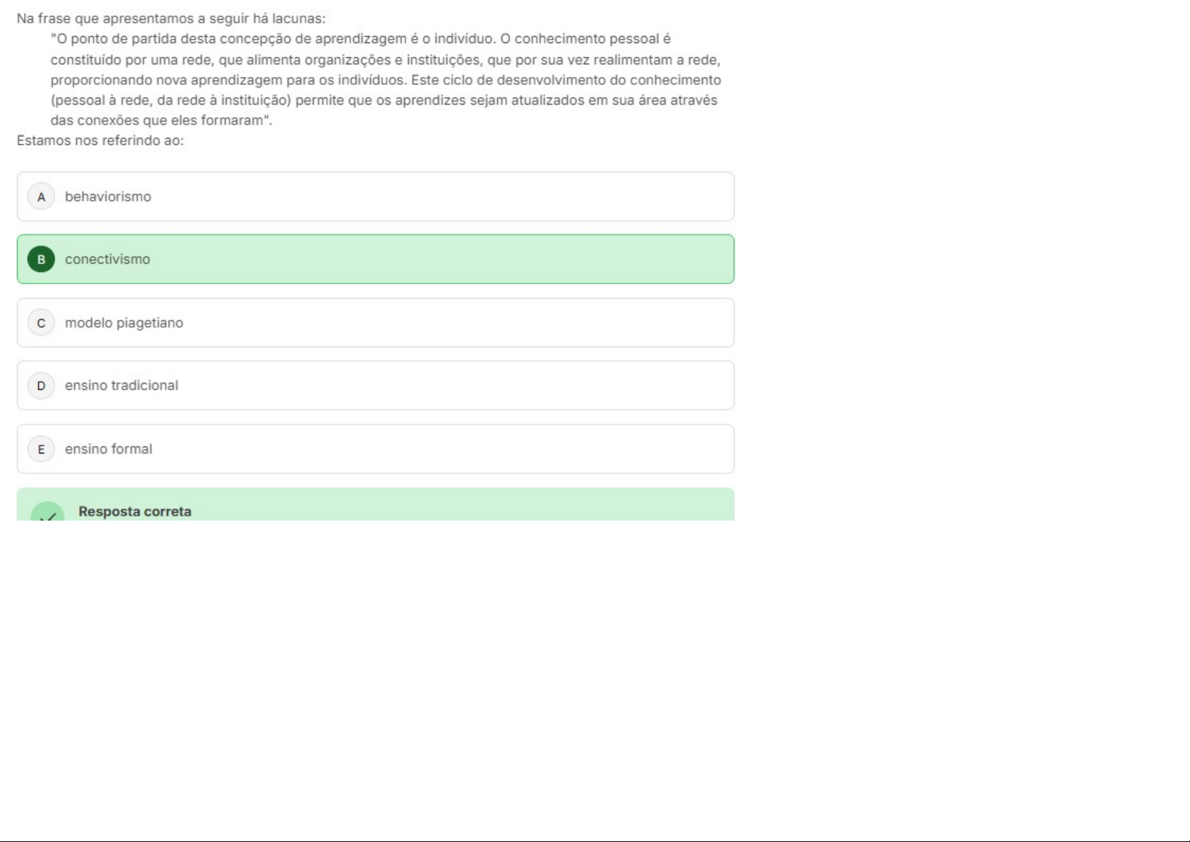 Na frase que apresentamos a seguir há lacunas: "O ponto de partida desta concepção de aprendizagem é 0 indivíduo. 0 conhecimento pessoal é constituído por uma rede, que alimenta organizações e instituições, que por sua vez realimentam a rede, proporcionando nova aprendizagem para os indivíduos. Este ciclo de desenvolvimento do conhecimento (pessoal à rede, da rede à instituição) permite que os aprendizes sejam atualizados em sua área através das conexões que eles formaram". Estamos nos referindo ao: A behaviorismo conectivismo C modelo piagetiano D ensino tradicional E ensino formal Resposta correta