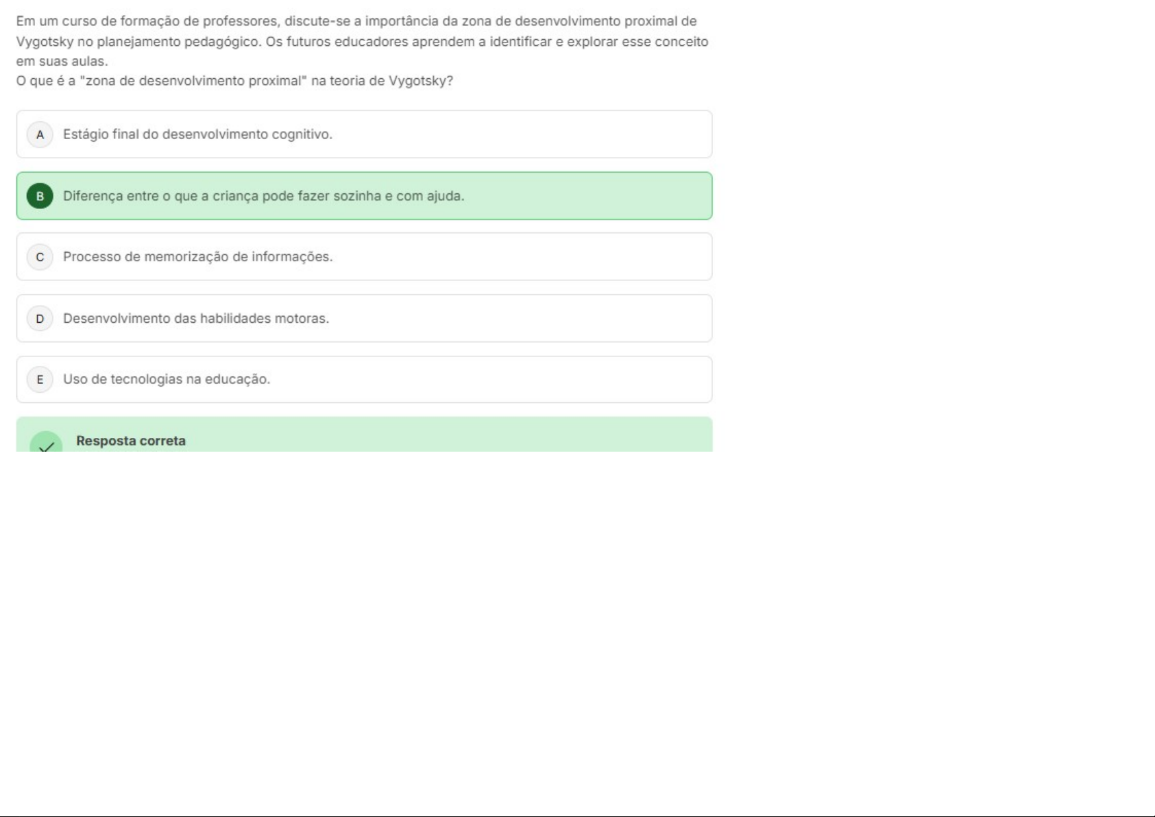 Em um curso de formação de professores, discute-se a importância da zona de desenvolvimento proximal de Vygotsky no planejamento pedagógico. Os futuros educadores aprendem a identificar e explorar esse conceito em suas aulas. que é a "zona de desenvolvimento proximal" na teoria de Vygotsky? A Estágio final do desenvolvimento cognitivo. Diferença entre o que a criança pode fazer sozinha e com ajuda. C Processo de memorização de informações. D Desenvolvimento das habilidades motoras. E Uso de tecnologias na educação. Resposta correta