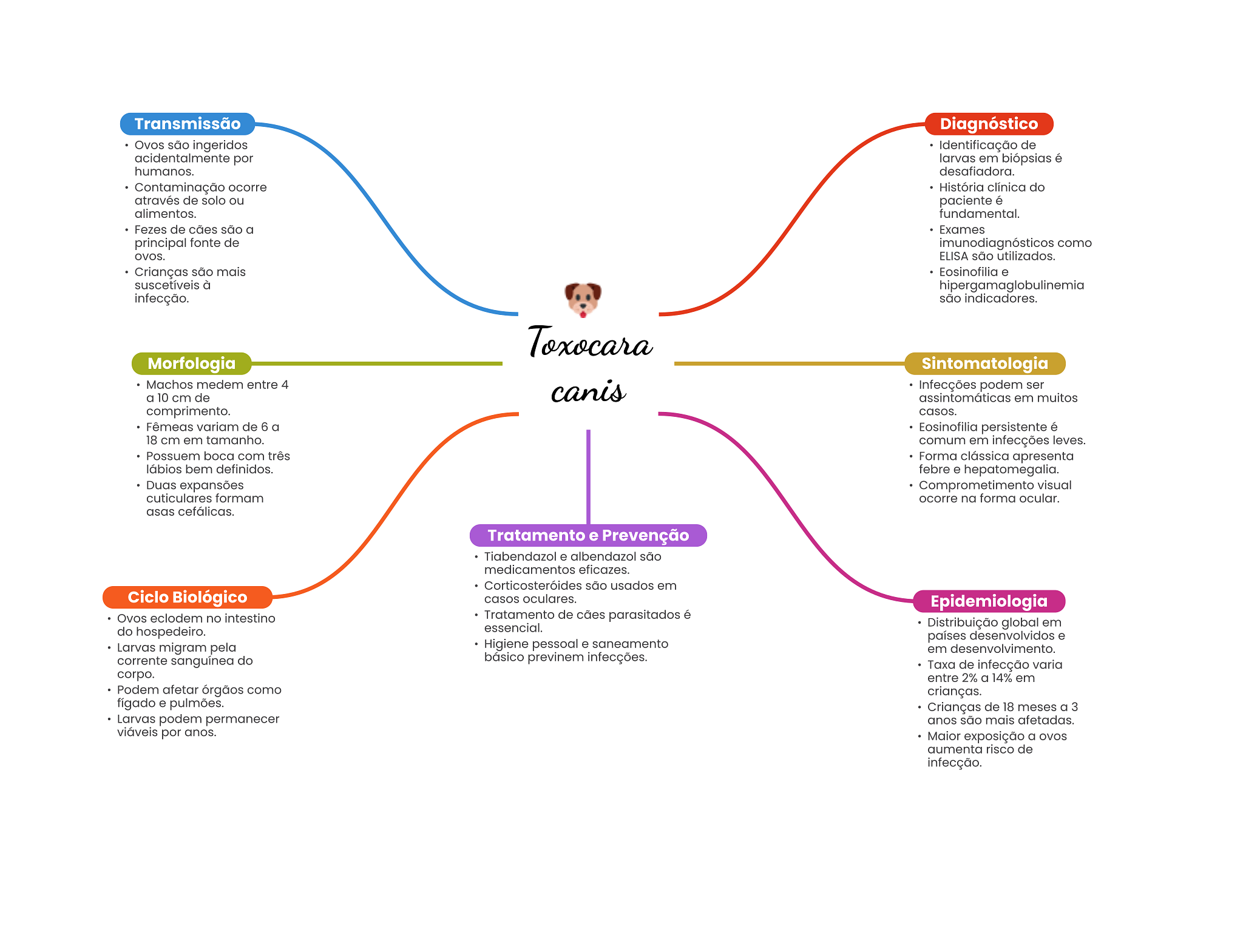 Transmissão Diagnóstico Ovos são ingeridos Identificação de acidentalmente por larvas em biópsias é humanos. desafiadora. Contaminação ocorre História clínica do através de solo ou paciente é alimentos. fundamental. Fezes de cães são a Exames principal fonte de imunodiagnósticos como ELISA são utilizados. Crianças são mais Eosinofilia e suscetíveis à hipergamaglobulinemia infecção. são indicadores. Toxocara Morfologia Sintomatologia Machos medem entre 4 canis Infecções podem ser a 10 cm de assintomáticas em muitos comprimento. casos. Fêmeas variam de 6 a Eosinofilia persistente é 18 cm em tamanho. comum em infecções leves. Possuem boca com três Forma clássica apresenta lábios bem definidos. febre e hepatomegalia. Duas expansões Comprometimento visual cuticulares formam ocorre na forma ocular. asas cefálicas. Tratamento e Prevenção Tiabendazol e albendazol são medicamentos eficazes. são usados em Ciclo Biológico casos oculares. Epidemiologia Ovos eclodem no intestino Tratamento de cães parasitados é do hospedeiro. essencial. Distribuição global em países desenvolvidos e Larvas migram pela Higiene pessoal e saneamento em desenvolvimento. corrente sanguínea do básico previnem infecções. Taxa de infecção varia corpo. entre 2% a 14% em Podem afetar órgãos como crianças. fígado e pulmões. Crianças de 18 meses a 3 Larvas podem permanecer anos são mais afetadas. viáveis por anos. Maior exposição a ovos aumenta risco de infecção.