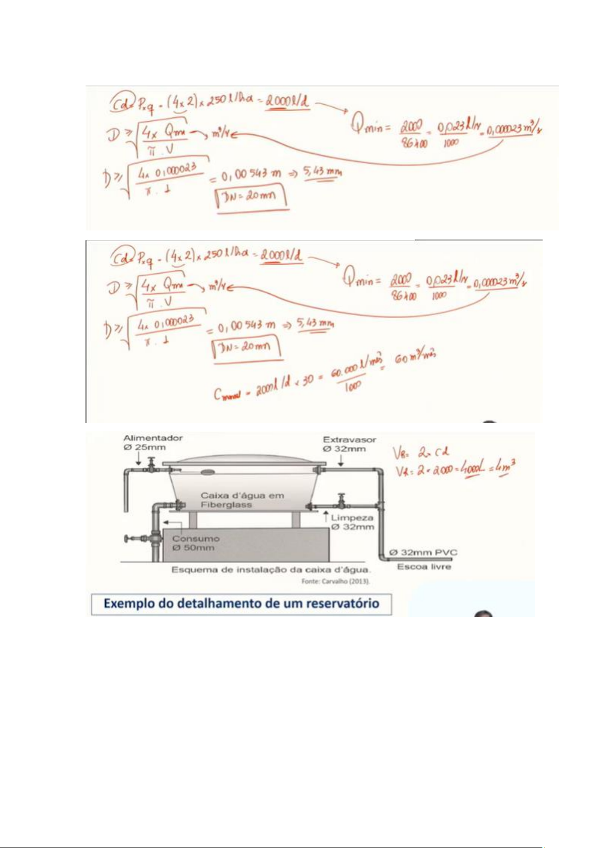- 250 2000l/d 4x Qm Qmin= = 2000 V 86400 1000 0,000023 543 m 5,43 mm = DN=20mn Cd Pxq (4x2)x 250 2000l/d 4x Qm mile Qmin= = 2000 V 86400 1000 71 0,000023 = 543 m 5,43 mm DN=20mn 30 1000 60 Alimentador Extravasor 0 25mm 32mm VR= Caixa em Fiberglass Limpeza 0 32mm Consumo 0 50mm 0 32mm PVC Esquema de instalação da caixa d'água. Escoa livre Fonte: Carvalho (2013). Exemplo do detalhamento de um reservatório