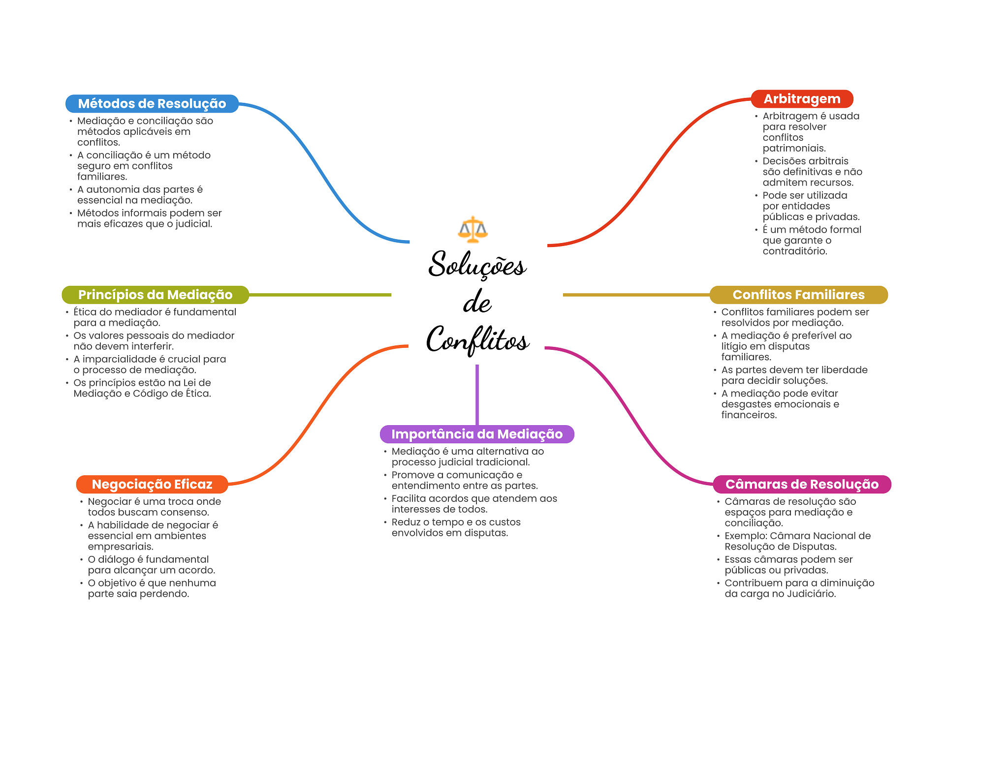 Métodos de Resolução Arbitragem Mediação e conciliação são Arbitragem é usada métodos aplicáveis em para resolver conflitos conflitos. patrimoniais. A conciliação é um método Decisões arbitrais seguro em conflitos são definitivas e não familiares. admitem recursos. A autonomia das partes é Pode ser utilizada essencial na mediação. por entidades Métodos informais podem ser públicas e privadas. mais eficazes que judicial. É um método formal que garante contraditório. Soluções Princípios da Mediação de Conflitos Familiares Ética do mediador é fundamental Conflitos familiares podem ser para a mediação. resolvidos por mediação. Os valores pessoais do mediador Conflitos A mediação é preferível ao não devem interferir. litígio em disputas A imparcialidade é crucial para familiares. processo de mediação. As partes devem ter liberdade Os princípios estão na Lei de para decidir soluções. Mediação e Código de Ética. A mediação pode evitar desgastes emocionais e financeiros. Importância da Mediação Mediação é uma alternativa ao processo judicial tradicional. Promove a comunicação e Negociação Eficaz entendimento entre as partes. Câmaras de Resolução Negociar é uma troca onde Facilita acordos que atendem aos Câmaras de resolução são todos buscam consenso. interesses de todos. espaços para mediação e A habilidade de negociar é Reduz O tempo e custos conciliação. essencial em ambientes envolvidos em disputas. Exemplo: Câmara Nacional de empresariais. Resolução de Disputas. diálogo é fundamental Essas câmaras podem ser para alcançar um acordo. públicas ou privadas. objetivo é que nenhuma Contribuem para a diminuição parte saia perdendo. da carga no Judiciário.