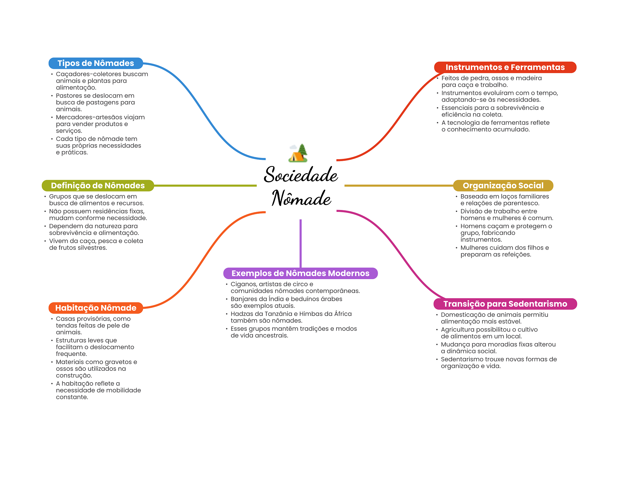 Tipos de Nômades Instrumentos e Ferramentas Caçadores-coletores buscam animais e plantas para Feitos de pedra, ossos e madeira alimentação. para caça e trabalho. Pastores se deslocam em Instrumentos evoluíram com tempo, busca de pastagens para adaptando-se às necessidades. animais. Essenciais para a sobrevivência e eficiência na coleta. Mercadores-artesãos viajam para vender produtos e A tecnologia de ferramentas reflete serviços. conhecimento acumulado. Cada tipo de nômade tem suas próprias necessidades e práticas. Sociedade Definição de Nômades Organização Social Grupos que se deslocam em Nômade Baseada em laços familiares busca de alimentos e recursos. e relações de parentesco. Não possuem residências fixas, Divisão de trabalho entre mudam conforme necessidade. homens e mulheres é comum. Dependem da natureza para Homens caçam e protegem sobrevivência e alimentação. grupo, fabricando Vivem da caça, pesca e coleta instrumentos. de frutos silvestres. Mulheres cuidam dos filhos e preparam as refeições. Exemplos de Nômades Modernos Ciganos, artistas de circo e comunidades nômades contemporâneas. Banjares da India e beduínos árabes Habitação Nômade são exemplos atuais. Transição para Sedentarismo Hadzas da Tanzânia e Himbas da África Domesticação de animais permitiu Casas provisórias, como também são nômades. alimentação mais estável. tendas feitas de pele de animais. Esses grupos mantêm tradições e modos Agricultura possibilitou O cultivo de vida ancestrais. de alimentos em um local. Estruturas leves que facilitam deslocamento Mudança para moradias fixas alterou a dinâmica social. frequente. Sedentarismo trouxe novas formas de Materiais como gravetos e são utilizados na organização e vida. construção. A habitação reflete a necessidade de mobilidade constante.
