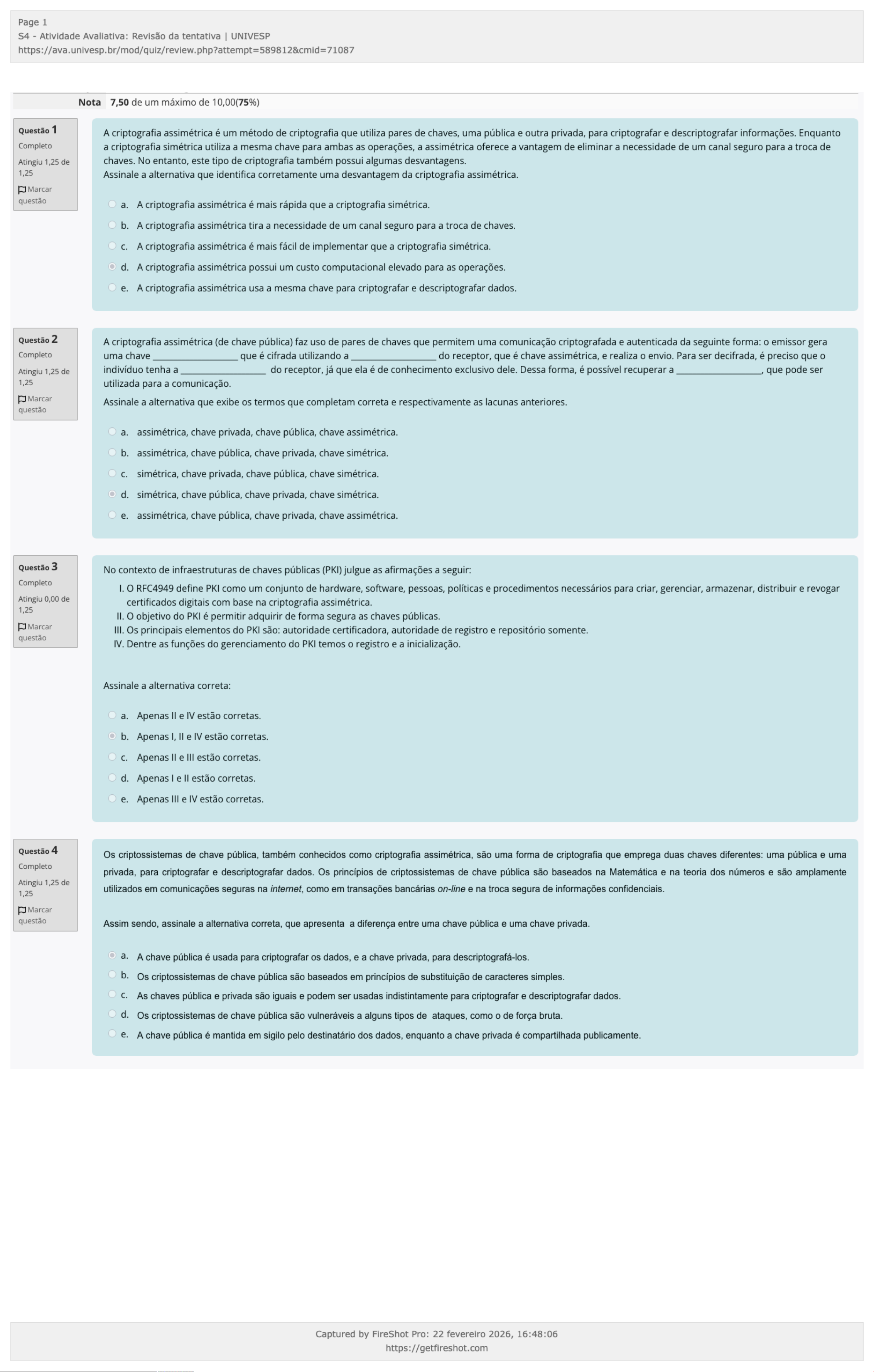 Nota 7,50 de um máximo de 10,00( 75 %) 1 Questão A criptografia assimétrica é um método de criptografia que utiliza pares de chaves, uma pública e outra privada, para criptografar e descriptografar informações. Enquanto a criptografia simétrica utiliza a mesma chave para ambas as operações, a assimétrica oferece a vantagem de eliminar a necessidade de um canal seguro para a troca de Completo chaves. No entanto, este tipo de criptografia também possui algumas desvantagens. Atingiu 1,25 de Assinale a alternativa que identifica corretamente uma desvantagem da criptografia assimétrica. 1,25 Marcar questão a. A criptografia assimétrica é mais rápida que a criptografia simétrica. b. A criptografia assimétrica tira a necessidade de um canal seguro para a troca de chaves. c. A criptografia assimétrica é mais fácil de implementar que a criptografia simétrica. d. A criptografia assimétrica possui um custo computacional elevado para as operações. e. A criptografia assimétrica usa a mesma chave para criptografar e descriptografar dados. 2 Questão A criptografia assimétrica (de chave pública) faz uso de pares de chaves que permitem uma comunicação criptografada e autenticada da seguinte forma: o emissor gera uma chave _____________________ que é cifrada utilizando a _____________________ do receptor, que é chave assimétrica, e realiza o envio. Para ser decifrada, é preciso que o Completo indivíduo tenha a _____________________ do receptor, já que ela é de conhecimento exclusivo dele. Dessa forma, é possível recuperar a _____________________, que pode ser Atingiu 1,25 de 1,25 utilizada para a comunicação. Marcar Assinale a alternativa que exibe os termos que completam correta e respectivamente as lacunas anteriores. questão a. assimétrica, chave privada, chave pública, chave assimétrica. b. assimétrica, chave pública, chave privada, chave simétrica. c. simétrica, chave privada, chave pública, chave simétrica. d. simétrica, chave pública, chave privada, chave simétrica. e. assimétrica, chave pública, chave privada, chave assimétrica. 3 Questão No contexto de infraestruturas de chaves públicas (PKI) julgue as afirmações a seguir: Completo O RFC4949 define PKI como um conjunto de hardware, software, pessoas, políticas e procedimentos necessários para criar, gerenciar, armazenar, distribuir e revogar Atingiu 0,00 de certificados digitais com base na criptografia assimétrica. 1,25 O objetivo do PKI é permitir adquirir de forma segura as chaves públicas. Marcar Os principais elementos do PKI são: autoridade certificadora, autoridade de registro e repositório somente. questão Dentre as funções do gerenciamento do PKI temos o registro e a inicialização. Assinale a alternativa correta: a. Apenas II e IV estão corretas. b. Apenas I, II e IV estão corretas. c. Apenas II e III estão corretas. d. Apenas I e II estão corretas. e. Apenas III e IV estão corretas. 4 Questão Os criptossistemas de chave pública, também conhecidos como criptografia assimétrica, são uma forma de criptografia que emprega duas chaves diferentes: uma pública e uma Completo privada, para criptografar e descriptografar dados. Os princípios de criptossistemas de chave pública são baseados na Matemática e na teoria dos números e são amplamente Atingiu 1,25 de utilizados em comunicações seguras na internet , como em transações bancárias on-line e na troca segura de informações confidenciais. 1,25 Marcar questão Assim sendo, assinale a alternativa correta, que apresenta a diferença entre uma chave pública e uma chave privada. a. A chave pública é usada para criptografar os dados, e a chave privada, para descriptografá-los. b. Os criptossistemas de chave pública são baseados em princípios de substituição de caracteres simples. c. As chaves pública e privada são iguais e podem ser usadas indistintamente para criptografar e descriptografar dados. d. Os criptossistemas de chave pública são vulneráveis a alguns tipos de ataques, como o de força bruta. e. A chave pública é mantida em sigilo pelo destinatário dos dados, enquanto a chave privada é compartilhada publicamente. https://ava.univesp.br/mod/quiz/review.php?attempt=589812&cmid=71087 https://getfireshot.com 5 Questão A hierarquia de certificação é um aspecto crucial na infraestrutura de chaves públicas (PKI), onde as autoridades certificadoras (CAs) raiz delegam a emissão de certificados a CAs subordinadas. Esta estrutura hierárquica garante que a confiança nos certificados digitais seja mantida através de uma cadeia de confiança bem definida. Completo Assinale a alternativa correta que apresenta a principal vantagem da hierarquia de certificação na infraestrutura de chaves públicas (PKI). Atingiu 1,25 de 1,25 a. Permite que qualquer entidade emita certificados digitais sem verificação, eliminando a necessidade de processos de validação e permitindo emissão rápida e Marcar questão menos burocrática. b. Elimina a necessidade de renovação de certificados digitais, permitindo seu uso indefinidamente sem revisão ou atualização, o que simplifica a gestão dos certificados. c. Facilita a gestão centralizada de todos os certificados digitais, oferecendo uma plataforma única onde todos podem ser monitorados, gerenciados e renovados, centralizando o controle. d. Garante uma cadeia de confiança que valida a autenticidade dos certificados emitidos, estabelecendo uma estrutura onde CAs raiz delegam emissão a subordinadas, assegurando rastreamento confiável. e. Assegura que todos os certificados digitais sejam sempre válidos, independentemente de mudanças nas condições de segurança ou políticas de emissão, garantindo continuidade e confiança. 6 Questão Considere a situação apresentada a seguir. Completo Um indivíduo A altera uma mensagem recebida e afirma ter recebido-a do indivíduo B. O indivíduo B, por sua vez, nega o envio. Havendo a possibili