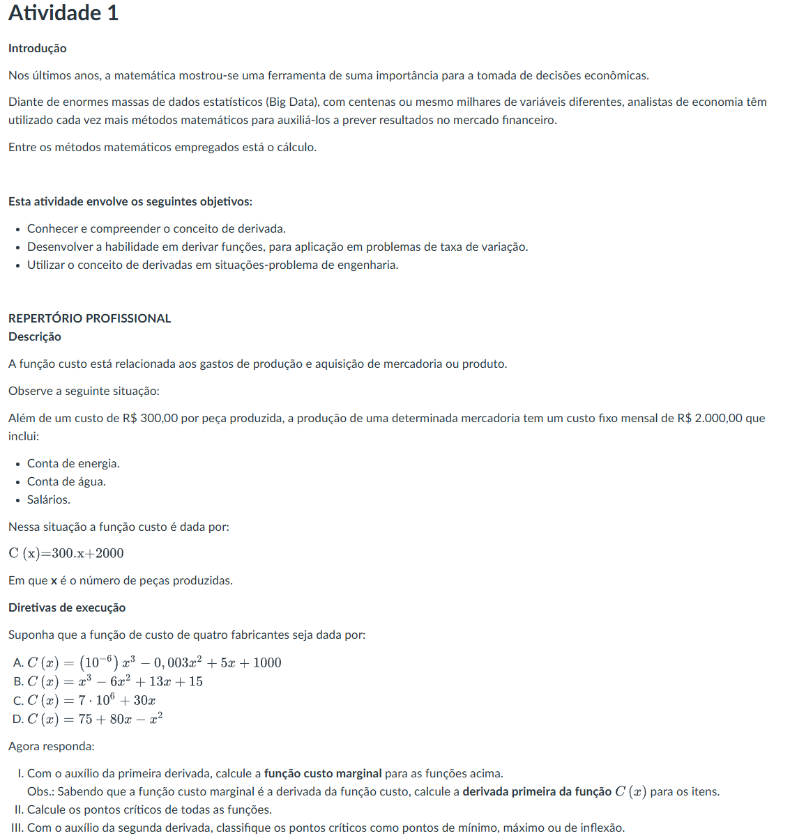 Atividade 1 Introdução Nos últimos anos, a matemática mostrou-se uma ferramenta de suma importância para a tomada de decisões econômicas. Diante de enormes massas de dados estatísticos (Big Data), com centenas ou mesmo milhares de variáveis diferentes, analistas de economia têm utilizado cada vez mais métodos matemáticos para auxiliá-los a prever resultados no mercado financeiro. Entre os métodos matemáticos empregados está O cálculo. Esta atividade envolve os seguintes objetivos: Conhecer e compreender O conceito de derivada. Desenvolver a habilidade em derivar funções, para aplicação em problemas de taxa de variação. Utilizar conceito de derivadas em situações-problema de engenharia. REPERTÓRIO PROFISSIONAL Descrição A função custo está relacionada aos gastos de produção e aquisição de mercadoria ou produto. Observe a seguinte situação: Além de um custo de por peça produzida, a produção de uma determinada mercadoria tem um custo fixo mensal de R$ 2.000,00 que inclui: Conta de energia. Conta de água. Salários. Nessa situação a função custo é dada por: Em que é O número de peças produzidas. Diretivas de execução Suponha que a função de custo de quatro fabricantes seja dada por: Agora responda: I. Com auxílio da primeira derivada, calcule a função custo marginal para as funções acima. Obs.: Sabendo que a função custo marginal é a derivada da função custo, calcule a derivada primeira da função (x) para itens. II. Calcule pontos críticos de todas as funções. III. Com auxílio da segunda derivada, classifique pontos críticos como pontos de mínimo, máximo ou de inflexão.