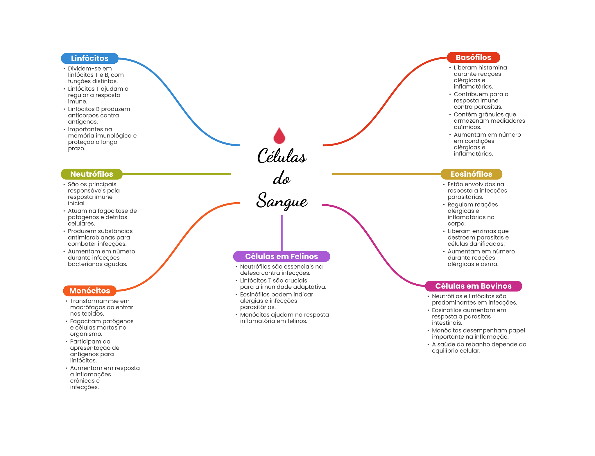 Linfócitos Basófilos Dividem-se em Liberam histamina linfócitos T e B, com durante reações funções distintas. alérgicas e Linfócitos T ajudam a inflamatórias. regular a resposta Contribuem para a imune. resposta imune Linfócitos produzem contra parasitas. anticorpos contra Contêm grânulos que antígenos. armazenam mediadores Importantes na químicos. memória imunológica e Aumentam em número proteção a longo em condições prazo. alérgicas e Células inflamatórias. Neutrófilos do Eosinófilos São OS principais Estão envolvidos na responsáveis pela resposta a infecções resposta imune inicial. Sangue parasitárias. Regulam reações Atuam na fagocitose de alérgicas e patógenos e detritos inflamatórias no celulares. corpo. Produzem substâncias Liberam enzimas que antimicrobianas para destroem parasitas e combater infecções. células danificadas. Aumentam em número Aumentam em número durante infecções Células em Felinos durante reações bacterianas agudas. Neutrófilos são essenciais na alérgicas e asma. defesa contra infecções. Linfócitos T são cruciais Monócitos para a imunidade adaptativa. Células em Bovinos Eosinófilos podem indicar Neutrófilos e linfócitos são Transformam-se em alergias e infecções predominantes em infecções. macrófagos ao entrar parasitárias. Eosinófilos aumentam em nos tecidos. Monócitos ajudam na resposta resposta a parasitas Fagocitam patógenos inflamatória em felinos. intestinais. e células mortas no organismo. Monócitos desempenham papel importante na inflamação. Participam da apresentação de A saúde do rebanho depende do para equilíbrio celular. linfócitos. Aumentam em resposta a inflamações crônicas e infecções.