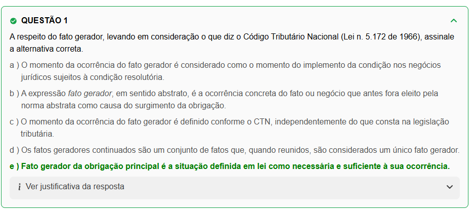QUESTÃO 1 A respeito do fato gerador, levando em consideração 0 que diz 0 Código Tributário Nacional (Lei n. 5.172 de 1966), assinale a alternativa correta. a ) momento da ocorrência do fato gerador é considerado como momento do implemento da condição nos negócios jurídicos sujeitos à condição resolutória. b) A expressão fato gerador, em sentido abstrato, é a ocorrência concreta do fato ou negócio que antes fora eleito pela norma abstrata como causa do surgimento da obrigação. c) O momento da ocorrência do fato gerador é definido conforme CTN, independentemente do que consta na legislação tributária. d) Os fatos geradores continuados são um conjunto de fatos que, quando reunidos, são considerados um único fato gerador. e ) Fato gerador da obrigação principal é a situação definida em lei como necessária e suficiente à sua ocorrência. i Ver justificativa da resposta