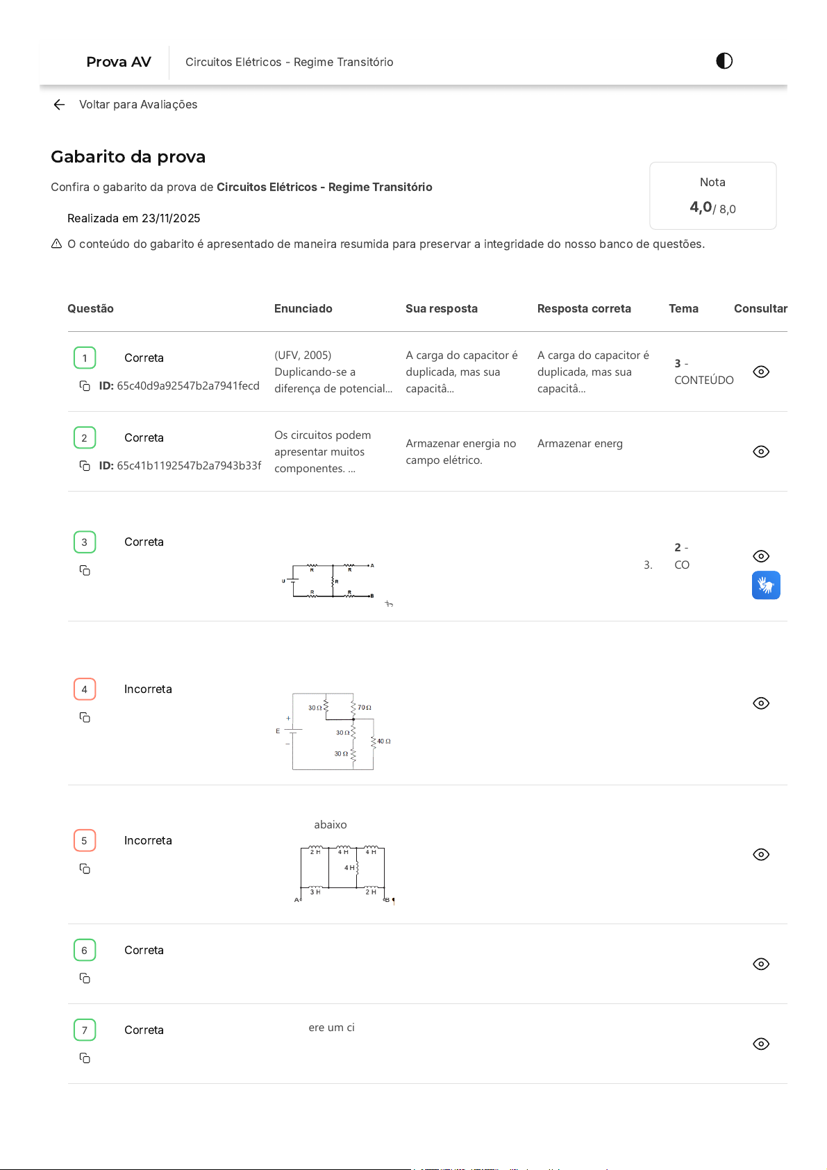 Voltar para Avaliações Gabarito da prova Confira o gabarito da prova de Circuitos Elétricos - Regime Transitório Realizada em 23/11/2025 Nota 4,0/ 8,0 O conteúdo do gabarito é apresentado de maneira resumida para preservar a integridade do nosso banco de questões. Questão Enunciado Sua resposta Resposta correta Tema Consultar Correta ID: 65c40d9a92547b2a7941fecd (UFV, 2005) Duplicando-se a diferença de potencial... A carga do capacitor é duplicada, mas sua capacitâ... A carga do capacitor é duplicada, mas sua capacitâ... 3 - CONTEÚDO Correta ID: 65c41b1192547b2a7943b33f Os circuitos podem apresentar muitos componentes. ... Armazenar energia no campo elétrico. Armazenar energia no campo elétrico. 5 - CONTEÚDO Correta ID: 65c4bf0392547b2a794896d8 A figura a seguir apresenta um circuito composto d... Uma fonte de tensão U/3 e um resistor 8R/3. Uma fonte de tensão U/3 e um resistor 8R/3. 2 - CONTEÚDO Incorreta ID: 65c40bdc92547b2a7941c76f Considerando o circuito a seguir apresentado e sab... 120 90 2 - CONTEÚDO Incorreta ID: 65c4c02f92547b2a7948c388 (TRF, 2015) Considere o circuito abaixo: Figura... 4H ≤ Leq 2H ≤ Leq 3 - CONTEÚDO Correta ID: 65c4250492547b2a7944d240 (FCC, 2010) Três capacitores estão associados em s... 300 µF 300 µF 3 - CONTEÚDO Correta ID: 65c42d2892547b2a794641fd Considere um circuito RL, cujos valores para os co... 0,8 0,8 4 - CONTEÚDO 1 2 3 4 5 6 7 Prova AV Circuitos Elétricos - Regime Transitório https://estacio.saladeavaliacoes.com.br/avaliacoes/ Incorreta ID: 65c4320492547b2a79477242 (FCC - 2017) No circuito a seguir, considere que o... 1 A 5 A 5 - CONTEÚDO Incorreta ID: 65c408ec92547b2a79416fcd Qual o valor de A e B para o circuito a seguir? ... A = 6,43 V e B = -9,86. A = 6,43 V e B = 9,86. 2 - CONTEÚDO Incorreta ID: 65c4291c92547b2a79453a7f Considerando as equações: v(t)=60(e^-10³t)V i(t)... 10Ω e 0,01F. 1Ω e 0,01F. 4 - CONTEÚDO 8 9 10 Encontrou algum problema? Você pode copiar o ID da questão e abrir um requerimento. Na tela inicial do Campus Virtual (SIA), acesse "Atendimento > Requerimento > Novo > Currículo/Aula/horário > Analisar ambiente de avaliação/exercícios"
