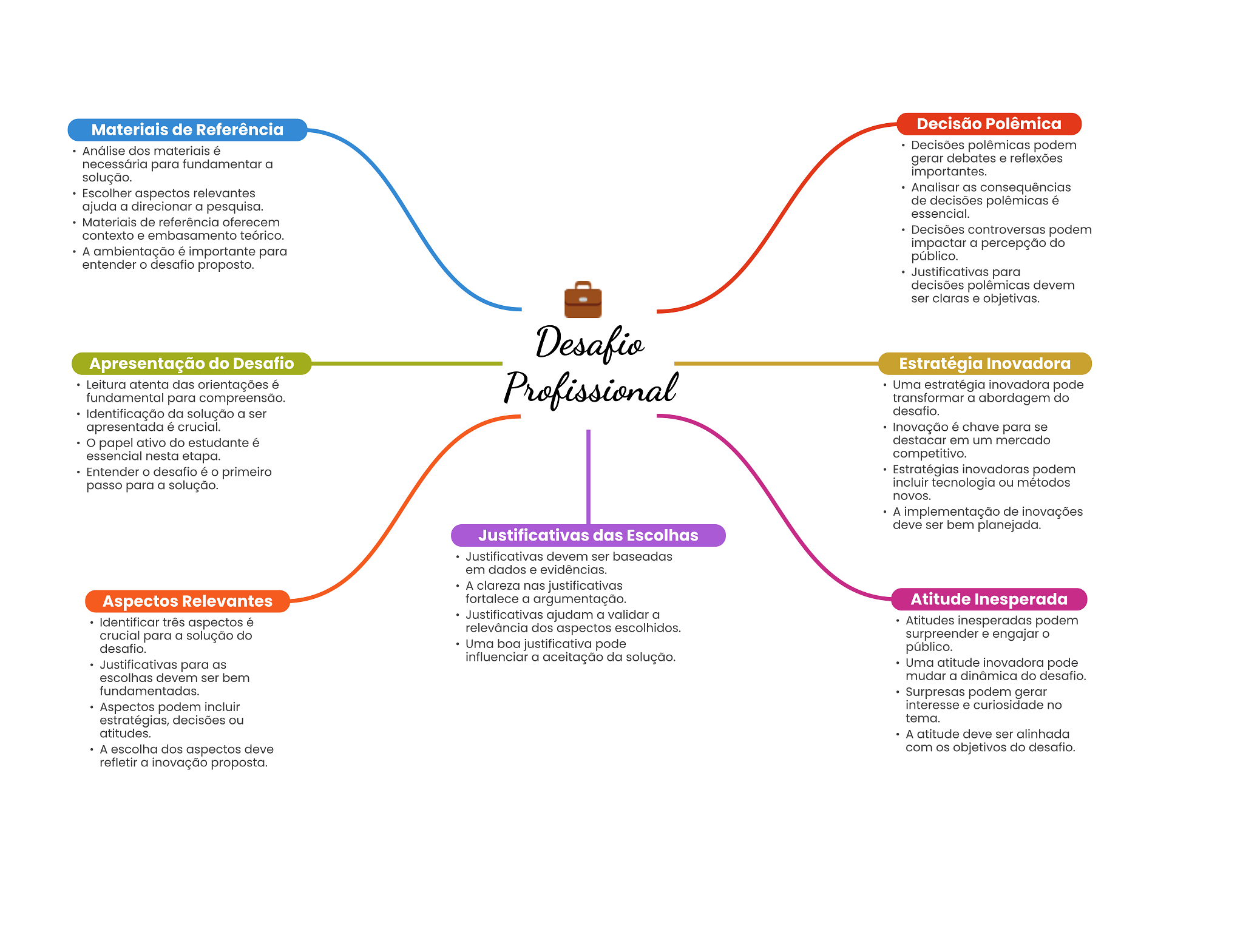 Materiais de Referência Decisão Polêmica Análise dos materiais é Decisões polêmicas podem necessária para fundamentar a gerar debates e reflexões solução. importantes. Escolher aspectos relevantes Analisar as consequências ajuda a direcionar a pesquisa. de decisões polêmicas é essencial. Materiais de referência oferecem contexto e embasamento teórico. Decisões controversas podem impactar a percepção do A ambientação é importante para público. entender desafio proposto. Justificativas para decisões polêmicas devem ser claras e objetivas. Desafio Apresentação do Desafio Estratégia Inovadora Leitura atenta das orientações é Profissional Uma estratégia inovadora pode fundamental para compreensão. transformar a abordagem do Identificação da solução a ser desafio. apresentada é crucial. Inovação é chave para se papel ativo do estudante é destacar em um mercado essencial nesta etapa. competitivo. Entender desafio é primeiro Estratégias inovadoras podem passo para a solução. incluir tecnologia ou métodos novos. A implementação de inovações deve ser bem planejada. Justificativas das Escolhas Justificativas devem ser baseadas em dados e evidências. A clareza nas justificativas Aspectos Relevantes fortalece a argumentação. Atitude Inesperada Justificativas ajudam a validar a Identificar três aspectos é Atitudes inesperadas podem relevância dos aspectos escolhidos. crucial para a solução do surpreender e engajar desafio. Uma boa justificativa pode público. influenciar a aceitação da solução. Justificativas para as Uma atitude inovadora pode escolhas devem ser bem mudar a dinâmica do desafio. fundamentadas. Surpresas podem gerar Aspectos podem incluir interesse e curiosidade no estratégias, decisões ou tema. atitudes. A atitude deve ser alinhada A escolha dos aspectos deve com objetivos do desafio. refletir a inovação proposta.