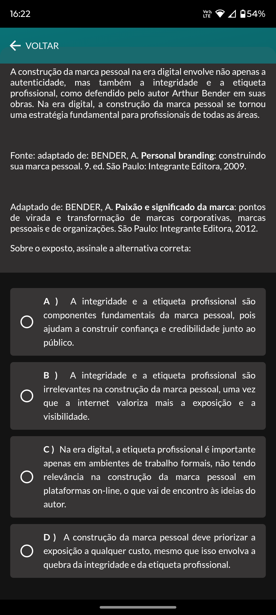 16:22 LTE 54% VOLTAR A construção da marca pessoal na era digital envolve não apenas a autenticidade, mas também a integridade e a etiqueta profissional, como defendido pelo autor Arthur Bender em suas obras. Na era digital, a construção da marca pessoal se tornou uma estratégia fundamental para profissionais de todas as áreas. Fonte: adaptado de: BENDER, A. Personal branding: construindo sua marca pessoal. 9. ed. São Paulo: Integrante Editora, 2009. Adaptado de: BENDER, A. Paixão e significado da marca: pontos de virada e transformação de marcas corporativas, marcas pessoais e de organizações. São Paulo: Integrante Editora, 2012. Sobre exposto, assinale a alternativa correta: ) A integridade e a etiqueta profissional são componentes fundamentais da marca pessoal, pois ajudam a construir confiança e credibilidade junto ao público. ) A integridade e a etiqueta profissional são irrelevantes na construção da marca pessoal, uma vez que a internet valoriza mais a exposição e a visibilidade. C) Na era digital, a etiqueta profissional é importante apenas em ambientes de trabalho formais, não tendo relevância na construção da marca pessoal em plataformas on-line, que vai de encontro às ideias do autor. construção da marca pessoal deve priorizar a exposição a qualquer custo, mesmo que isso envolva a quebra da integridade e da etiqueta profissional.
