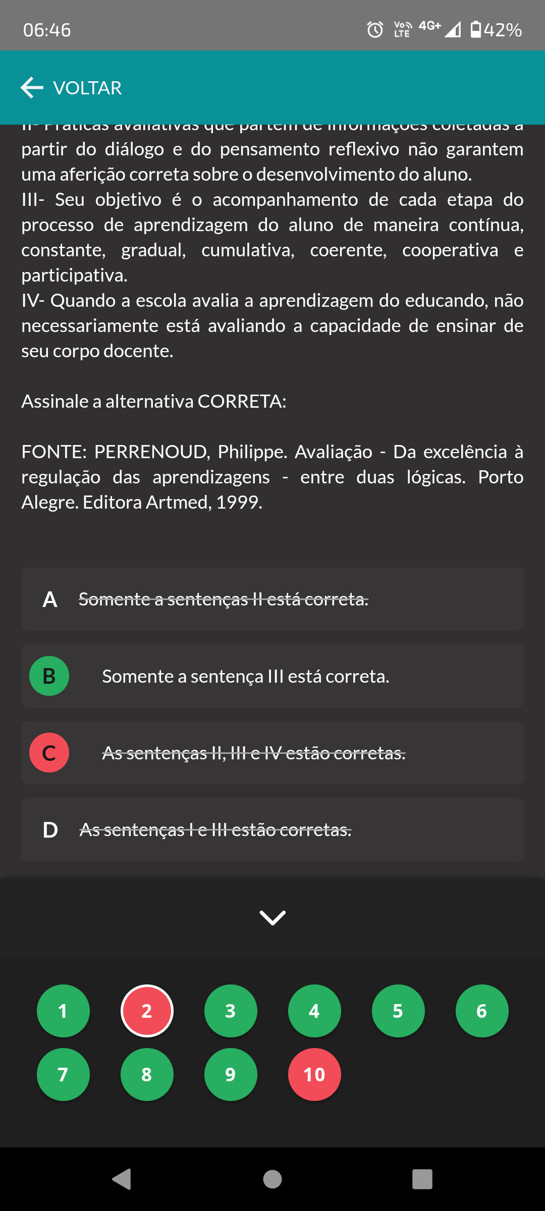 06:46 4G+ LTE 42% VOLTAR que a partir do diálogo e do pensamento reflexivo não garantem uma aferição correta sobre o desenvolvimento do aluno. III- Seu objetivo é acompanhamento de cada etapa do processo de aprendizagem do aluno de maneira contínua, constante, gradual, cumulativa, coerente, cooperativa e participativa. IV- Quando a escola avalia a aprendizagem do educando, não necessariamente está avaliando a capacidade de ensinar de seu corpo docente. Assinale a alternativa CORRETA: FONTE: PERRENOUD, Philippe. Avaliação Da excelência à regulação das aprendizagens entre duas lógicas. Porto Alegre. Editora Artmed, 1999. Somente a sentenças H está correta. B Somente a sentença III está correta. As sentenças H, IV estão corretas. D As sentenças le estão corretas. 1 2 3 4 5 6 7 8 9 10