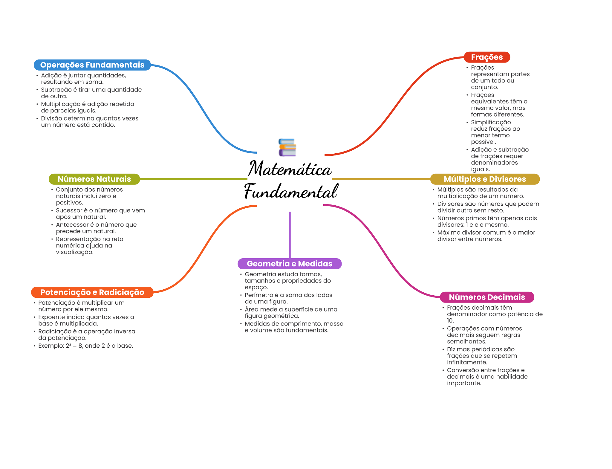 Frações Operações Fundamentais Frações Adição é juntar quantidades, representam partes resultando em soma. de um todo ou Subtração é tirar uma quantidade conjunto. de outra. Frações Multiplicação é adição repetida equivalentes têm O de parcelas iguais. mesmo valor, mas formas diferentes. Divisão determina quantas vezes um número está contido. Simplificação reduz frações ao menor termo possível. Adição e subtração de frações requer Matemática denominadores iguais. Números Naturais Múltiplos e Divisores Conjunto dos números naturais inclui zero e Fundamental Múltiplos são resultados da multiplicação de um número. positivos. Divisores são números que podem Sucessor é número que vem dividir outro sem resto. após um natural. Números primos têm apenas dois Antecessor é número que divisores: 1 e ele mesmo. precede um natural. Máximo divisor comum é O maior Representação na reta divisor entre números. numérica ajuda na visualização. Geometria e Medidas Geometria estuda formas, tamanhos e propriedades do espaço. Potenciação e Radiciação Perímetro é a soma dos lados Números Decimais Potenciação é multiplicar um de uma figura. número por ele mesmo. Área mede a superfície de uma Frações decimais têm Expoente indica quantas vezes a figura geométrica. denominador como potência de 10. base é multiplicada. Medidas de comprimento, massa Radiciação é a operação inversa e volume são fundamentais. Operações com números da potenciação. decimais seguem regras semelhantes. Exemplo: 2³ = 8, onde 2 é a base. Dízimas periódicas são frações que se repetem infinitamente. Conversão entre frações e decimais é uma habilidade importante.