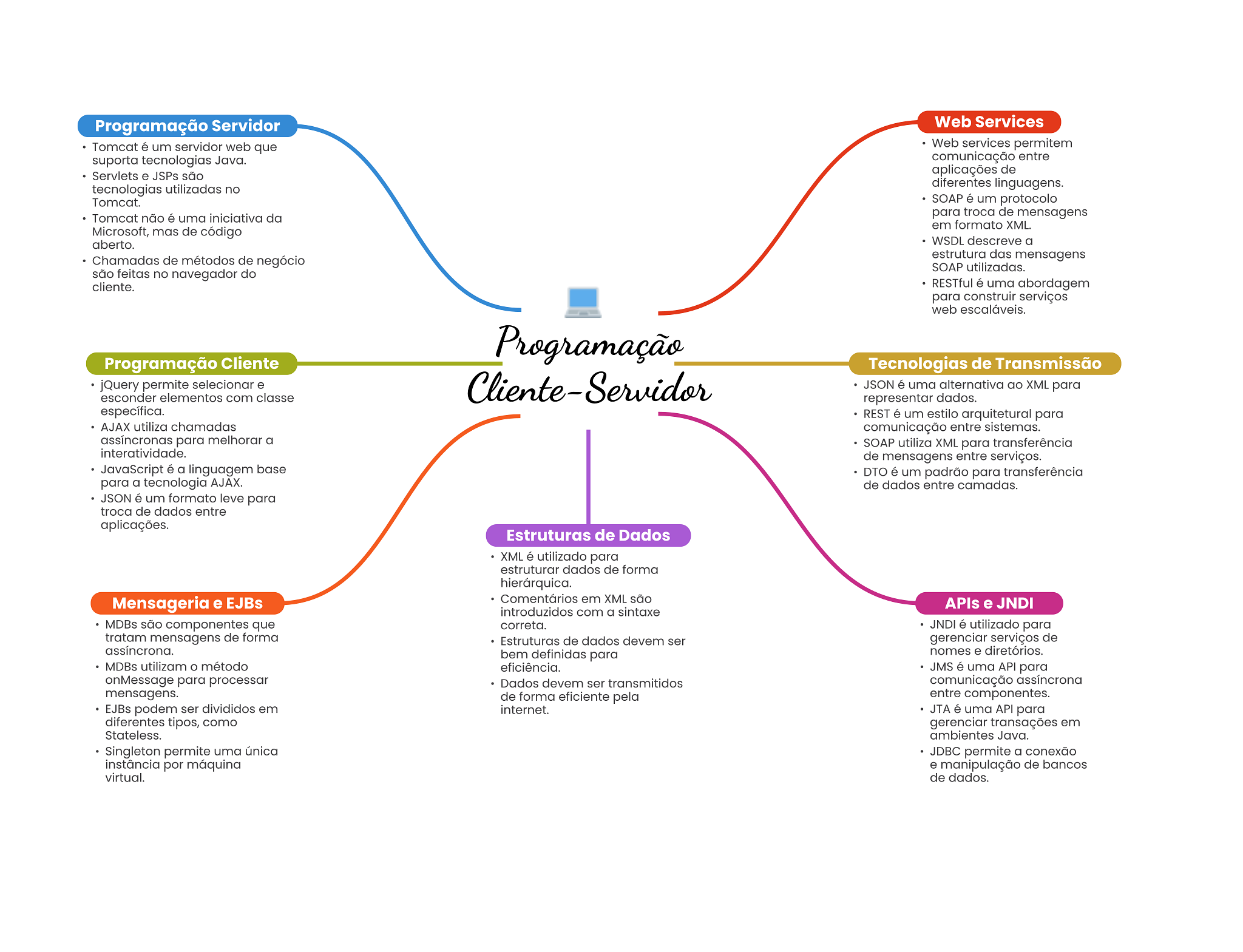 Programação Servidor Web Services Tomcat é um servidor web que Web services permitem suporta tecnologias Java. comunicação entre Servlets e JSPs são aplicações de tecnologias utilizadas no diferentes linguagens. Tomcat. SOAP é um protocolo Tomcat não é uma iniciativa da para troca de mensagens em formato XML. Microsoft, mas de código aberto. WSDL descreve a Chamadas de métodos de negócio estrutura das mensagens SOAP utilizadas. são feitas no navegador do cliente. RESTful é uma abordagem para construir serviços web escaláveis. Programação Programação Cliente Tecnologias de Transmissão jQuery permite selecionar e esconder elementos com classe Cliente-Servidor JSON é uma alternativa ao XML para representar dados. específica. REST é um estilo arquitetural para AJAX utiliza chamadas comunicação entre sistemas. assíncronas para melhorar a SOAP utiliza XML para transferência interatividade. de mensagens entre serviços. JavaScript é a linguagem base DTO é um padrão para transferência para a tecnologia AJAX. de dados entre camadas. JSON é um formato leve para troca de dados entre aplicações. Estruturas de Dados XML é utilizado para estruturar dados de forma hierárquica. Mensageria e EJBs Comentários em XML são APIs e JNDI introduzidos com a sintaxe MDBs são componentes que correta. JNDI é utilizado para tratam mensagens de forma Estruturas de dados devem ser gerenciar serviços de assíncrona. bem definidas para nomes e diretórios. MDBs utilizam método eficiência. JMS é uma API para onMessage para processar Dados devem ser transmitidos comunicação assíncrona mensagens. de forma eficiente pela entre componentes. EJBs podem ser divididos em internet. JTA é uma API para diferentes tipos, como gerenciar transações em Stateless. ambientes Java. Singleton permite uma única JDBC permite a conexão instância por máquina e manipulação de bancos virtual. de dados.