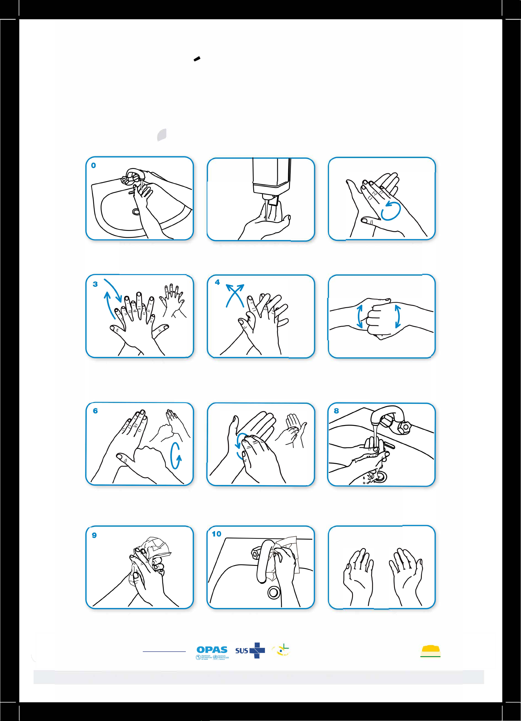 Como Higienizar as Mãos com Agua e Sabonete? Higienize as mãos com água e sabonete apenas quando estiverem visivelmente sujas! Senão, friccione as mãos com preparações alcoólicas! © Duração de todo o procedimento: 40-60 seg. Molhe as mãos com água. Esfregue a palma da mão direita contra o dorso da mão esquerda entrelaçando os dedos e vice-versa. Esfregue o polegar esquerdo com o auxílio da palma da mão direita, utilizando-se de movimento circular e vice-versa. Seque as mãos com papel toalha descartável. (@cP�) World Health ��§ Organization � WORLD ALLIANCE /orPATIENT SAFETY 1 Aplique na palma da mão quantidade suficiente de sabonete líquido para cobrir todas as superfícies das mãos. Entrelace os dedos e friccione os espaços interdigitais. 7 Friccione as polpas digitais e unhas da mão direita contra a palma da mão esquerda, fazendo movimento circular e vice-versa. No caso de torneiras com contato manual para fechamento, sempre utilize papel toalha. 2 Ensaboe as palmas das mãos, friccionando-as entre si. 5 Esfregue o dorso dos dedos de uma mão com a palma da mão oposta, segurando os dedos, com movimento de vai e vem e vice-versa. 11 Enxague bem as mãos com água. Agora, suas mãos estão seguras. _1 ...... ANVISA MINISTÉRIO DA e� SAÚDE .-7P Agência Nacional de Vigilância Sanitária A OMS agradece ao Hospital Universitário de Genebra (HUG), em especial aos membros do Programa de Controle de Infecção, pela participação ativa no desenvolvimento deste material. A Organização Mundial de Saúde tomou todas as precauções cabíveis para verificar a informação contida neste informativo. Entretanto, o material publicado está sendo distribuído sem qualquer garantia expressa ou implícita. A responsabilidade pela interpretação e uso deste material é do leitor. A Organização Mundial de Saúde não se responsabilizará em hipótese alguma pelos danos provocados pelo seu uso.