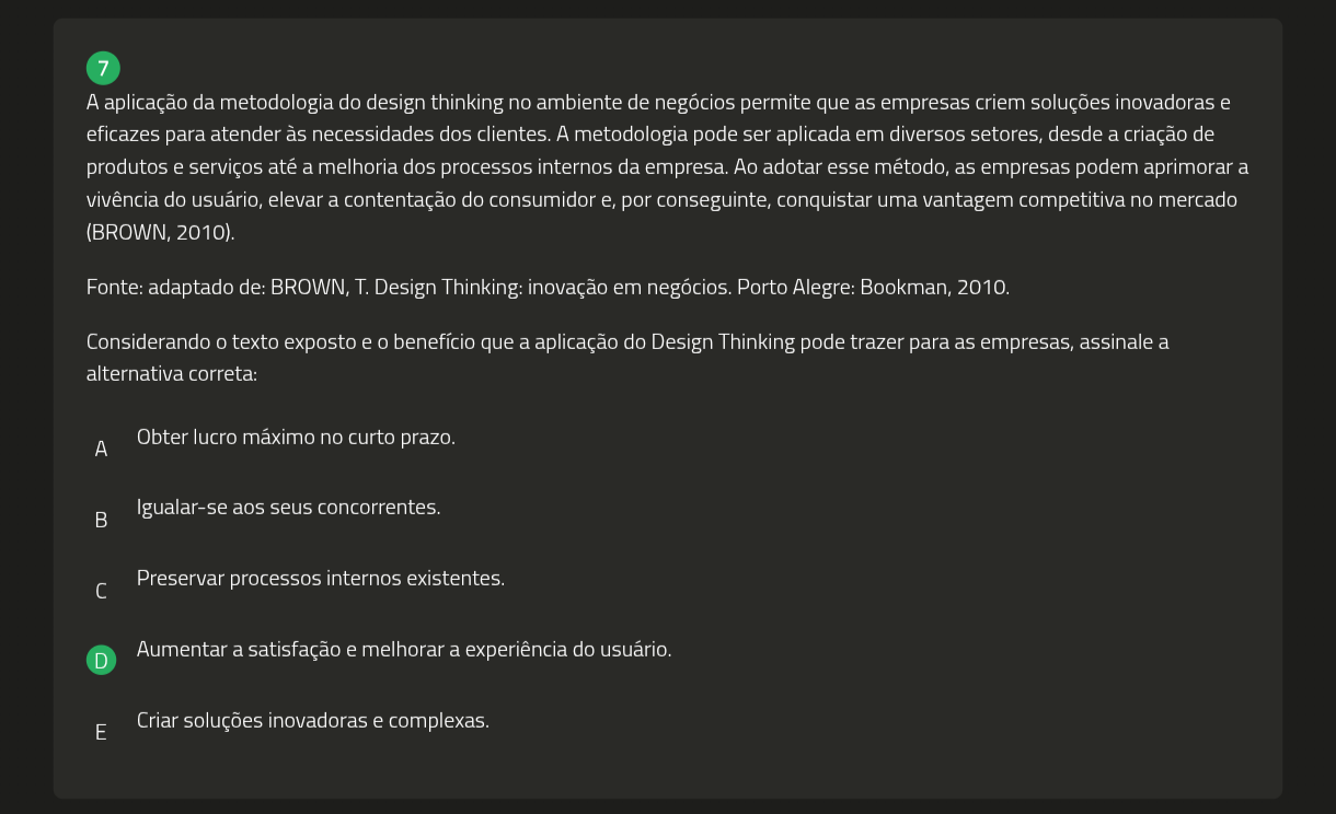 7 A aplicação da metodologia do design thinking no ambiente de negócios permite que as empresas criem soluções inovadoras e eficazes para atender às necessidades dos clientes. A metodologia pode ser aplicada em diversos setores, desde a criação de produtos e serviços até a melhoria dos processos internos da empresa. Ao adotar esse método, as empresas podem aprimorar a vivência do usuário, elevar a contentação do consumidor e, por conseguinte, conquistar uma vantagem competitiva no mercado (BROWN, 2010). Fonte: adaptado de: BROWN, T. Design Thinking: inovação em negócios. Porto Alegre: Bookman, 2010. Considerando texto exposto e 0 benefício que a aplicação do Design Thinking pode trazer para as empresas, assinale a alternativa correta: A Obter lucro máximo no curto prazo. Igualar-se aos seus concorrentes. Preservar processos internos existentes. D Aumentar a satisfação e melhorar a experiência do usuário. E Criar soluções inovadoras e complexas.
