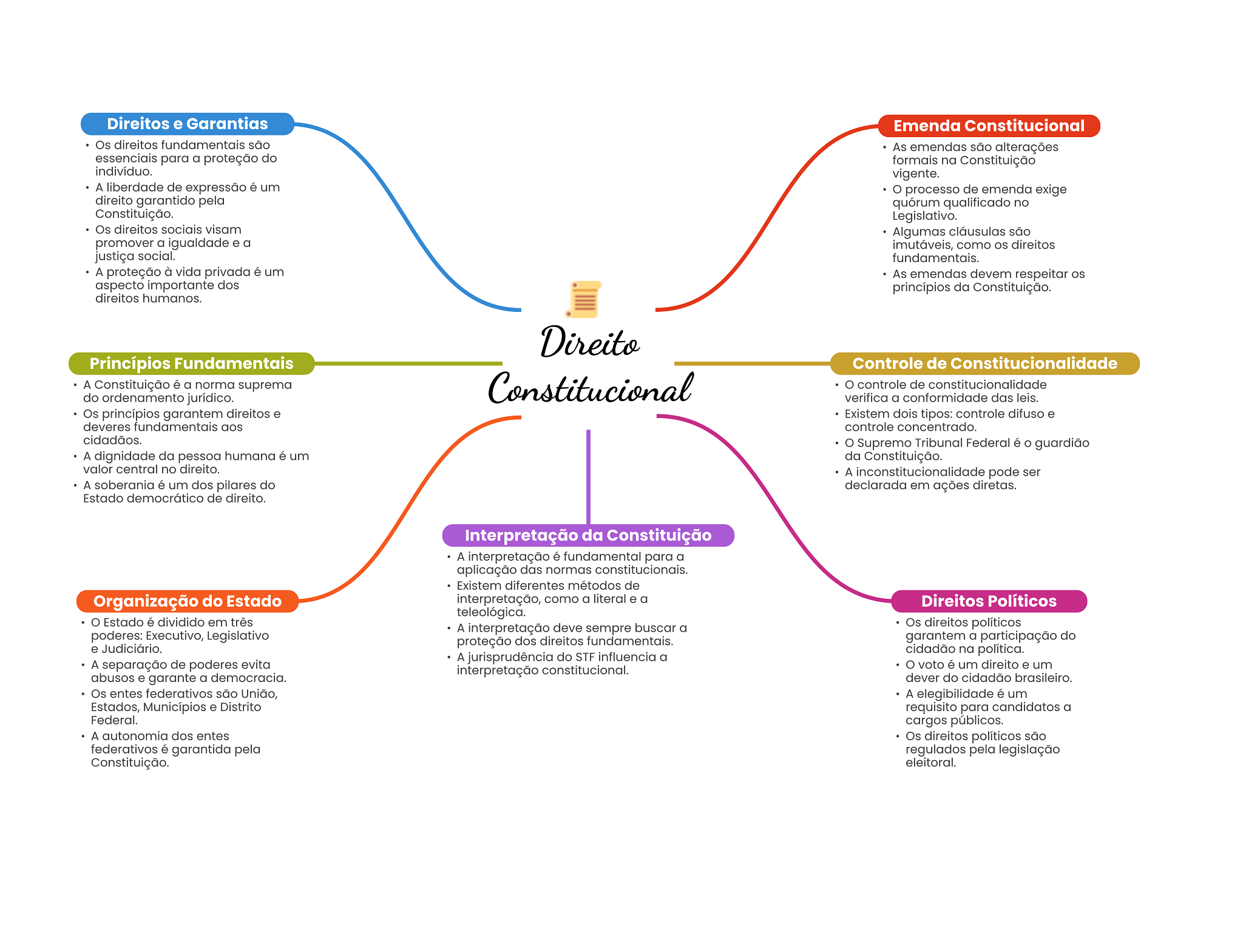 Direitos e Garantias Emenda Constitucional Os direitos fundamentais são As emendas são alterações essenciais para a proteção do formais na Constituição indivíduo. vigente. A liberdade de expressão é um O processo de emenda exige direito garantido pela quórum qualificado no Constituição. Legislativo. Os direitos sociais visam Algumas cláusulas são promover a igualdade e a imutáveis, como direitos justiça social. fundamentais. A proteção à vida privada é um As emendas devem respeitar aspecto importante dos princípios da Constituição. direitos humanos. Direito Princípios Fundamentais Controle de Constitucionalidade A Constituição é a norma suprema Constitucional controle de constitucionalidade do ordenamento jurídico. verifica a conformidade das leis. Os princípios garantem direitos e Existem dois tipos: controle difuso e deveres fundamentais aos controle concentrado. cidadãos. O Supremo Tribunal Federal é guardião A dignidade da pessoa humana é um da Constituição. valor central no direito. A inconstitucionalidade pode ser A soberania é um dos pilares do declarada em ações diretas. Estado democrático de direito. Interpretação da Constituição A interpretação é fundamental para a aplicação das normas constitucionais. Existem diferentes métodos de Organização do Estado interpretação, como a literal e a Direitos Políticos teleológica. Estado é dividido em três A interpretação deve sempre buscar a Os direitos políticos poderes: Executivo, Legislativo proteção dos direitos fundamentais. garantem a participação do e Judiciário. cidadão na política. A jurisprudência do STF influencia a A separação de poderes evita voto é um direito e um interpretação constitucional. abusos e garante a democracia. dever do cidadão brasileiro. Os entes federativos são União, A elegibilidade é um Estados, Municípios e Distrito requisito para candidatos a Federal. cargos públicos. A autonomia dos entes Os direitos políticos são federativos é garantida pela regulados pela legislação Constituição. eleitoral.