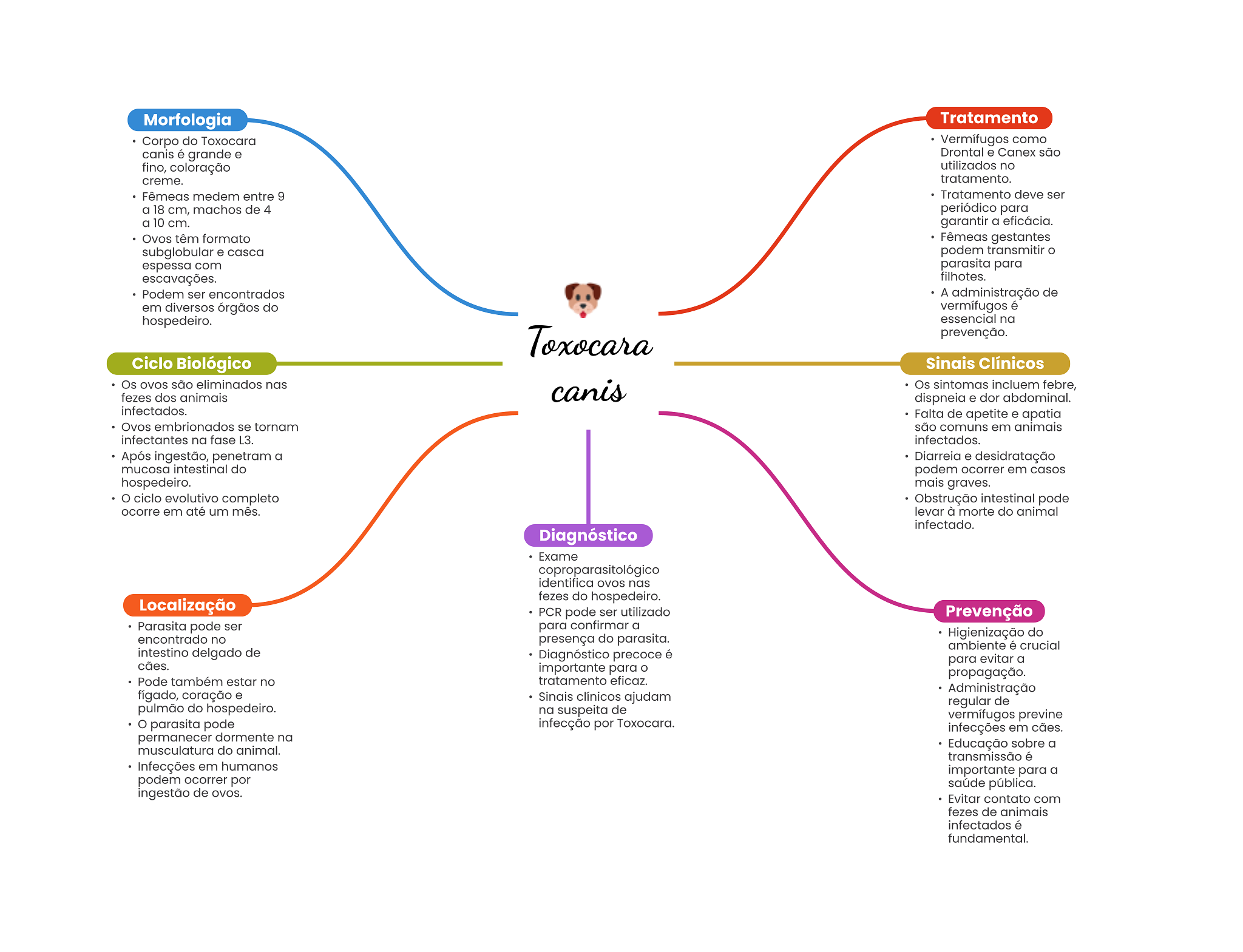 Morfologia Tratamento Corpo do Toxocara Vermífugos como canis é grande e Drontal e Canex são fino, coloração utilizados no creme. tratamento. Fêmeas medem entre 9 Tratamento deve ser a 18 cm, machos de 4 periódico para a 10 cm. garantir a eficácia. Ovos têm formato Fêmeas gestantes subglobular e casca podem transmitir espessa com parasita para escavações. filhotes. Podem ser encontrados A administração de em diversos órgãos do vermífugos é hospedeiro. essencial na Toxocara prevenção. Ciclo Biológico Sinais Clínicos Os ovos são eliminados nas canis Os sintomas incluem febre, fezes dos animais dispneia e dor abdominal. infectados. Falta de apetite e apatia Ovos embrionados se tornam são comuns em animais infectantes na fase L3. infectados. Após ingestão, penetram a Diarreia e desidratação mucosa intestinal do podem ocorrer em casos hospedeiro. mais graves. ciclo evolutivo completo Obstrução intestinal pode ocorre em até um mês. levar à morte do animal infectado. Diagnóstico Exame coproparasitológico identifica ovos nas fezes do hospedeiro. Localização PCR pode ser utilizado Prevenção Parasita pode ser para confirmar a encontrado no presença do parasita. Higienização do ambiente é crucial intestino delgado de Diagnóstico precoce é cães. para evitar a importante para O propagação. Pode também estar no tratamento eficaz. fígado, coração e Administração Sinais clínicos ajudam regular de pulmão do hospedeiro. na suspeita de vermífugos previne parasita pode infecção por Toxocara. infecções em cães. permanecer dormente na Educação sobre a musculatura do animal. transmissão é Infecções em humanos importante para a podem ocorrer por saúde pública. ingestão de Evitar contato com fezes de animais infectados é fundamental.
