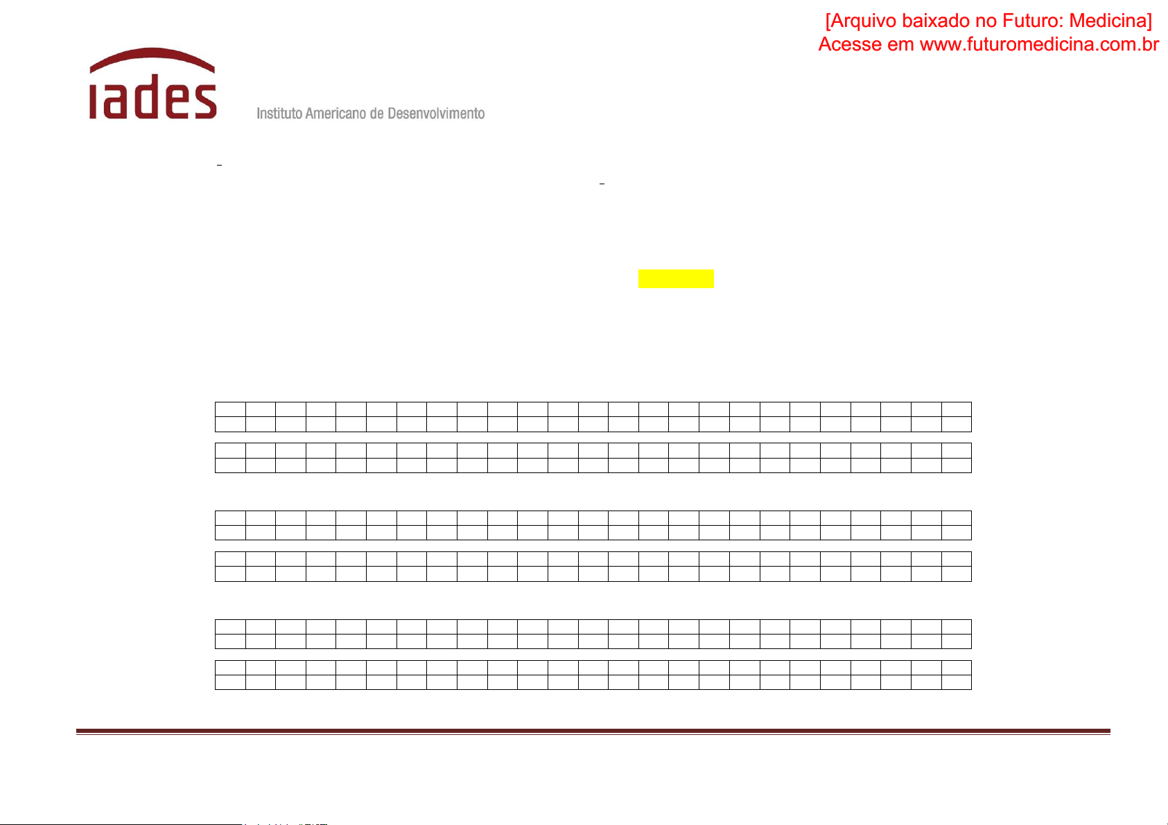 Instituto Americano de Desenvolvimento - IADES – www.iamericano.org.br Página 1 QE 32 Conjunto C Lote 2 – Guará II – Brasília – DF Fone: (61) 3574.7200 – Fax: (61) 3574.7200– e-mail: cac@iades.com.br 1o PROCESSO SELETIVO DE 2018 VESTIBULAR – UNIVERSIDADE CATÓLICA DE BRASÍLIA (UCB) EDITAL No 912/2018 GABARITO PRELIMINAR DAS PROVAS OBJETIVAS (Gabarito divulgado em 11/12/2017) DIVUGAÇÃO: 10h) Medicina Medicina – Prova Tipo “A” 1 2 3 4 5 6 7 8 9 10 11 12 13 14 15 16 17 18 19 20 21 22 23 24 25 C E D B C B C D C B E D C A B B C E D B C E B E E 26 27 28 29 30 31 32 33 34 35 36 37 38 39 40 41 42 43 44 45 46 47 48 49 50 B E C A D C D A A C A D E A A C A E B A B D D E A Medicina – Prova Tipo “B” 1 2 3 4 5 6 7 8 9 10 11 12 13 14 15 16 17 18 19 20 21 22 23 24 25 B A E E D D B A B E D B D B A E C B C E D A B E A 26 27 28 29 30 31 32 33 34 35 36 37 38 39 40 41 42 43 44 45 46 47 48 49 50 C E C D A A C D C E C B D B D D A C D A C C A B E Medicina – Prova Tipo “C” 1 2 3 4 5 6 7 8 9 10 11 12 13 14 15 16 17 18 19 20 21 22 23 24 25 E B A A D E D E E B A E D B B C E C A B E B C A C 26 27 28 29 30 31 32 33 34 35 36 37 38 39 40 41 42 43 44 45 46 47 48 49 50 D C B E C E D A D A E E B D B C A D B C D A D E B [Arquivo baixado no Futuro: Medicina] Acesse em www.futuromedicina.com.br [Arquivo baixado no Futuro: Medicina] Acesse em www.futuromedicina.com.br [Arquivo baixado no Futuro: Medicina] Acesse em www.futuromedicina.com.br [Arquivo baixado no Futuro: Medicina] Acesse em www.futuromedicina.com.br Instituto Americano de Desenvolvimento - IADES – www.iamericano.org.br Página 2 QE 32 Conjunto C Lote 2 – Guará II – Brasília – DF Fone: (61) 3574.7200 – Fax: (61) 3574.7200– e-mail: cac@iades.com.br Medicina – Prova Tipo “D” 1 2 3 4 5 6 7 8 9 10 11 12 13 14 15 16 17 18 19 20 21 22 23 24 25 D B A C E D B E C E A B C A D A B E C E D C A B D 26 27 28 29 30 31 32 33 34 35 36 37 38 39 40 41 42 43 44 45 46 47 48 49 50 B A D B C C D E B A A C E D C D C C D C B E A E A Brasília-DF, 11 de dezembro de 2017. Coordenação Pedagógica Instituto Americano de Desenvolvimento – IADES [Arquivo baixado no Futuro: Medicina] Acesse em www.futuromedicina.com.br [Arquivo baixado no Futuro: Medicina] Acesse em www.futuromedicina.com.br [Arquivo baixado no Futuro: Medicina] Acesse em www.futuromedicina.com.br [Arquivo baixado no Futuro: Medicina] Acesse em www.futuromedicina.com.br