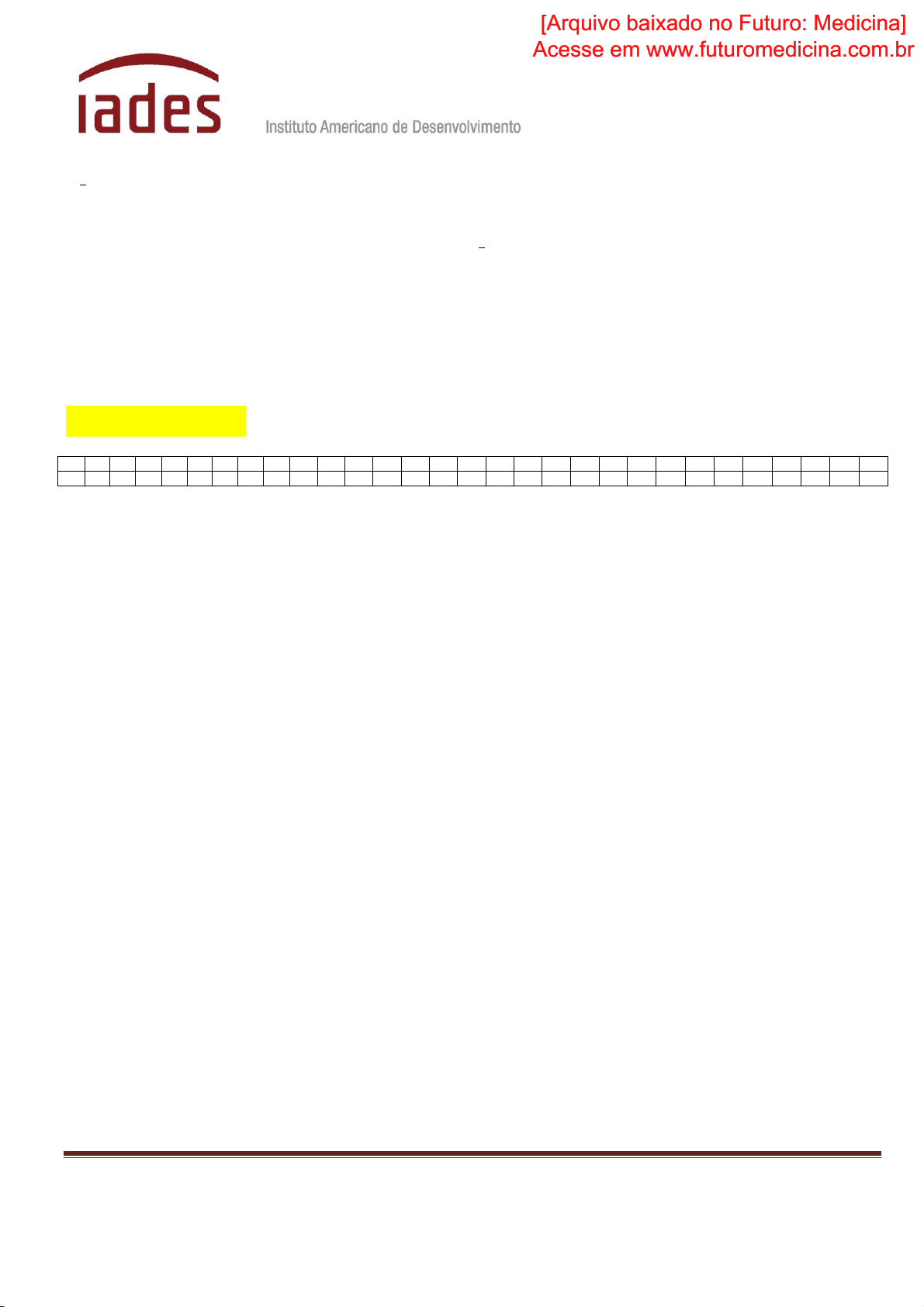 Instituto Americano de Desenvolvimento - IADES – www.iamericano.org.br Página 1 QE 32 Conjunto C Lote 2 – Guará II – Brasília – DF Fone: (61) 3574.7200 – Fax: (61) 3574.7200– e-mail: cac@iades.com.br 2o PROCESSO SELETIVO DE 2018 VESTIBULAR – UNIVERSIDADE CATÓLICA DE BRASÍLIA (UCB) EDITAL No 955/2018 GABARITO PRELIMINAR DA PROVA OBJETIVA (Gabarito divulgado em 09/07/2018 – 09 horas) Demais Cursos 1 2 3 4 5 6 7 8 9 10 11 12 13 14 15 16 17 18 19 20 21 22 23 24 25 26 27 28 29 30 D B E A C B E C A D C E B D A C B A E D C B A D E D B E C A Brasília-DF, 9 de julho de 2018. Coordenação Pedagógica Instituto Americano de Desenvolvimento - IADES [Arquivo baixado no Futuro: Medicina] Acesse em www.futuromedicina.com.br [Arquivo baixado no Futuro: Medicina] Acesse em www.futuromedicina.com.br [Arquivo baixado no Futuro: Medicina] Acesse em www.futuromedicina.com.br [Arquivo baixado no Futuro: Medicina] Acesse em www.futuromedicina.com.br
