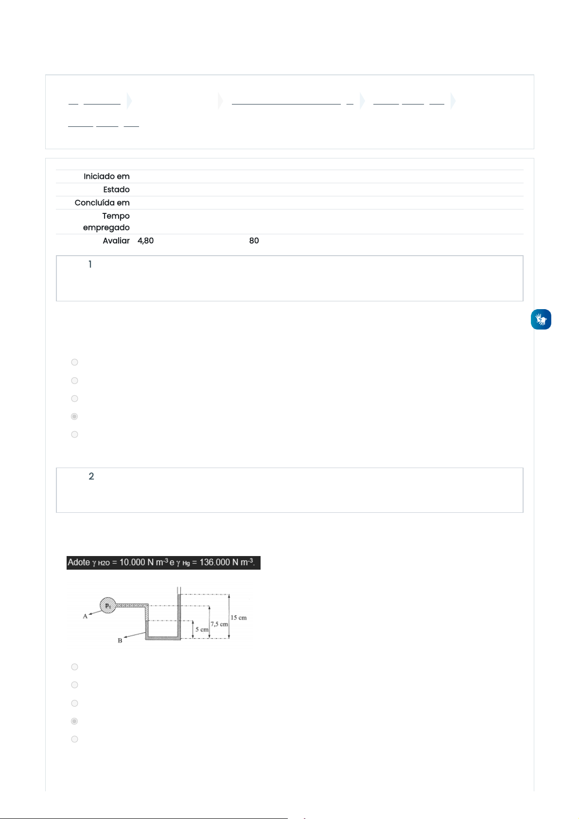 24/01/22, 09:25 Avaliação Regular: Revisão da tentativa https://ambienteonline.uninga.br/mod/quiz/review.php?attempt=833389&cmid=172344 1/6 Página inicial Minhas disciplinas 2021/3 - Hidráulica e Hidrologia Avaliação Regular Avaliação Regular Iniciado em quinta, 28 out 2021, 20:06 Estado Finalizada Concluída em quinta, 28 out 2021, 21:11 Tempo empregado 1 hora 5 minutos Avaliar 4,80 de um máximo de 6,00(80%) Questão 1 Correto Atingiu 0,60 de 0,60 Questão 2 Correto Atingiu 0,60 de 0,60 Determine a massa específica e o peso específico de 6 m³ de óleo que apresenta a massa correspondente a 5.400 kg. a. 8.000 kN m e 800 kg m b. 9.000 kN m e 900 kg m c. 8 kN m e 800 kg m d. 9 kN m e 900 kg m e. 7,5 kN m e 750 kg m -3 -3 -3 -3 -3 -3 -3 -3 -3 -3 (BRUNETTI, F. Mecânica dos fluidos). No manômetro o fluido A é água e o fluido B é mercúrio. Qual será a pressão em P1? a. 18,4 kPa b. 15,67 kPa c. 12,9 kPa d. 13,35 kPa e. 21,4 kPa https://ambienteonline.uninga.br/ https://ambienteonline.uninga.br/course/view.php?id=7955 https://ambienteonline.uninga.br/course/view.php?id=7955§ion=8 https://ambienteonline.uninga.br/mod/quiz/view.php?id=172344 24/01/22, 09:25 Avaliação Regular: Revisão da tentativa https://ambienteonline.uninga.br/mod/quiz/review.php?attempt=833389&cmid=172344 2/6 Questão 3 Correto Atingiu 0,60 de 0,60 Questão 4 Correto Atingiu 0,60 de 0,60 (USP, 1996). Considerando o fluido A igual a água e o fluido B igual tetracloreto de carbono (d = 1,5), tomando z como a 559 mm e y como 300 mm. A pressão em M será: i. 759,7 kg m ii. 659,1 kg m iii. 458,3 kg m iv. 538,5 kg m a. Somente a alternativa I é correta b. Todas as alternativas estão incorretas c. Somente a alternativa II é correta d. Somente a alternativa III é correta e. Somente a alternativa IV é correta -2 -2 -2 -2 A água escoando por um conduto de seção crescente com vazão constante, indica: a. Regime permanente uniforme b. Regime não permanente c. Regime permanente e não uniforme d. Todas as alternativas estão incorretas e. Regime de transição 24/01/22, 09:25 Avaliação Regular: Revisão da tentativa https://ambienteonline.uninga.br/mod/quiz/review.php?attempt=833389&cmid=172344 3/6 Questão 5 Correto Atingiu 0,60 de 0,60 Questão 6 Correto Atingiu 0,60 de 0,60 (ESALQ, 2020). Qual será a perda de carga entre os pontos 1 e 2 apresentados na esquema a seguir: a. 21,3 mca b. 18,7 mca c. 22,7 mca d. 15,8 mca e. 11,8 mca Comentário: [cancelada] Considere as seguintes características: - Diâmetro da tubulação = 75 cm; - Velocidade média do fluido = 1,5 m s ; - Viscosidade cinemática do fluido = 1,61 x 10 m s ; Qual será o número de Reynolds? O regime será laminar ou turbulento? a. 7 x 10 escoamento turbulento b. 7 x 10 escoamento laminar c. 7 x 10 escoamento turbulento d. 7 x 10 escoamento turbulento e. 7 x 10 escoamento laminar -1 -4 2 -1 5 6 6 3 3 24/01/22, 09:25 Avaliação Regular: Revisão da tentativa https://ambienteonline.uninga.br/mod/quiz/review.php?attempt=833389&cmid=172344 4/6 Questão 7 Incorreto Atingiu 0,00 de 0,60 Questão 8 Correto Atingiu 0,60 de 0,60 A tubulação que liga uma represa e um reservatório tem 1.300 m de comprimento e 600 mm de diâmetro e é executada em concreto com acabamento comum (e = 0,4 mm). Determine a cota do nível de água (NA ) na represa sabendo-se que a vazão transportada é de 250 L s e que o nível de água no reservatório inferior (NA ) está na cota 10 m. a. 15,6 m b. 10,2 m c. 11,55 m d. 8,4 m e. 7,3 m 1 -1 2 (UNESP, 2016). No abastecimento de 5 casas, igualmente espaçadas de 100 m e com essa mesma distância da caixa d’água até a primeira casa, têm-se: consumo de cada casa igual a 0,5 L s ; diâmetro da rede igual a 2” e o material da tubulação é de PVC. Empregando a Fórmula de Hazen-Williams e o fator F de Christiansen, qual será a perda de carga da captação até a última casa? a. 6 mca b. 7 mca c. 9 mca d. 5 mca e. 8 mca -1 24/01/22, 09:25 Avaliação Regular: Revisão da tentativa https://ambienteonline.uninga.br/mod/quiz/review.php?attempt=833389&cmid=172344 5/6 Questão 9 Correto Atingiu 0,60 de 0,60 Questão 10 Incorreto Atingiu 0,00 de 0,60 (UNESP, 2016) Um sistema de bombeamento está instalado a 900 m de altitude, bombeando água a 50 ºC. A altura do eixo da bomba em relação ao nível d’água no reservatório de captação é 5,31 m e a perda de carga calculada para a tubulação de sucção é 0,20 m. Sabendo-se que será utilizada a bomba KSB ANS 40-250, verificar até que vazão poderá ser bombeada, admitindo-se NPSH – NPSH ≥ 0,5 m. DADOS: a. 36,2 m h b. 29,9 m h c. 25,1 m h d. 32,3 m h e. 18,4 m h disponível exigido 3 -1 3 -1 3 -1 3 -1 3 -1 (CARVALHO, J. A. Captação, elevação e condução de água). Uma determinada bomba deverá ser instalada em uma localidade com 1200 m para recalcar água a uma temperatura de 20º C. A velocidade da água na entrada da bomba é de 1,5 m s , a perda de carga na tubulação de sucção é de 2,5 m e o NPSH para a vazão de projeto é de 4,2 m. Qual será a altura máxima de sucção permita para essa situação? a. 2,1 m b. 2,4 m c. 1,2 m d. 1,6 m e. 1,8 m -1 exigido 24/01/22, 09:25 Avaliação Regular: Revisão da tentativa https://ambienteonline.uninga.br/mod/quiz/review.php?attempt=833389&cmid=172344 6/6 Atividade anterior ◄ Estudo de Caso Seguir para... Próxima atividade Avalie a sua disciplina ► Manter contato UNINGÁ https://www.uninga.br Mobile : 0800 800 5009 Obter o aplicativo para dispositivos móveis https://ambienteonline.uninga.br/mod/assign/view.php?id=172342&forceview=1 https://ambienteonline.uninga.br/mod/feedback/view.php?id=172343&forceview=1 https://www.uninga.br/ tel:Mobile : 0800 800 5009 https://www.facebook.com/uninga.edu.br/ https://www.youtube.com/channel/UCFfrZpSpL4DflIFl78P2TSQ https://www.instagram.com/uningaoficial/?hl=pt https://api.whatsapp.com/send?phone=44%2099825-1515 https://download.moodle.org/mobile?version=202