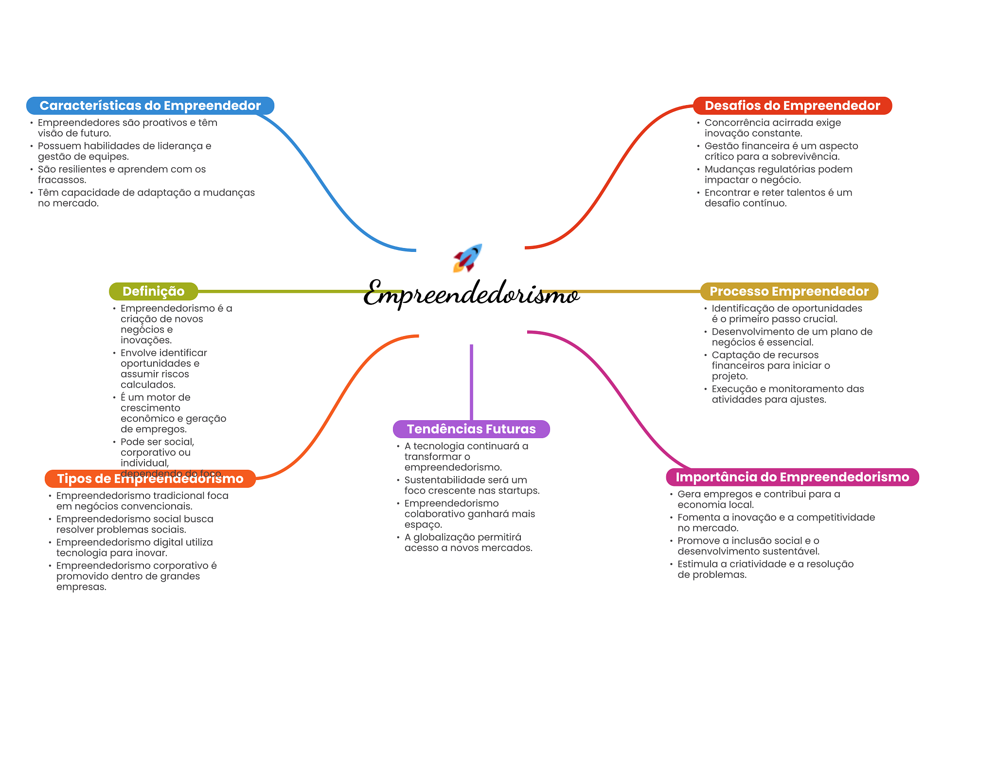 Características do Empreendedor Desafios do Empreendedor Empreendedores são proativos e têm Concorrência acirrada exige visão de futuro. inovação constante. Possuem habilidades de liderança e Gestão financeira é um aspecto gestão de equipes. crítico para a sobrevivência. São resilientes e aprendem com Mudanças regulatórias podem fracassos. impactar negócio. Têm capacidade de adaptação a mudanças Encontrar e reter talentos é um no mercado. desafio contínuo. Definição Empreendedorismo Processo Empreendedor Empreendedorismo é a Identificação de oportunidades criação de novos é primeiro passo crucial. negócios e Desenvolvimento de um plano de inovações. negócios é essencial. Envolve identificar Captação de recursos oportunidades e financeiros para iniciar assumir riscos projeto. calculados. Execução e monitoramento das É um motor de atividades para ajustes. crescimento econômico e geração de empregos. Tendências Futuras Pode ser social, A tecnologia continuará a corporativo ou transformar individual, empreendedorismo. Tipos de Empreendedorismo Sustentabilidade será um Importância do Empreendedorismo Empreendedorismo tradicional foca foco crescente nas startups. Gera empregos e contribui para a em negócios convencionais. Empreendedorismo economia local. Empreendedorismo social busca colaborativo ganhará mais Fomenta a inovação e a competitividade resolver problemas sociais. espaço. no mercado. Empreendedorismo digital utiliza A globalização permitirá Promove a inclusão social e O acesso a novos mercados. tecnologia para inovar. desenvolvimento sustentável. Empreendedorismo corporativo é Estimula a criatividade e a resolução promovido dentro de grandes de problemas. empresas.