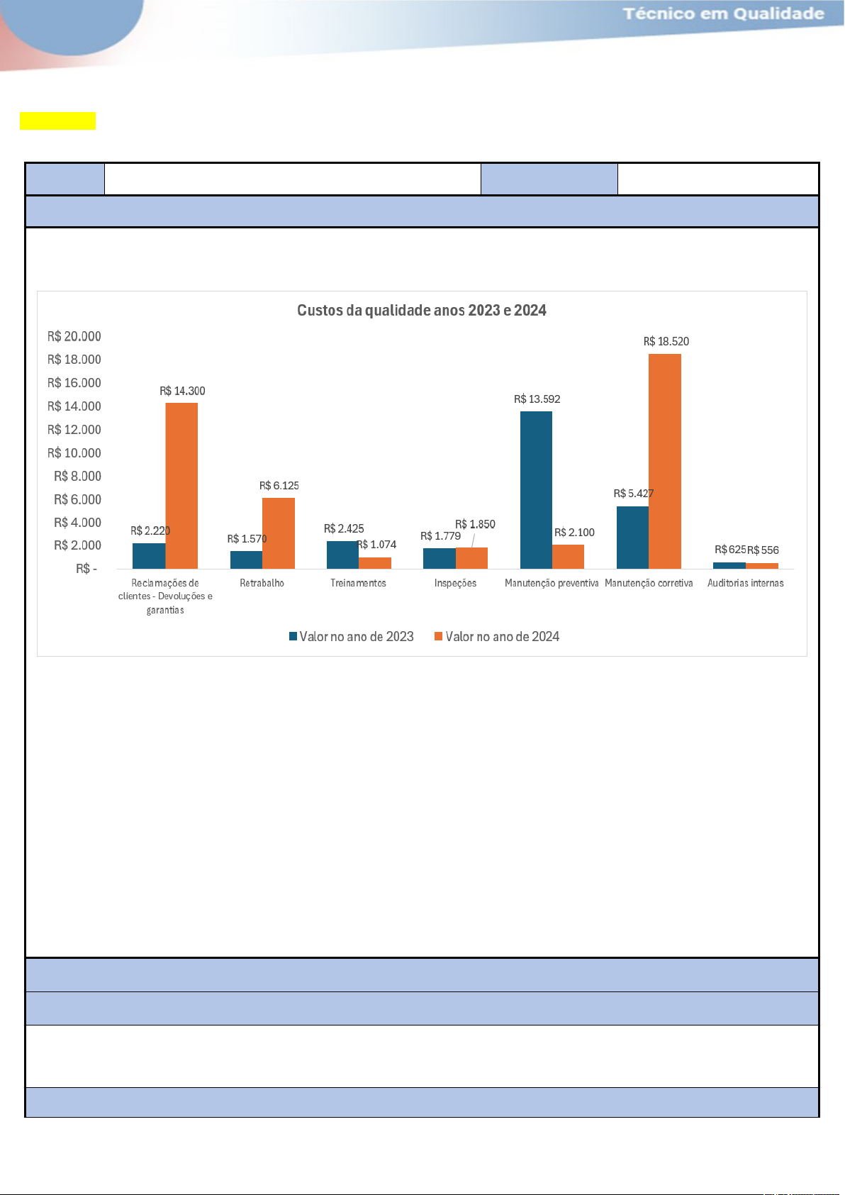 Atividade 2 – Relatório de implementação de ações de melhoria no SGQ Lembrete: as informações orientativas escritas na cor azul devem ser excluídas por você antes do envio da atividade. Portanto, utilize a fonte na cor preta para realizar toda a atividade. Nome: Daiane Gabriele De Assis Data: 04/03/2026 Informações fornecidas pelo gestor Durante a análise gerencial, identificou-se que, no ano de 2024, houve uma não conformidade referente ao aumento acentuado nos custos de qualidade, conforme o indicador a seguir. Esse aumento está impactando diretamente a margem de lucro da empresa. Com base nessa constatação, o time de qualidade realizou uma análise das causas: Problema: queda da margem de lucro da empresa. Por quê? Houve um aumento no número de devoluções e garantias solicitadas pelos clientes, além de um aumento no custo das manutenções corretivas. Por quê? Os produtos apresentaram defeitos ou não atenderam às expectativas dos clientes. Por quê? Muitos defeitos foram gerados e o controle interno falhou em identificar e corrigir esses defeitos antes do envio dos produtos aos clientes. Por quê? Problemas nas máquinas e procedimentos de inspeção não foram seguidos rigorosamente. Por quê? Falta de treinamento adequado para os funcionários e ausência de manutenção preventiva nas máquinas, resultando em falhas no processo produtivo. A área fabril da empresa apresenta sérios problemas de desorganização, refletidos em aumento do tempo de produção, erros operacionais, riscos à segurança e queda na qualidade. Para superar esses desafios, é recomendada a implementação do método 5S. 1. Análise das informações recebidas do gestor 1.1 Qual é a não conformidade identificada? Aumento acentuado nos custos da qualidade em 2024, impactando de maneira negativa na organização. 1.2 Qual(is) causa(s) raiz(es) foi(foram) identificada(s)? A não conformidade identificada foi a falta de treinamento dos colaboradores e a falta de manutenção preventiva nas máquinas, resultando em erros e falhas na empresa, causando o envio de produtos com defeito para os clientes. 1.3 Qual ferramenta da qualidade foi utilizada para determinar a(s) causa(s) raiz(es)? A ferramenta utilizada foi a dos 5 Porquês. 2. Análise dos dados de custos da qualidade 2.1 Com base nos custos de qualidade identificados no indicador, classifique os custos de qualidade identificados, de acordo com as seguintes categorias: custo de prevenção, custo de avaliação, custo por falha externa ou custo por falha interna. Tipo Valor no ano de 2023 Valor no ano de 2024 Classificação do custo Reclamações de clientes – devoluções e solicitações de garantias R$ 2.220,00 R$ 14.300,00 Falha Externa Retrabalho R$ 1.570,00 R$ 6.125,00 Falha Interna Treinamentos R$ 2.425,00 R$ 1.074,00 Prevenção Inspeções R$ 1.779,00 R$ 1.850,00 Avaliação Manutenção preventiva R$ 13.592,00 R$ 2.100,00 Prevenção Manutenção corretiva R$ 5.427,00 R$ 18.520,00 Falha Interna Auditorias internas R$ 625,00 R$ 556,00 Avaliação Total R$ 27.638,00 R$ 44.525,00 2.2 Avalie a variação nos custos de treinamentos entre 2023 e 2024 e explique se pode existir correlação com os custos relacionados a reclamações de clientes e retrabalho. Houve uma diminuição com os custos de treinamentos para os funcionários, no ano de 2023 era o valor de R$ 2.425,00 e no ano de 2024 foi o valor de R$ 1.074,00. Com isso aconteceu o aumento das reclamações dos clientes, (o valor era de R$ 2.220,00 e foi para R$ 14.300,00) e do retrabalho, (o valor era R$ 1.570,00 e foi para R$ 6.125,00), pois os colaboradores não estão preparados para realizar corretamente a sua função na empresa, causando falhas no produto final. 2.3 Avalie a variação nos custos de manutenção preventiva entre 2023 e 2024 e explique se pode existir correlação com os custos relacionados a reclamações de clientes e retrabalho. Os custos com a manutenção preventiva caíram muito porque no ano de 2023 o valor era de R$ 13.592,00 para R$ 2.100,00 em 2024. Essa queda representa negligência na manutenção das máquinas, o que pode ter causado falhas operacionais, resultando no maior retrabalho e reclamações dos clientes. A falta de manutenção preventiva exige mais intervenções corretivas e pode aumentar a taxa dos produtos defeituosos enviados no mercado. 3. Cronograma de implementação do 5S Elabore um cronograma para a implementação do programa 5S, incluindo pelo menos duas atividades para cada um dos cinco sensos. O cronograma deve especificar os responsáveis por cada atividade, os prazos estabelecidos para sua conclusão e o status de andamento. Senso Atividade Responsável Prazo Status Senso de utilização Identificar e retirar materiais, ferramentas e documentos desnecessários João da Silveira 05/03/2026 Não iniciada Separar os materiais por frequência de uso (diário, casual e raro) Mariana Costa 05/03/2026 Não iniciada Destinar de descartar itens sem utilidade para o processo produtivo Julia Fernandes 05/03/2026 Não iniciada Senso de ordenação Definir o local correto para guardar os equipamentos e ferramentas Cleomir de Andrade 06/03/2026 Não iniciada Sinalizar e identificar as áreas onde estão os equipamentos e ferramentas Ana Paula 06/03/2026 Não iniciada Criar um mapa visual da organização, indicando a organização do espaço produtivo Maria dos Santos 06/03/2026 Não iniciada Senso de limpeza Realizar um mutirão de limpeza geral na empresa Equipe da Produção 09/03/2026 Não iniciada Estabelecer um cronograma diário e semanal de limpeza por setor Lucila Ramos 09/03/2026 Não iniciada Inspecionar pontos com acúmulo de sujeira e resíduos Pedro Henrique 09/03/2026 Não iniciada Senso de padronização Criar checklists para a inspeção, organização e limpeza Karina Mendes 10/03/2026 Não iniciada Definir rotinas para o descarte de resíduos e manutenção para manter a ordem Cláudio Rios 10/03/2026 