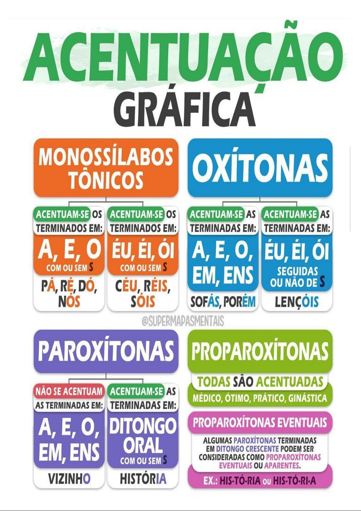 ACENTUACAO GRÁFICA" MONOSSÍLABOS TÔNICOS OXÍTONAS ACENTUAM-SE ACENTUAM-SE ACENTUAM-SE AS ACENTUAM-SE AS TERMINADOS EM: TERMINADOS EM: TERMINADAS EM: TERMINADAS EM: A,E,O ÉU, ÓI ÉU, ÓI COM OU SEM S COM OU SEM S ENS SEGUIDAS PÁ, RÉ, DÓ, CÉU, RÉIS, OU NÃO DE S NOS SOIS SOFÁS, PORÉM LENÇÓIS @SUPERMAPASMENTAIS PAROXÍTONAS TODAS SÃO ACENTUADAS NÃO SE ACENTUAM ACENTUAM-SE AS MÉDICO, ÓTIMO, PRÁTICO, GINÁSTICA AS TERMINADAS EM: TERMINADAS EM: DITONGO PROPAROXÍTONAS EVENTUAIS EM, ENS ORAL ALGUMAS TERMINADAS EM DITONGO CRESCENTE PODEM SER COM OU SEM S CONSIDERADAS COMO EVENTUAIS OU APARENTES. VIZINHO HISTÓRIA EX.: HIS-TÓ-RIA OU HIS-TÓ-RI-ATIPOS DE SUJEITO SUJEITO SIMPLES UM NÚCLEO DETERMINADO MUITOS FATOS ESTRANHOS OCORRIAM ALI. SUJEITO QUE EXISTE COMPOSTO MAIS DE UM NÚCLEO E PODE SER IDENTIFICADO MÚSICA E LITERATURA FAZEM BEM À ALMA. @SUPERMAPASMENTAIS NÃO ESTÁ EXPLÍCITO, OCULTO MAS PODE SER IDENTIFICADO SUJEITO GOSTO DE ESTUDAR. SUJEITO = EU INDETERMINADO VERBO NA VERBO NA 3° PESSOA DO 3° PESSOA DO SUJEITO QUE EXISTE, MAS PLURAL SINGULAR + "SE" NÃO PODE SER IDENTIFICADO FALARAM DE VOCÊ. ACORDA-SE FELIZ. VERBO "HAVER" NO SENTIDO DE SUJEITO EXISTIR, OCORRER OU TEMPO DECORRIDO HAVIA PESSOAS. / HÁ DEZ ANOS. INEXISTENTE VERBOS "SER", "ESTAR" E "FAZER" INDICANDO TEMPO, ESTADO OU FEN. METEOROLOGICO SÃO DUAS HORAS. / FAZ DOIS ANOS. / ESTÁ CALOR. ORAÇÃO SEM SUJEITO FENÔMENOS DA NATUREZA SUJEITO NÃO EXISTE ONTEM CHOVEU BASTANTE.GUIA PARA IDENTIFICAR OS TEMPOS VERBAIS @SUPERMAPASMENTAIS MODO INDICATIVO (CERTEZA) PRESENTE PRETÉRITO PRETÉRITO IMPERFEITO PERFEITO INDICA AÇÃO HABITUAL OU QUE OCORRE USE AS DESINÊNCIAS PARA IDENTIFICAR, INSIRA NO MOMENTO DA FALA OU "-IA" o ADVÉRBIO "ONTEM" EU ESTUDO EU ESTUDAVA ONTEM EU CANTEI ELE PERMITE ELE VENDIA ONTEM ELE VENDEU PRETÉRITO FUTURO DO FUTURO DO MAIS-QUE-PERFEITO PRESENTE PRETERITO DESINÊNCIA ÁTONA DESINÊNCIA TÔNICA "-RÁ" USE A DESINÊNCIA "-RIA" (NA SEGUNDA PESSOA DO PLURAL, (EM ALGUMAS PESSOAS DO DISCUR- (NA SEGUNDA PESSOA DO PLURAL, VARIA PRA "-RE") VARIA PRA "-RE") VARIA PRA "-RIE") EU ESTUDARA EU ESTUDAREI EU ESTUDARIA VÓS ESTUDÁREIS ELE ESTUDARA TU ESTUDARIAS MODO SUBJUNTIVO (DÚVIDA OU HIPÓTESE) PRESENTE PRETÉRITO FUTURO IMPERFEITO PARA IDENTIFICAR, INSIRA PARA IDENTIFICAR, INSIRA ADVÉRBIO "TALVEZ" PARA IDENTIFICAR, INSIRA A CONJUNÇÃO "QUANDO" ANTES DESTE TEMPO VERBAL A CONJUNÇÃO "SE" ANTES DESTE TEMPO VERBAL TALVEZ EU ESTUDE SE EU ESTUDASSE QUANDO EU ESTUDAR TALVEZ ELE CANTE SE VÓS ESTUDÁSSEIS QUANDO TU VENDERESGUIA DEFINITIVO PARA USO DOS PORQUES ? EQUIVALE A "POIS" PORQUE PASSEI PORQUE ESTUDEI. ? PASSEI POIS ESTUDEI. ? 1 EQUIVALE A "POR QUAL MOTIVO" POR QUE POR QUE VOCÊ FOI EMBORA? POR QUAL MOTIVO VOCÊ FOI EMBORA? ? 2 EQUIVALE A "PELO QUAL" SIGA: ESTE É CAMINHO POR QUE PASSEI. @SUPERMAPASMENTAIS ESTE É CAMINHO PELO QUAL PASSEI. ? PORQUÊ EQUIVALE A "MOTIVO" ANTECEDIDO POR UM DETERMINANTE. EX.: ? NÃO SEI PORQUÊ DE SUA DEMORA. NÃO SEI MOTIVO DE SUA DEMORA. ? POR QUÊ UTILIZADO EM FINAL DE FRASE BRIGOU DE NOVO, POR QUÊ? ? ELE ESTAVA NERVOSO. NÃO SEI POR ALGUNS GRAMÁTICOS REGISTRAM USO DO "POR NO INTERIOR DA FRASE, QUANDO ANTECEDE UMA PONTO E VÍRGULA OU RETICÊNCIAS. EX.: EU NÃO SEI POR QUÊ, MAS ELE NÃO RETORNOU MEU CHAMADO.NÃO ERRE MAIS! @SUPERMAPASMENTAIS MAL BEM MAL ÉO OPOSTO DE BEM MAU BOM MAU É OPOSTO DE BOM AM X ÃO MAS X MAIS EQUIVALE A OPOSTO DE PASSADO FUTURO PORÉM MENOS ONTEM ELES AMANHÃ ELES ESTUDEI, MAS PRECISAMOS DE ESTUDARAM. ESTUDARÃO. TIREI ZERO. MAIS AMOR. ONDE X AONDE IDEIA DE LUGAR FIXO IDEIA DE MOVIMENTO ONDE VOCÊ ESTÁ? AONDE VOCÊ VAI?PODER DA VIRGULA PODE MUDAR UMA PODE CONDENAR OPINIÃO OU SALVAR NÃO QUEREMOS SABER. NÃO TENHA CLEMÊNCIA! NÃO, QUEREMOS SABER. NÃO, TENHA CLEMÊNCIA! , PODE CRIAR HERÓIS PODE SER A SOLUÇÃO ISSO SÓ, ELE RESOLVE. ACABOU, NADA FOI RESOLVIDO. ISSO SÓ ELE RESOLVE. ACABOU NADA, FOI RESOLVIDO. PODE ACUSAR SEM ELA, A PESSOA ERRADA VOCÊ VIRA CANIBAL ESSE, JUIZ, É CORRUPTO. VOU ALI COMER, GENTE. ESSE JUIZ É CORRUPTO. VOU ALI COMER GENTE.CLASSES DE PALAVRAS SUBSTANTIVO ADJETIVO Nomes em geral. Exemplo: Características dos Pedro comprou uma bola substantivos. Exemplo: no Rio de Janeiro. A casa é bonita e ampla. PRONOME VERBO Representação do Ação, estado e fenômeno substantivo. Exemplo: da natureza. Exemplo: Ele comprou-a ontem. Sorrir e ser feliz! ARTIGO NUMERAL Determinante. Exemplo: Quantidade e enumeração. Esta é a viagem. Não é Exemplo: Dois gatos brincam uma viagem qualquer. no primeiro andar. CONJUNÇÃO PREPOSIÇÃO Conecta orações. Exemplo: Liga termos. Exemplo: Ela gosta de nadar e correr, Vou com você até mas não me disse. jardim amanhã. ADVÉRBIO INTERJEIÇÃO Exprime circunstâncias. Exprime emoções. Exemplo: Exemplo: Hoje quero Viva! Bravo! Essa peça sair rapidamente. teatral foi excelente.TIPOS DE SUJEITO Simples Composto Apresenta apenas um Apresenta dois ou mais núcleo do sujeito núcleos do sujeito O vizinho está chamando Camila e Lorena são amigas ? Determinado Indeterminado É aquele sujeito que pode Faz referência a alguém ou ser identificado algo, mas não identifica Rita disse que vai chover Disseram que vai chover Inexistente Oculto Oração sem sujeito, Não está mas acompanhada por um pode ser identificado pelo verbo impessoal contexto ou forma verbal Há muita gente na praia Estamos alegres (nós)REGRAS DE NA ESCOLA USE AS PALAVRINHAS MÁGICAS 1 POR FAVOR, OBRIGADO, DESCULPE E COM LICENÇA 2 RESPEITE AS PESSOAS 3 CUIDE DA SALA E DO MATERIAL 4 FALE BAIXO E NÃO CORRA NOS CORREDORES 5 SEJA PARTICIPATIVO NA SALA DE AULAADVÉRBIOS Classe de palavras que acompanha verbos, adjetivos ou outros advérbios Acrescentando-lhes características ou intensificando O seu sentido De lugar De tempo De modo perto, longe, hoje, nunca, rápido, bem, aqui, fora cedo, tarde devagar, mal ? De dúvida De afirmação De negação talvez, quiçá, sim, certo, negativo, porventura claro, 