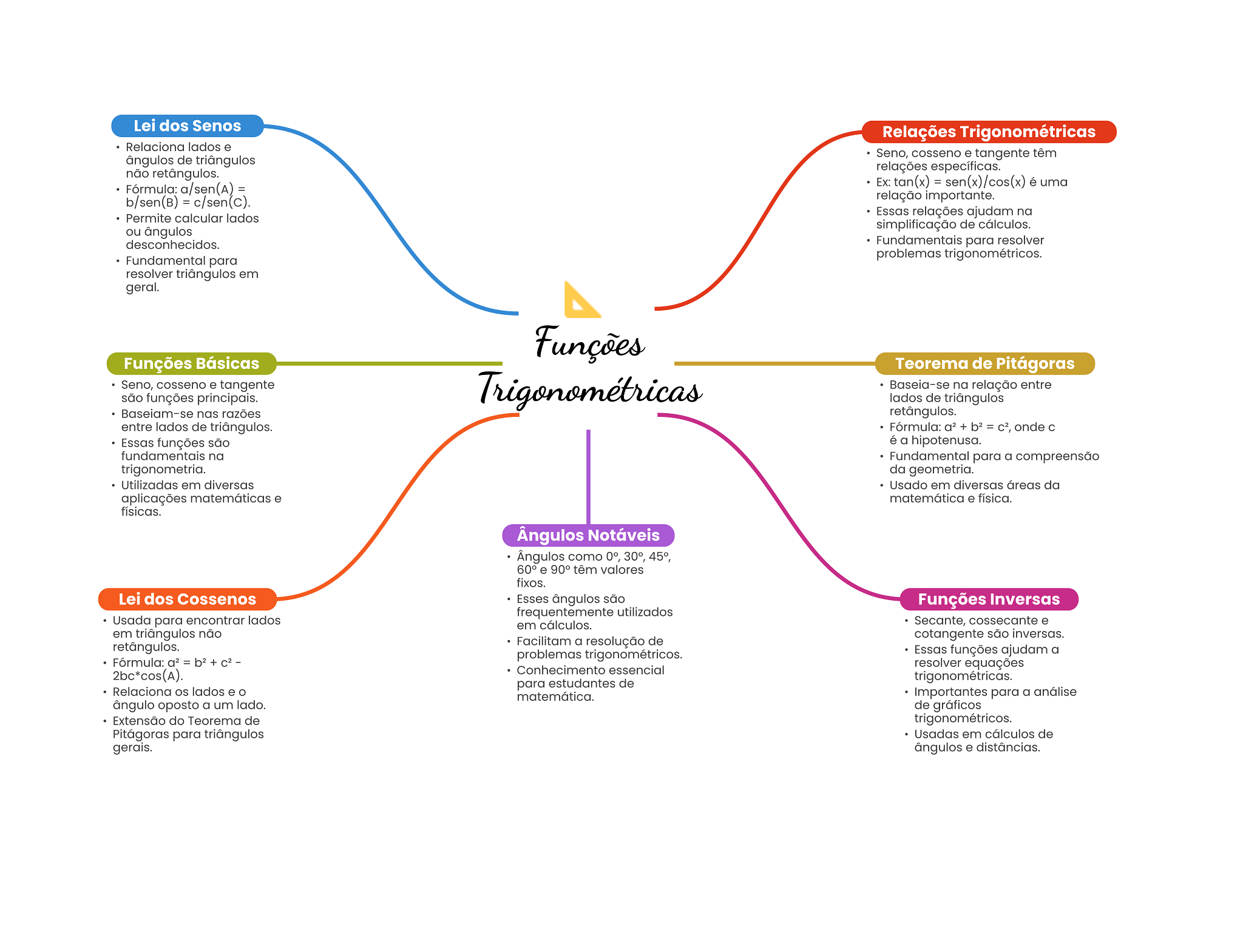 Lei dos Senos Relações Trigonométricas Relaciona lados e ângulos de triângulos Seno, cosseno e tangente têm relações específicas. não retângulos. Fórmula: a/sen(A) = Ex: tan(x) = sen(x)/cos(x) é uma b/sen(B) = relação importante. Permite calcular lados Essas relações ajudam na simplificação de cálculos. ou ângulos desconhecidos. Fundamentais para resolver problemas trigonométricos. Fundamental para resolver triângulos em geral. Funções Funções Básicas Teorema de Pitágoras Seno, cosseno e tangente são funções principais. Trigonométricas Baseia-se na relação entre lados de triângulos Baseiam-se nas razões retângulos. entre lados de triângulos. Fórmula: + = onde C Essas funções são é a hipotenusa. fundamentais na Fundamental para a compreensão trigonometria. da geometria. Utilizadas em diversas Usado em diversas áreas da aplicações matemáticas e matemática e física. físicas. Notáveis Ângulos como 30°, 45°, 60° e 90° têm valores fixos. Lei dos Cossenos Esses ângulos são Funções Inversas frequentemente utilizados Usada para encontrar lados em cálculos. Secante, cossecante e em triângulos não cotangente são inversas. retângulos. Facilitam a resolução de problemas trigonométricos. Essas funções ajudam a Fórmula: = + resolver equações 2bc*cos(A). Conhecimento essencial trigonométricas. para estudantes de Relaciona lados e matemática. Importantes para a análise ângulo oposto a um lado. de gráficos Extensão do Teorema de trigonométricos. Pitágoras para triângulos Usadas em cálculos de gerais. ângulos e distâncias.