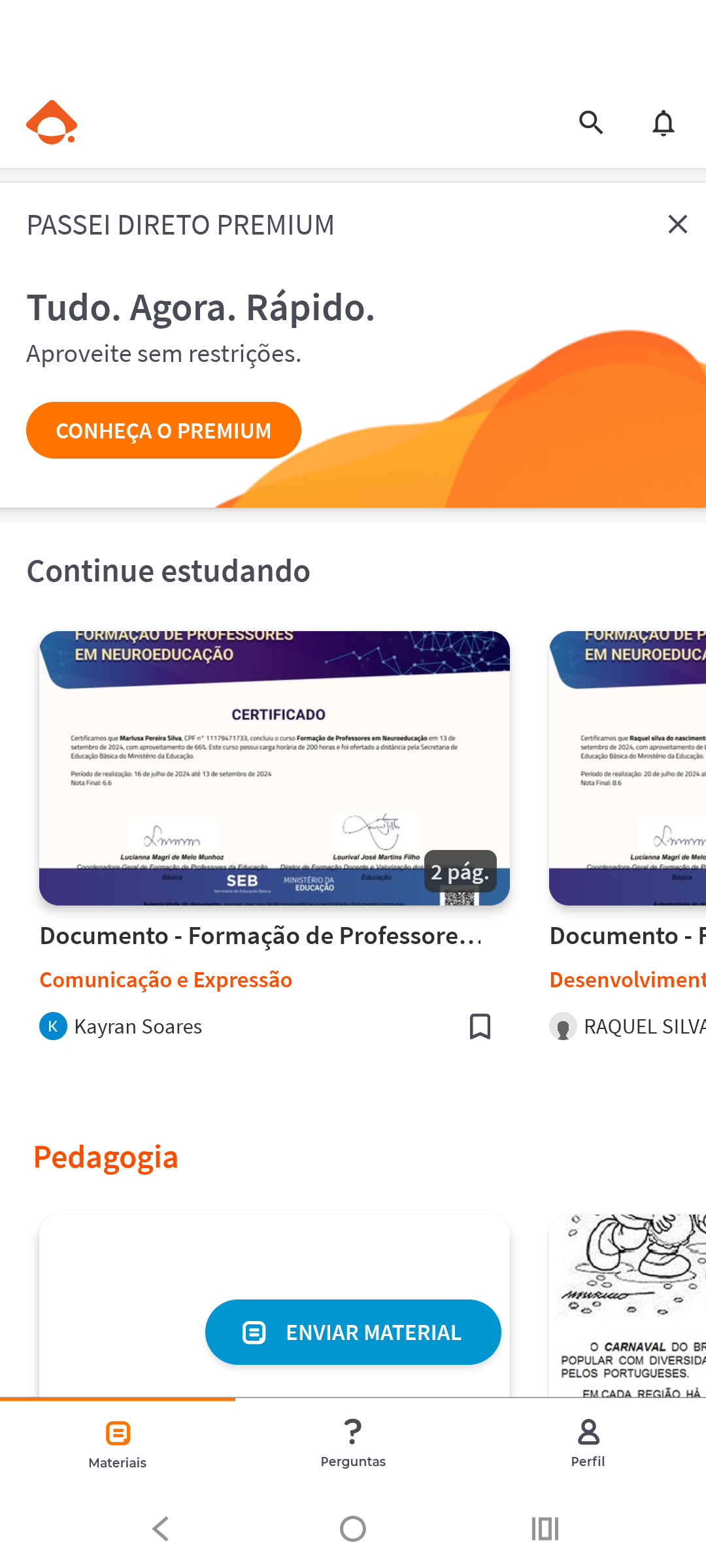 PASSEI DIRETO PREMIUM X Tudo. Agora. Rápido. Aproveite sem restrições. CONHEÇA PREMIUM Continue estudando FORMAÇÃO DE PROFESSORES FORMAÇÃO DE EM NEUROEDUCAÇÃO EM NEUROEDUCA CERTIFICADO Certificamos que Marlusa Pereira Silva CPF concluiu curso Formação de Professores em Neuroeducação em Certificamos que Raquel silva do nascimento setembro de com aproveitamento de 66% Este curso possui carga de 200 horas foi ofertado pela Secretaria de setembro de com aproveitamento de Educação Básica do Ministério da Educação Básica do Ministério da de realização: 16 de de 2024 até 13 de setembro de 2024 Periodo de 20 de de 2024 Nota Final 6.6 Nota Lucianna Magri de Melo Munhoz Lourival José Martins Filho Lucianna Magri de Melo Básica SEB MINISTÉRIO DA Educação 2 pág. Básica EDUCAÇÃO Documento - Formação de Professore... Documento - F Comunicação e Expressão Desenvolviment K Kayran Soares RAQUEL SILVA Pedagogia : 0 ENVIAR MATERIAL CARNAVAL DO BR POPULAR COM DIVERSIDA PELOS PORTUGUESES. EM CADA REGIÃO HÁ ? 8 Materiais Perguntas Perfil