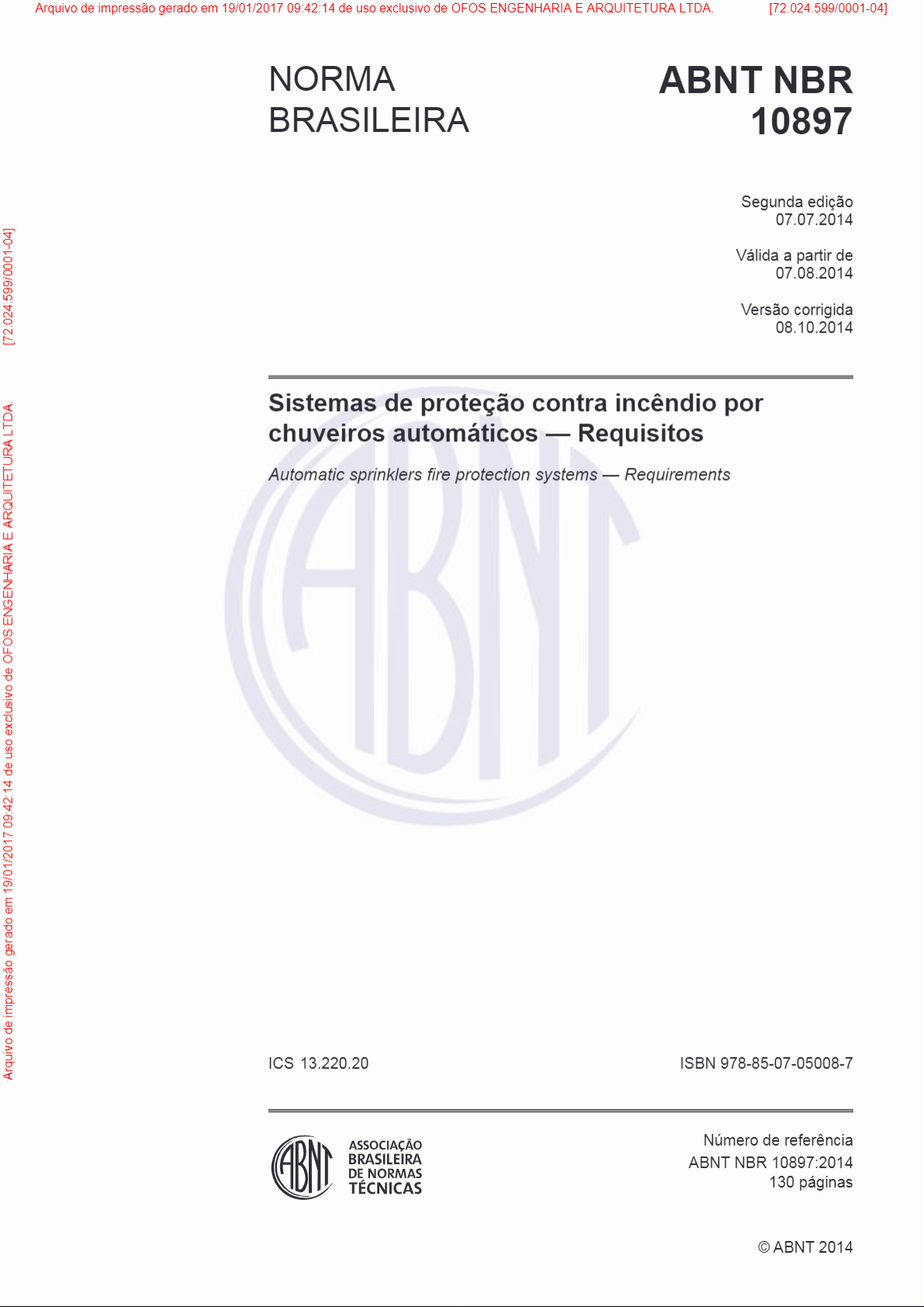 Arquivo de impressão gerado em 19/01/2017 09:42:14 de uso exclusivo de OFOS ENGENHARIA E ARQUITETURA LTDA. [72.024.599/0001-04] NORMA ABNT NBR BRASILEIRA 10897 Segunda edição 07.07.2014 [72.024.599/0001-04] Válida a partir de 07.08.2014 Versão corrigida 08.10.2014 Sistemas de proteção contra incêndio por chuveiros automáticos Requisitos Automatic sprinklers fire protection systems Requirements Arquivo de impressão gerado em 19/01/2017 09:42:14 de uso exclusivo de OFOS ENGENHARIA E ARQUITETURA LTDA. ICS 13.220.20 ISBN 978-85-07-05008-7 ASSOCIAÇÃO Número de referência BRASILEIRA ABNT NBR 10897:2014 DE NORMAS TÉCNICAS 130 páginas © ABNT 2014Arquivo de impressão gerado em 19/01/2017 09:42:14 de uso exclusivo de OFOS ENGENHARIA E ARQUITETURA LTDA. [72.024.599/0001-04] ABNT NBR 10897:2014 [72.024.599/0001-04] Arquivo de impressão gerado em 19/01/2017 09:42:14 de uso exclusivo de OFOS ENGENHARIA E ARQUITETURA LTDA. © ABNT 2014 Todos direitos reservados. A menos que especificado de outro modo, nenhuma parte desta publicação pode ser reproduzida ou utilizada por qualquer meio, eletrônico ou mecânico, incluindo fotocópia e microfilme, sem permissão por escrito da ABNT. ABNT Av.Treze de Maio, 13 28° andar 20031-901 Rio de Janeiro - - RJ Tel.: + 55 21 3974-2300 Fax: + 55 21 3974-2346 abnt@abnt.org.br www.abnt.org.br ii © ABNT 2014 Todos os direitos reservadosArquivo de impressão gerado em 19/01/2017 09:42:14 de uso exclusivo de OFOS ENGENHARIA E ARQUITETURA LTDA. [72.024.599/0001-04] ABNT NBR 10897:2014 Sumário Página Prefácio viii 1 Escopo 1 [72.024.599/0001-04] 2 Referências normativas 1 3 Termos e definições 3 4 Ocupações 9 4.1 Ocupações de risco leve 9 4.2 Ocupações de risco ordinário 9 4.2.1 Grupo 9 4.2.2 Grupo 9 4.3 Ocupações de risco extra ou extraordinário 10 4.3.1 Grupo 10 4.3.2 Grupo II 10 4.4 Áreas de armazenamento 10 5 Materiais e componentes 10 Arquivo de impressão gerado em 19/01/2017 09:42:14 de uso exclusivo de OFOS ENGENHARIA E ARQUITETURA LTDA. 5.1 Generalidades 10 5.2 Chuveiros automáticos 10 5.2.1 Generalidades 10 5.2.2 Fator de descarga 10 5.2.3 Temperatura 11 5.2.4 Revestimentos especiais 12 5.2.5 Canoplas e invólucros 12 5.2.6 Proteções 12 5.2.7 Estoque de chuveiros automáticos sobressalentes 12 5.3 Tubos de condução não enterrados 13 5.3.1 Generalidades 13 5.3.2 Tubos de aço 13 5.3.3 Tubos de cobre 14 5.3.4 Tubos de CPVC 14 5.3.5 Outros tipos de materiais 14 5.3.6 Dobramento em tubos de condução 14 5.4 Tubos de condução enterrados 14 5.5 Conexões 14 5.6 Válvulas 16 5.7 Conexões de teste de alarme 17 5.7.1 Edificações térreas 17 5.7.2 Edificações de múltiplos pavimentos 17 5.7.3 Sistemas de ação prévia 18 5.7.4 Sistemas de dilúvio 18 5.8 Tomada (conexão) de recalque para uso exclusivo do Corpo de Bombeiros 18 5.9 Alarmes de fluxo de água 20 5.10 Suportes 21 © ABNT 2014 - Todos os direitos reservados iiiArquivo de impressão gerado em 19/01/2017 09:42:14 de uso exclusivo de OFOS ENGENHARIA E ARQUITETURA LTDA. [72.024.599/0001-04] ABNT NBR 10897:2014 6 Requisitos dos sistemas 27 6.1 Sistemas de tubo molhado 27 6.1.1 Manômetros 27 6.1.2 Válvulas de alívio 28 [72.024.599/0001-04] 6.1.3 Sistemas auxiliares 28 6.2 Sistemas de ação prévia e sistemas de dilúvio 28 6.2.1 Válvula automática de controle 28 6.2.2 Manômetros 28 6.2.3 Detecção 28 6.2.4 Localização e proteção de válvulas de controle do sistema 28 6.2.5 Sistemas de ação prévia 28 6.2.6 Sistemas de dilúvio 30 7 Requisitos de instalação 30 7.1 Generalidades 30 7.2 Restrições de uso 30 7.3 Áreas máximas de proteção 31 Arquivo de impressão gerado em 19/01/2017 09:42:14 de uso exclusivo de OFOS ENGENHARIA E ARQUITETURA LTDA. 7.4 Temperatura 31 7.5 Sensibilidade térmica (velocidade de resposta) 32 7.6 Área de cobertura por chuveiro automático 32 7.6.1 Determinação da área de cobertura 32 7.6.2 Área máxima de cobertura 34 7.7 Espaçamento de chuveiros automáticos 37 7.7.1 Distância máxima entre chuveiros automáticos 37 7.7.2 Distância máxima do chuveiro automático à parede 38 7.7.3 Distância mínima de chuveiros automáticos à parede 39 7.7.4 Distância mínima entre chuveiros automáticos 40 7.8 Distância entre defletor e tetos/forros 41 7.8.1 Distância entre tetos/forros e defletor de chuveiros automáticos tipo spray em pé e pendentes de cobertura padrão e cobertura estendida 41 7.8.2 Distância entre tetos/forros e defletor de chuveiros automáticos tipo spray laterais de cobertura padrão 46 7.8.3 Distância entre tetos/forros e defletor de chuveiros automáticos de controle para área específica (CCAE) 47 7.8.4 Distância entre tetos/forros e defletor de chuveiros ESFR 47 7.9 Orientação do defletor 47 7.9.1 Orientação do defletor de chuveiros automáticos tipo spray em pé e pendentes de cobertura padrão e cobertura estendida 47 7.9.2 Orientação do defletor de chuveiros automáticos tipo spray laterais de cobertura padrão 47 7.9.3 Orientação do defletor de chuveiros automáticos de controle para aplicação específica (CCAE) 48 7.9.4 Orientação do defletor de chuveiros automáticos ESFR 48 7.10 Obstruções à descarga 48 iv © ABNT 2014 Todos os direitos reservadosArquivo de impressão gerado em 19/01/2017 09:42:14 de uso exclusivo de OFOS ENGENHARIA E ARQUITETURA LTDA. [72.024.599/0001-04] ABNT NBR 10897:2014 7.10.1 Obstruções à descarga dos chuveiros automáticos tipo spray em pé e pendentes de cobertura padrão e cobertura estendida 48 7.10.2 Obstruções à descarga dos chuveiros automáticos tipo spray laterais de cobertura padrão 53 [72.024.599/0001-04] 7.10.3 Obstruções à descarga de chuveiros automáticos de controle para aplicações específicas (CCAE) 56 7.10.4 Obstruções à descarga de chuveiros automáticos ESFR 61 7.11 Distância mínima livre entre topo da estocagem e defletor 63 7.11.1 Distância mínima livre entre topo da estocagem e defletor de chuveiros em 