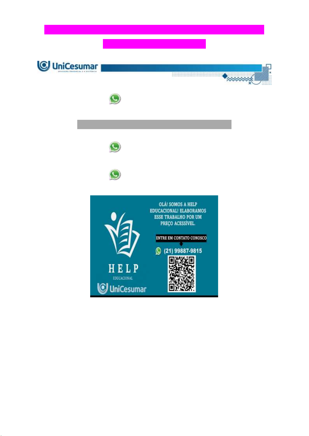 ATIVIDADE1 - ESTÁGIO SUPERVISIONADO DA LÍNGUA PORTUGUESA I - 51_2026 (21) 99887-9815 ASSESSORIA NOS SEUS TRABALHOS (21) 99887-9815 (21) 99887-9815 O Estágio Supervisionado em Língua Portuguesa I visa proporcionar a experiência de ensino no Ensino Fundamental (6º ao 9º ano), na disciplina de Língua Portuguesa. Durante o estágio, você deverá observar e ministrar aulas, além de elaborar e entregar um Plano de Aula. “Um plano de aula é um documento que detalha o conteúdo, as atividades, os recursos e as estratégias de ensino que serão utilizados pelo professor em uma aula específica”. ATIVIDADE1 - ESTÁGIO SUPERVISIONADO DA LÍNGUA PORTUGUESA I - 51_2026 Fonte: https://educamundo.com.br/blog/voce-conhece-a-diferenca-entre- plano-de-ensino-e-plano-de-aula-2-2/. Acesso em: 11 fev. 2025. Instruções para o Plano de Aula: Elabore o plano com base na turma do 6º ao 9º ano que foi escolhida para aplicação da regência. Siga as orientações do modelo disponível na pasta “Material da Disciplina”, na aula “Atividade 1 - Plano de aula” e no Mural de Avisos. O planejamento será um guia importante para suas aulas e para sua futura atuação docente. Orientações importantes: - A atividade deve ser entregue exclusivamente em Word; formatos como PDF não serão aceitos. - Envie a atividade em um único arquivo, conforme o modelo disponibilizado. - Leia atentamente todas as orientações do modelo e, em caso de dúvidas, consulte o professor mediador antes do envio. - Plágio resultará em zeramento da atividade. ATIVIDADE1 - ESTÁGIO SUPERVISIONADO DA LÍNGUA PORTUGUESA I - 51_2026 Atenção: - Envie apenas a versão final da atividade, confira após anexar, pois não será possível substituí-la após clicar em "Finalizar". - A IES não se responsabiliza por atividades não enviadas devido a problemas técnicos, falhas de comunicação ou outros fatores. 1234 OLÁ! SOMOS A HELP EDUCACIONAL! ELABORAMOS ESSE TRABALHO POR UM PREÇO ACESSÍVEL. ENTRE EM CONTATO CONOSCO (21) 99887-9815