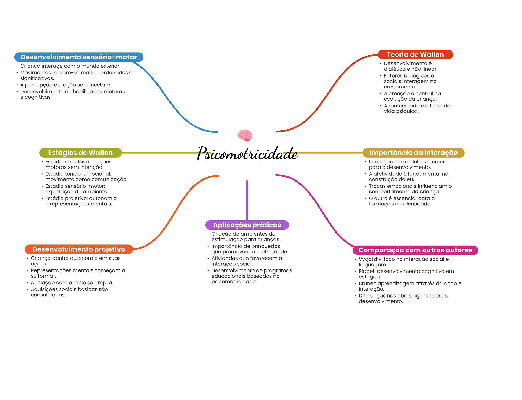 Desenvolvimento sensório-motor Teoria de Wallon Desenvolvimento é Criança interage com mundo exterior. dialético e não linear. Movimentos tornam-se mais coordenados e significativos. Fatores biológicos e sociais interagem no A percepção e a ação se conectam. crescimento. Desenvolvimento de habilidades motoras A emoção é central na e cognitivas. evolução da criança. A motricidade é a base da vida psíquica. Estágios de Wallon Psicomotricidade Importância da interação Estádio impulsivo: reações Interação com adultos é crucial motoras sem intenção. para desenvolvimento. Estádio A afetividade é fundamental na movimento como comunicação. construção do eu. Estádio sensório-motor: Trocas emocionais influenciam exploração do ambiente. comportamento da criança. Estádio projetivo: autonomia outro é essencial para a e representações mentais. formação da identidade. Aplicações práticas Criação de ambientes de estimulação para crianças. Desenvolvimento projetivo Importância de brinquedos que promovem a motricidade. Comparação com outros autores Criança ganha autonomia em suas Atividades que favorecem a Vygotsky: foco na interação social e ações. interação social. linguagem. Representações mentais começam a Desenvolvimento de programas Piaget: desenvolvimento cognitivo em se formar. educacionais baseados na estágios. A relação com meio se amplia. psicomotricidade. Bruner: aprendizagem através da ação e Aquisições sociais básicas são interação. consolidadas. Diferenças nas abordagens sobre O desenvolvimento.