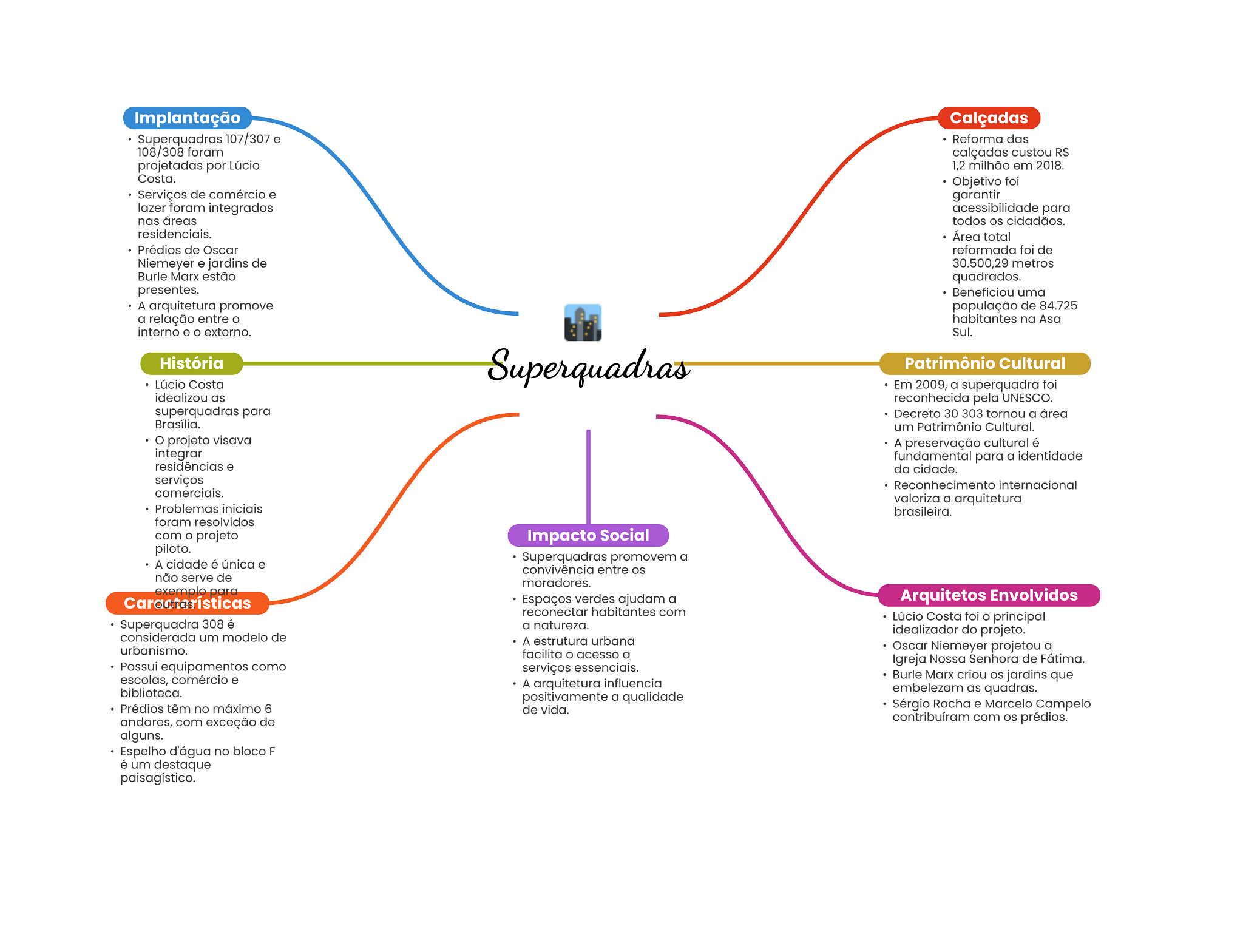 Implantação Calçadas Superquadras 107/307 e Reforma das 108/308 foram calçadas custou R$ projetadas por Lúcio 1,2 milhão em 2018. Costa. Objetivo foi Serviços de comércio e garantir lazer foram integrados acessibilidade para nas áreas todos cidadãos. residenciais. Área total Prédios de Oscar reformada foi de Niemeyer e jardins de 30.500,29 metros Burle Marx estão quadrados. presentes. Beneficiou uma A arquitetura promove população de 84.725 a relação entre habitantes na Asa interno e externo. Sul. História Superquadras Patrimônio Cultural Lúcio Costa Em 2009, a superquadra foi idealizou as reconhecida pela UNESCO. superquadras para Decreto tornou a área Brasília. um Patrimônio Cultural. projeto visava A preservação cultural é integrar fundamental para a identidade residências e da cidade. serviços Reconhecimento internacional comerciais. valoriza a arquitetura Problemas iniciais brasileira. foram resolvidos com O projeto Impacto Social piloto. Superquadras promovem a A cidade é única e convivência entre OS não serve de moradores. exemplo para Espaços verdes ajudam a Arquitetos Envolvidos reconectar habitantes com Lúcio Costa foi O principal Superquadra 308 é a natureza. idealizador do projeto. considerada um modelo de A estrutura urbana urbanismo. Oscar Niemeyer projetou a facilita acesso a Igreja Nossa Senhora de Fátima. Possui equipamentos como serviços essenciais. escolas, comércio e Burle Marx criou jardins que A arquitetura influencia biblioteca. embelezam as quadras. positivamente a qualidade Prédios têm no máximo 6 de vida. Sérgio Rocha e Marcelo Campelo andares, com exceção de contribuíram com OS prédios. alguns. Espelho d'água no bloco F é um destaque paisagístico.